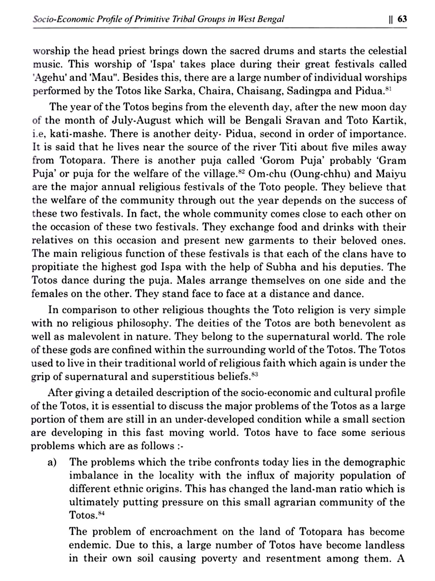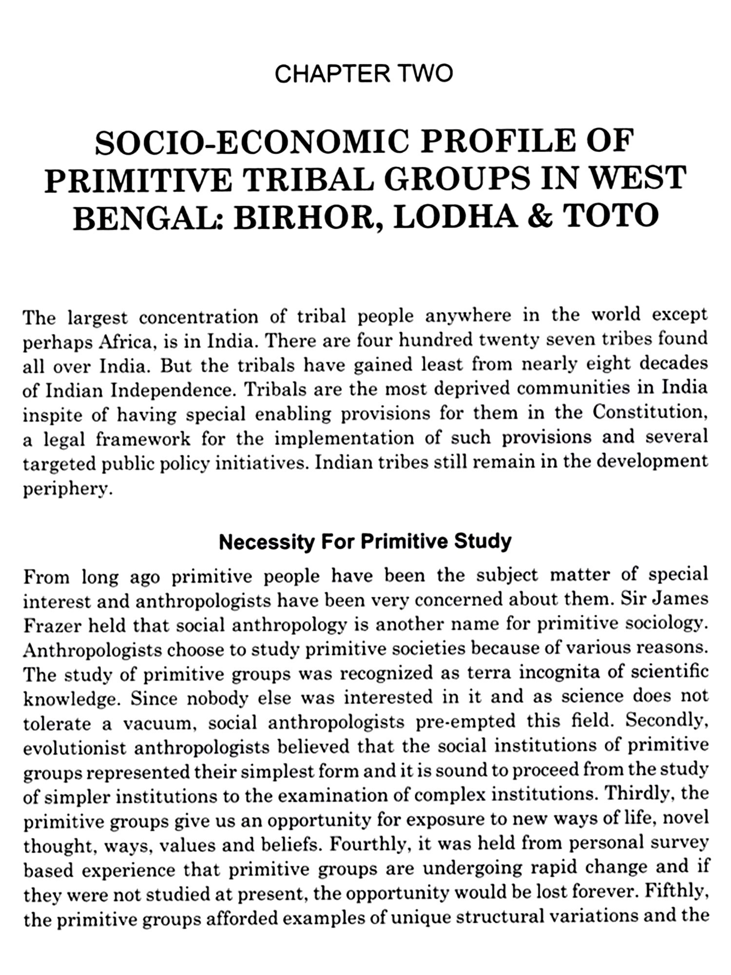The largest concentration of tribal people anywhere in the world except perhaps Africa is in India. In India, 705 (with overlapping communities in more than one State) ethnic groups are recognised as scheduled Tribes under article 342 of the Constitution of India. Among them 75 tribal communities have been specially identified as primitive tribes, In West Bengal, three tribes have been clearly identified as the primitive tribes namely (1) Birhor (2) Lodha (3) Toto. People of these three communities are mainly facing problems related to agriculture, land alienation, displacement, lack of communication, health and education. Since independence, government has given special attention for the development of the communities. Various plans and programmes have been taken by the government and non-government organisations for the development of the socio-economic status of these communities. So the main objective of the study is to analyses the prevailing conditions of the PTGs (primitive tribal groups), governmental initiatives and lastly the results of such programmes.