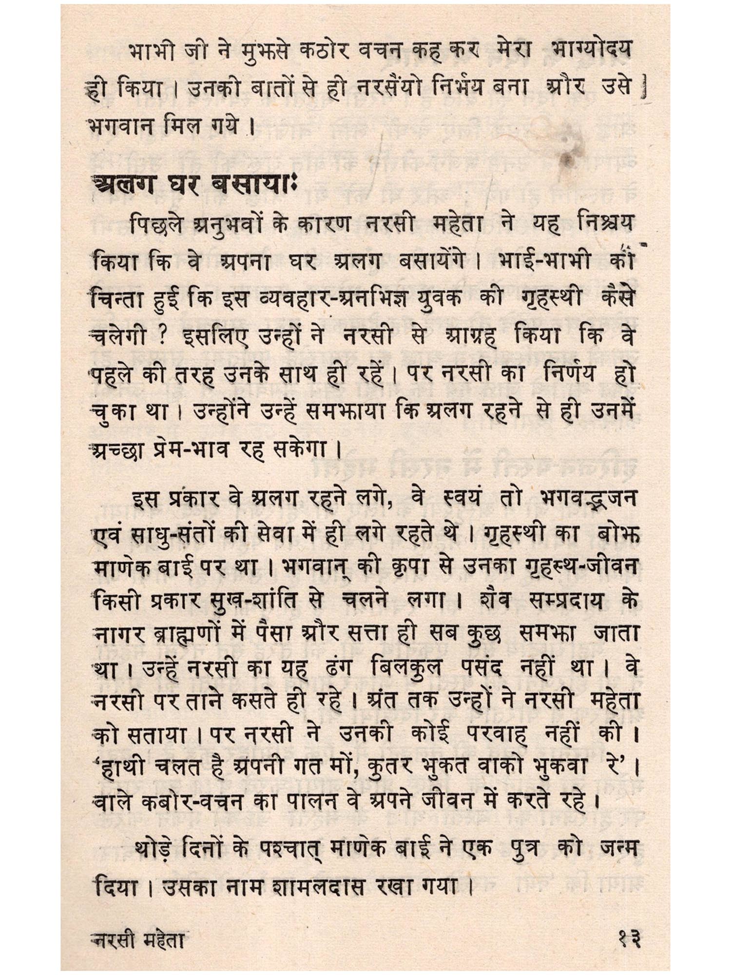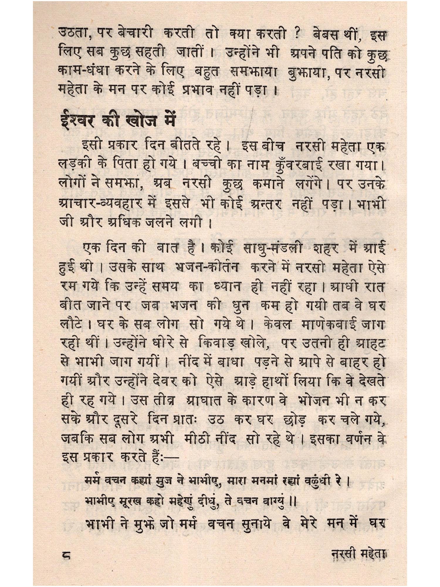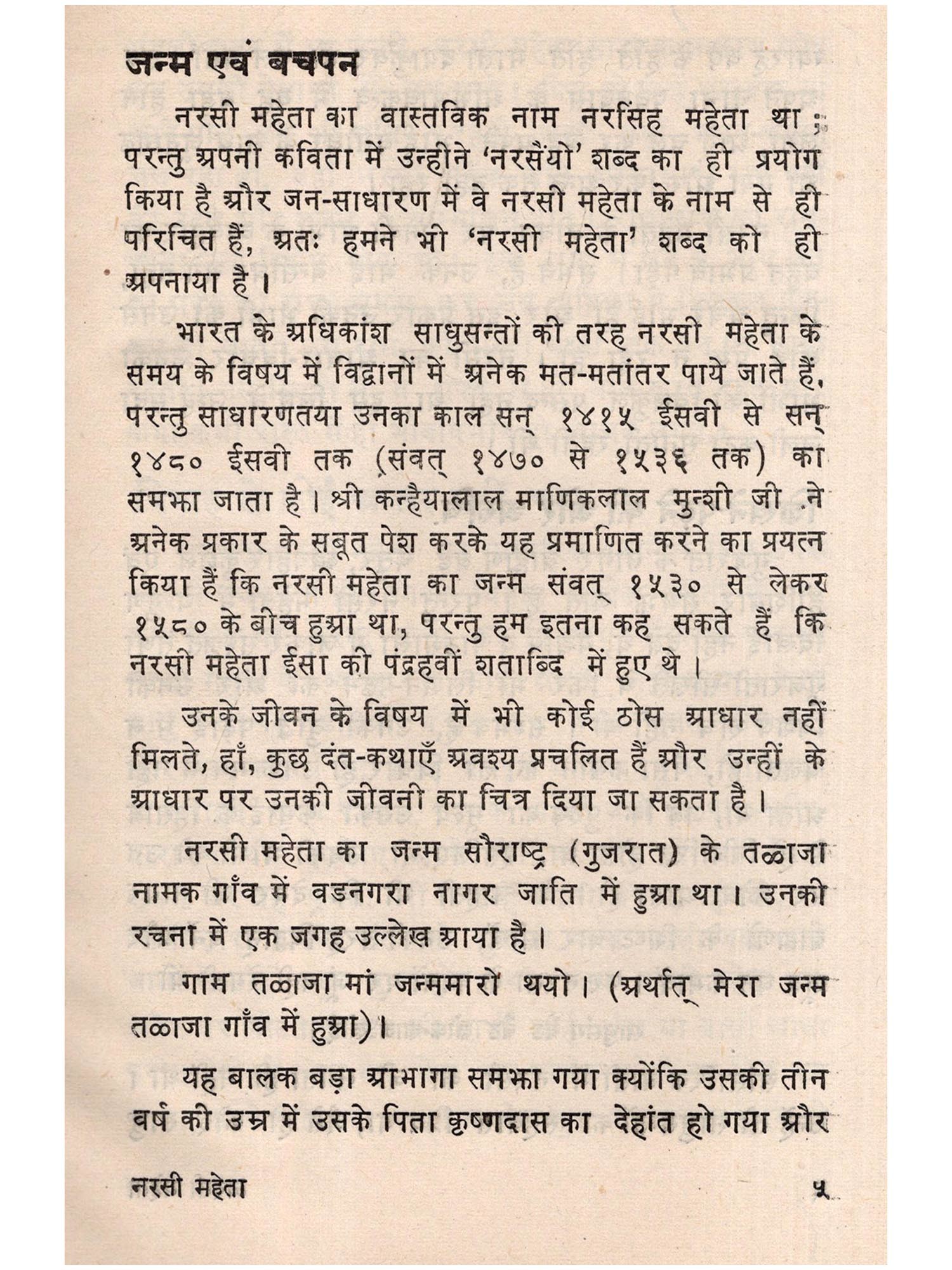 इसी गुजरात प्रांत में जन्म हुआ। शैशवकाल में भावज के हाथों काफी कष्ट और भक्ति के पूर्व-उपार्जित संस्कार जाग्रत हो उठे। उन्होंने हरिजन बस्ती में भी भजन-कीर्तन किया, जिससे तत्कालीन समाज क्षुब्ध हो उठा। परन्तु नरसी महेता अडिग रहे और अपना सारा जीवन समता के भाव के प्रचार तथा हरि-भजन में गुज़ार दिया । ईसवो १४१५ में नरसी महेता का ही अनाथ हो जाने के कारण इन्हें उठाने पड़े। जिनके कारण विरक्ति नरसो महेता की भक्ति-भाव पूर्ण रचनाएँ पर्याप्त संख्या में उपलब्ध हो रही हैं। उनका यह गीत महात्मा गाँधी को बहुत प्रिय था और इस गीत को भारत के सभी प्रान्तों में बड़े चाव से गाया जाता है-