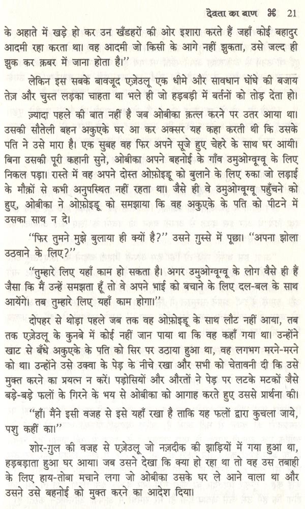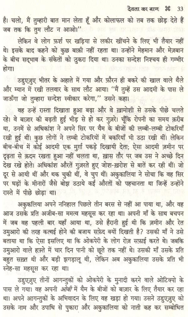 देवता का बाण के उत्साही प्रशंसक भी हैं और उतने ही गर्मा-गरम निन्दक भी। निन्दकों से और कुछ भी कहने की ज़रूरत नहीं। अलबत्ता प्रशंसकों के सामने मैं यही आशा व्यक्त कर सकता हूँ कि जो तब्दीलियाँ मैंने की हैं उनका वे अनुमोदन करेंगे। लेकिन चीज़ों की प्रकृति ऐसी है कि उनमें से कुछ अपने मूल प्रेम पर इतनी दृढ़ता से टिके रहेंगे कि वे इन परिवर्तनों को अकारण किये गये या गैर-ज़रूरी क़रार देंगे। परिवर्तन शायद कभी ज़रूरी या कारणवश किये गये नहीं माने जा सकते, लेकिन हम उन्हें करते रहते हैं। हमें कम-से-कम उन्हें सलाम करने के लिए तैयार रहना चाहिए जो दृढ़ता से अडिग रहते हैं, उस शानदार आदमी एजेउलू के आध्यात्मिक वंशज, इस आशा में कि वे हमें माफ़ कर देंगे। क्योंकि अगर वह बच गया होता तो वह अपनी क़िस्मत को पूरी तरह एक अभागे नायक की अपनी भव्य ऐतिहासिक नियति के समरूप पाता, अपने लोगों के पाला बदलने के पाप का प्रक्षालन अपनी वेदना से करता हुआ - इस तरह उस पाला बदलने को एक कर्मकाण्ड की प्रतिष्ठा देता हुआ। और उसमें उन्हें उसने उन्हें ख़ुशी से माफ़ कर दिया होता।