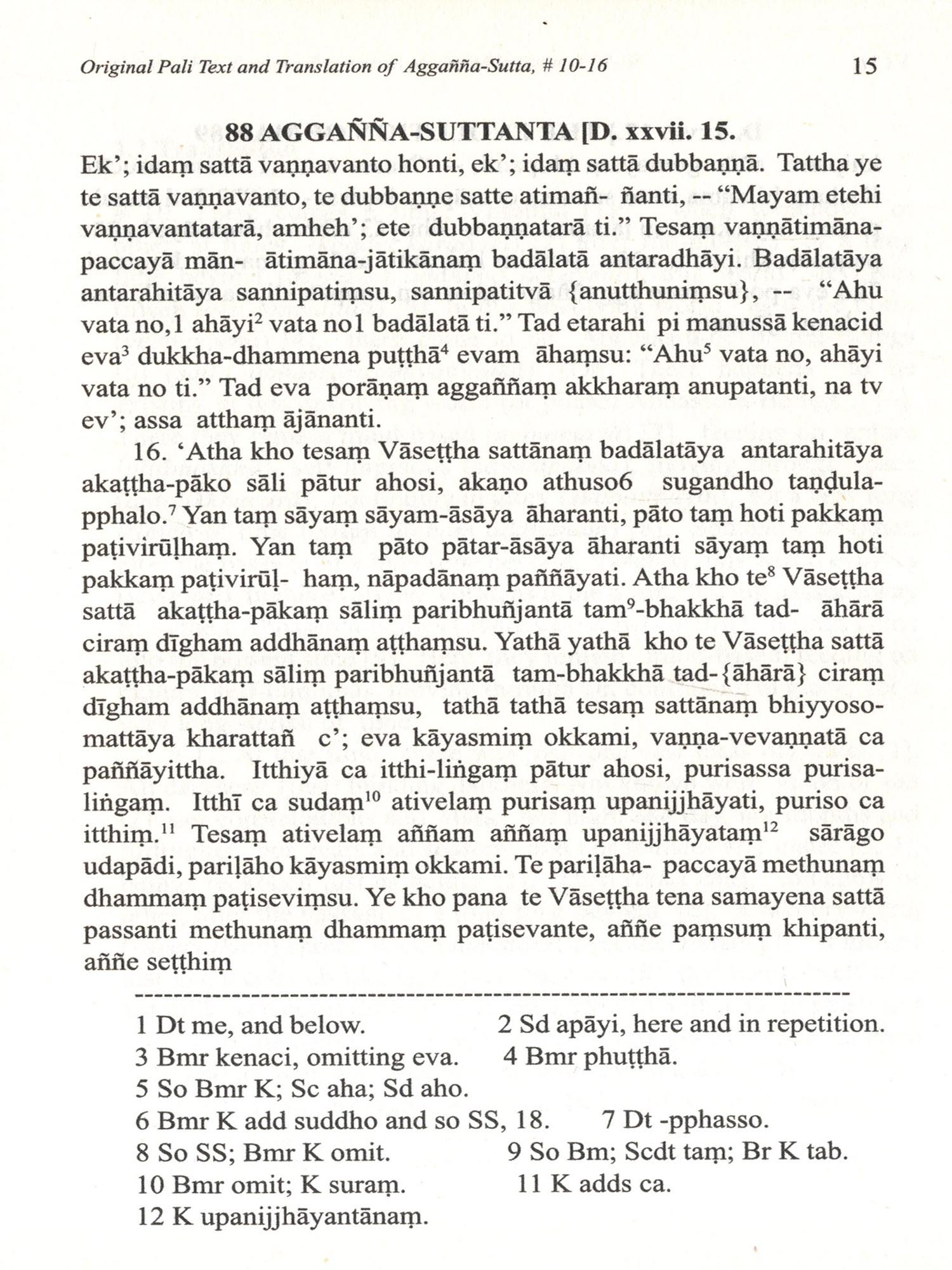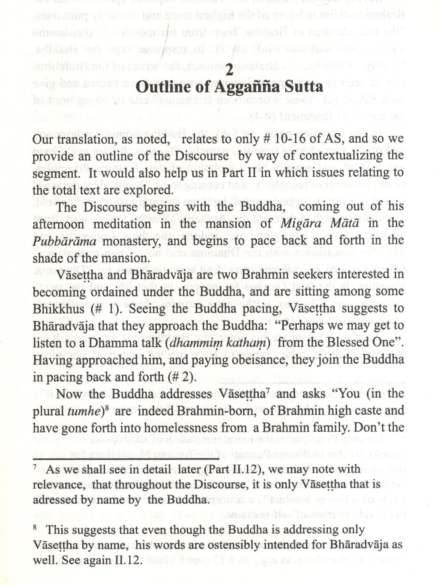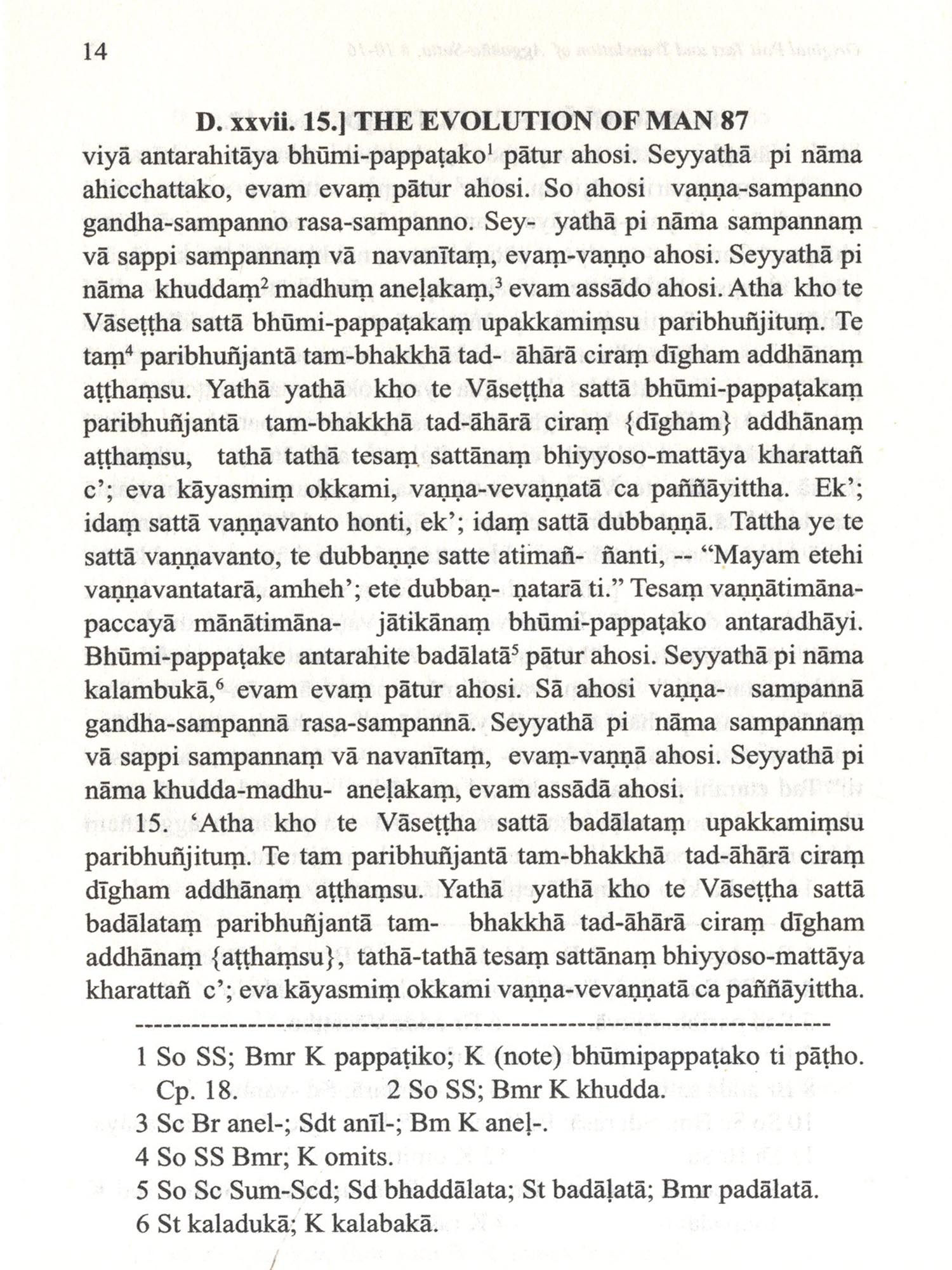 Whatever else might be said about the historical background and setting of the Agganna Sutta of the Digha Nikaya (3.80-98), the work presents one of the best known synopses of what purports to be Gotama Buddha's understanding of creation and evolution. It does so succinctly within the compass of just a few verses, and although there are somewhat parallel discussions of evolution elsewhere in the Pali Canon (e.g., Ambattha Sutta, D.1.88), the Agganna brings the topics of geological, biological, social and even political formations into one interesting analytical sweep.