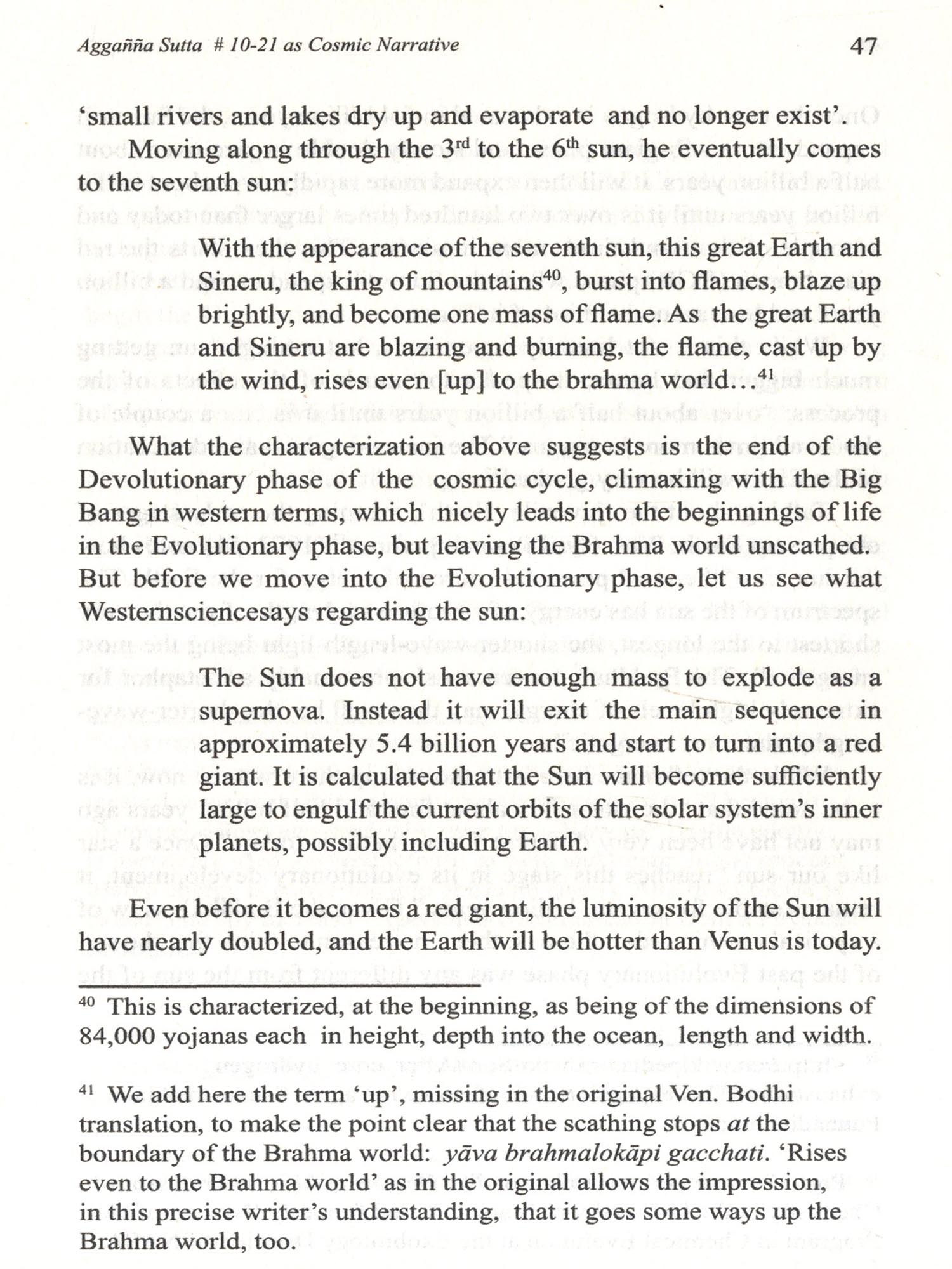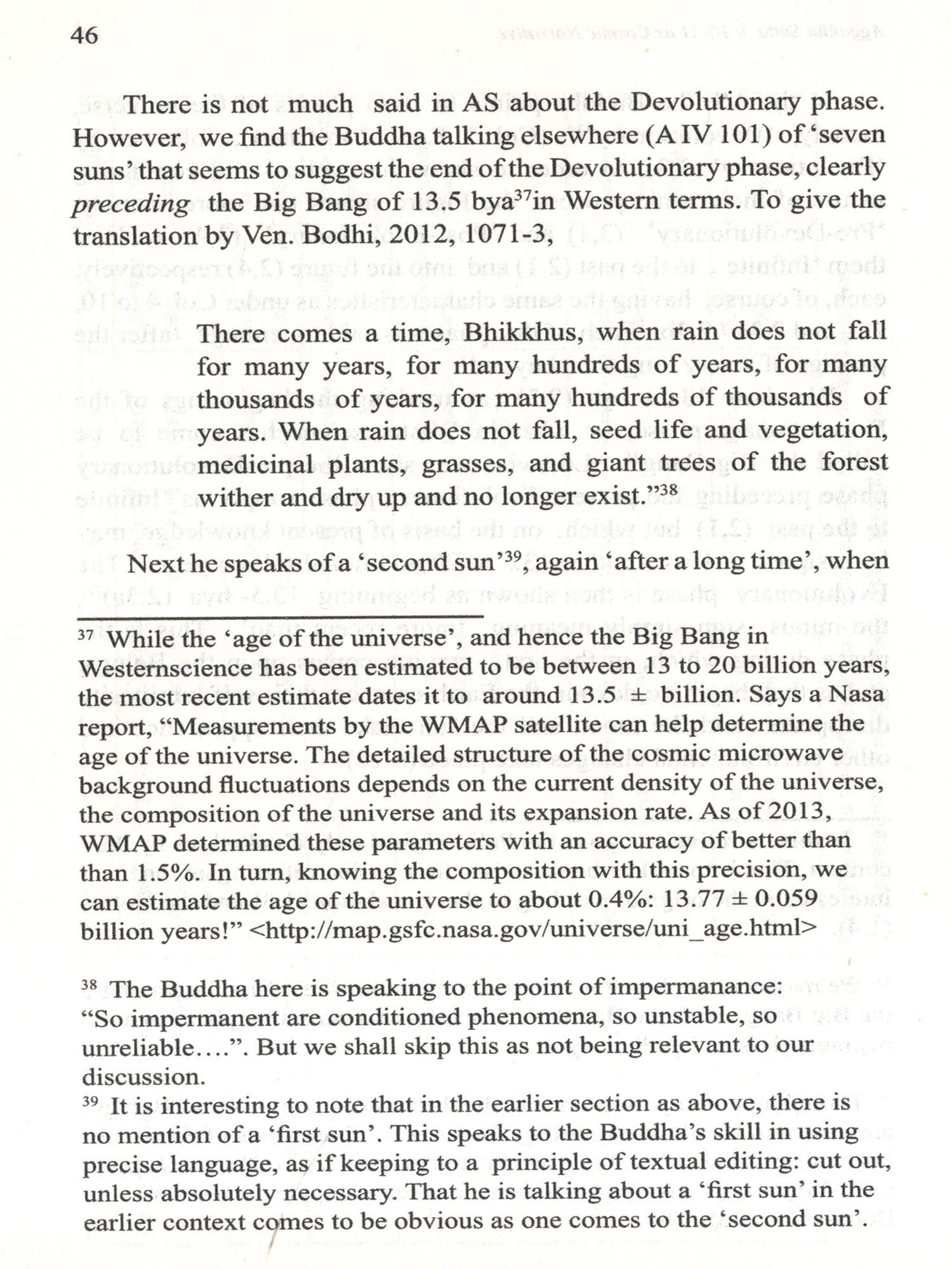 This is when I took a serious look at the agganna sutta. In the opening segment, the Buddha tells us of an Abhassara Being existing in the Devolutionary phase. So my first question to myself was who these Beings were. By definition, a Being has a consciousness; and so, in the text, they are 'mind-based'. But a consciousness cannot exist without a material body, given the characterization of sentience as 'mindbody' (namarupa). So how could we understand this material form? The traditional meaning of Abhassara Brahma was not of much help. This is when it hit me to step out of the box.