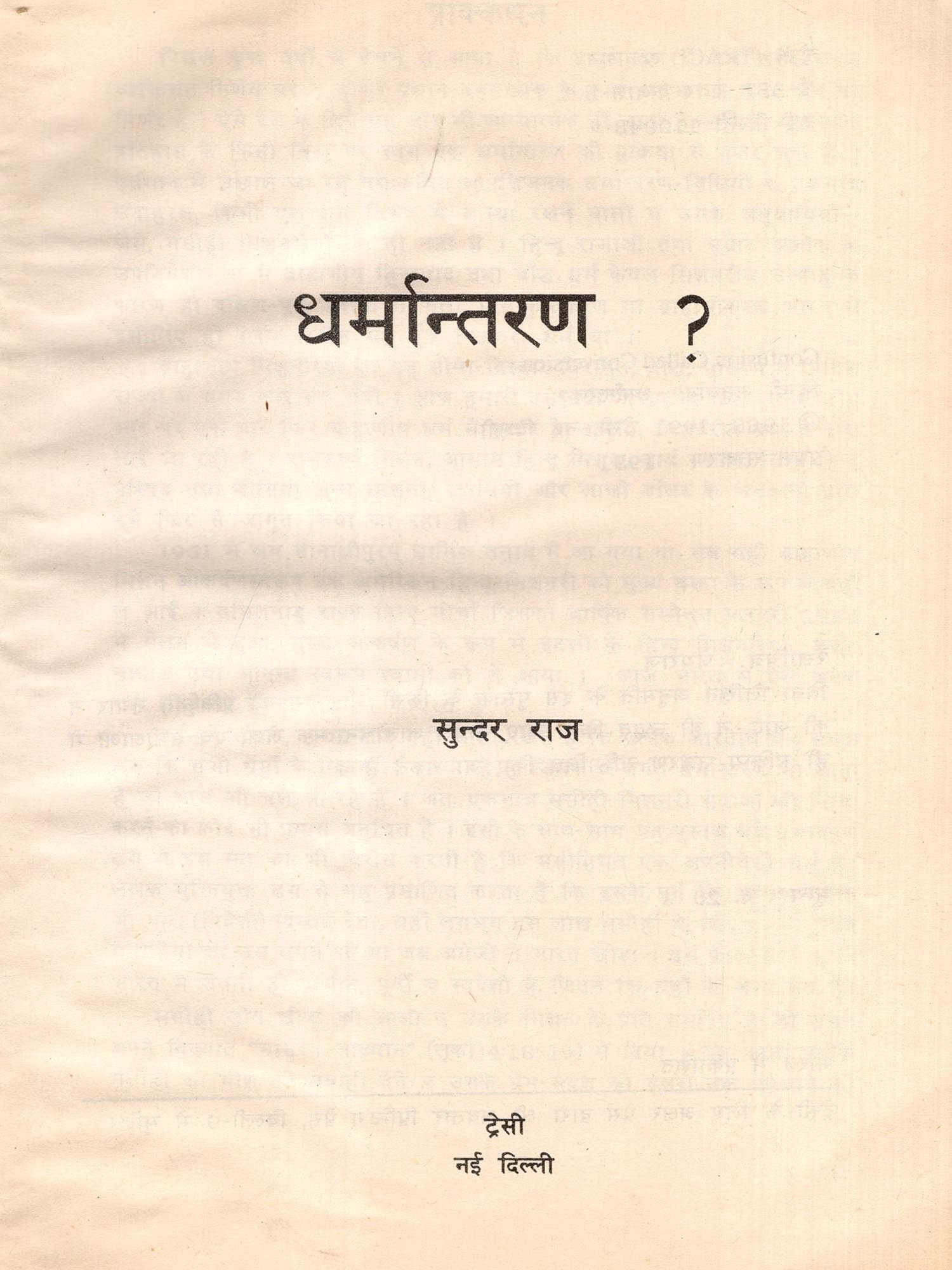 इसका अंग्रेजी शीर्षक "कन्फ्यूजन कॉल्ड कनवर्जन" इस पुस्तक का सारांश प्रस्तुत करता है। हिन्दी में अन्य समरूपी शीर्षक उचित नहीं थे। वर्तमान शीर्षक दिल्ली डायोसिस (सी. एन. आई.) के आदरणीय बिशप प्रीतम बी. सन्तराम द्वारा सुझाया गया शीर्षक है। मैं 'ट्रेसी' बोर्ड ऑफ गवरनर्स के सदस्यों तथा चेयरमैन, सी.बी. सैमुएल का, उनके इस प्रकाशन में पूर्ण सहयोग देने के लिये आभारी हूँ, विशेषतया रेव्ह. वलसन थम्पू का जिन्होंने आवरण पृष्ठ की कला-धारणा का सुधार किया। मैं रेव्ह, पार्सले, भाई इजीकिएल जोशुआ, रेव्ह. बी. पी. कच्छी, रेव्ह इम्मानुएल जॉर्ज व भाई विलसन का कृतज्ञ हूँ जिन्होंने इस प्रकाशन के प्रति निरन्तर उत्साह एवं सहयोग प्रदान किया, और 'ट्रेसी' स्टाफ का विशेषतया भाई एलेक्स जोजफ का जिन्होंने इस पुस्तक के अनुवाद व प्रकाशन के मुद्रण में सहयोग दिया । हिन्दी की छपाई का कार्य 'ट्रेसी' के लिए एक नया कार्य है, और में भाई बी.के. सिंह (इण्डिया बाइबल पब्लिशर्स, नयी दिल्ली) का आभारी हूँ जिन्होंने इस विषय में अपनी व्यावसायिक सम्मति देकर हमारा बड़ा उपकार किया ।