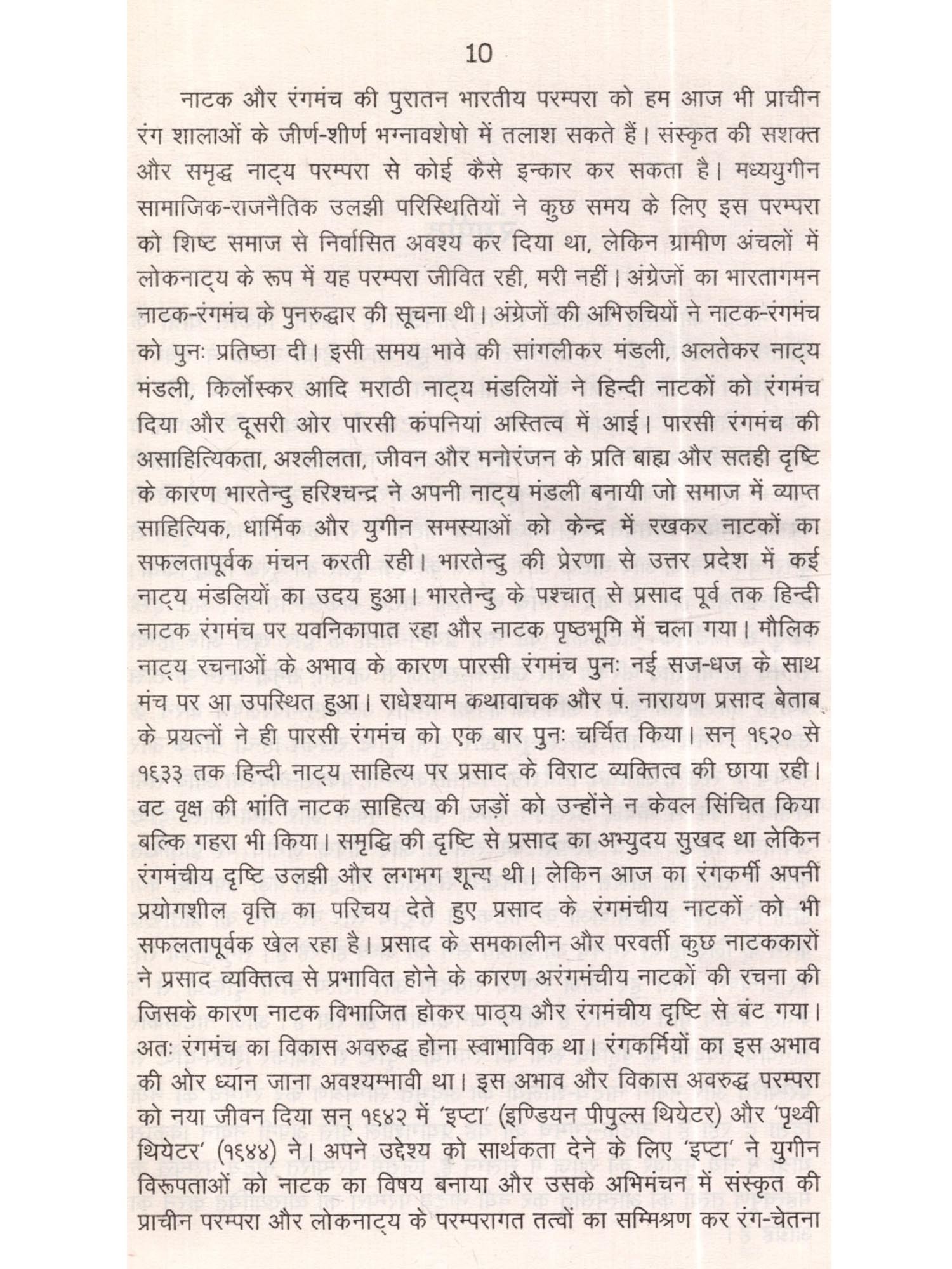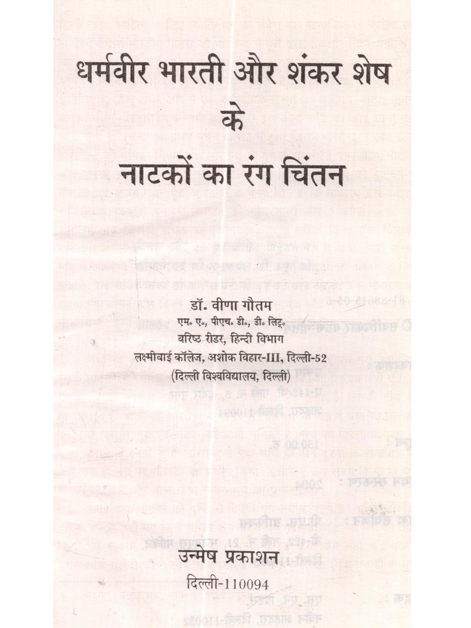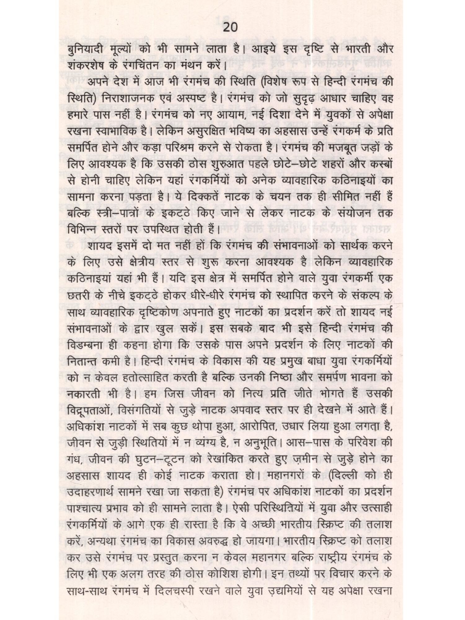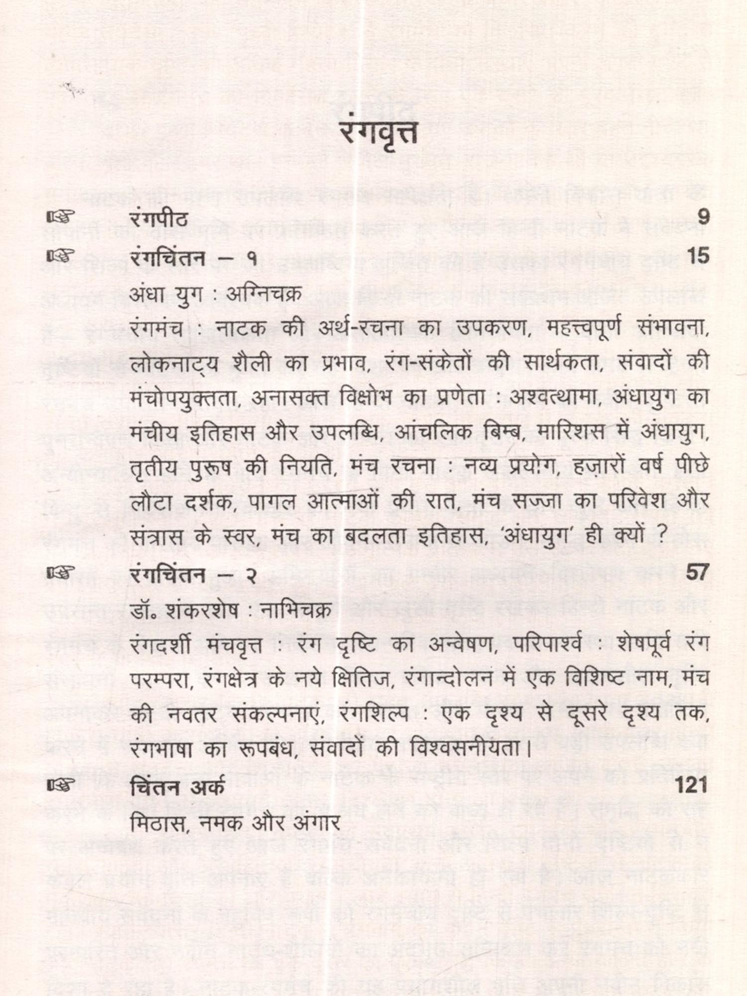 'अंधायुग विशिष्ट काव्य नाटक है। इलियट की भांति मिथकीय पद्धति से नाटककार ने विगत से आगत को जोड़ा है। इलियट के 'वेस्टलैण्ड' और जायस के यूलेसिस के लन्दन और डबलिन नगरों की भांति भारती यहाँ अंधायुग की उजडी और बिखरी कौरव नगरी को प्रस्तुत करते है। अभिमंचन में आस्था का स्वर कथा के दो स्तरों से दो आयामों को उभारता है। इसका मंचन एक विद्युत गूंज है जो अग्निचक्री होकर आतंरिक तहों को फोड़ कर गनुष्य को तल तक मथ देती है। इसीलिए यह नाट्यकृति लगभग अर्द्धसदी बीत जाने पर भी मंचीय शिखर से नहीं उतरी। डॉ. शंकर शेष आधुनिक रंग अन्वेषण का एक महत्त्वपूर्ण अध्याय है। इनकी नाट्य मुद्राएं वस्तुतः मनुष्य-चेतना का गतिशील इतिहास हैं। इसमें धचके भी हैं और समतल राह भी, लेकिन संघर्ष कहीं भी कोणस्थ नहीं है। शेष की प्रतिबिम्बात्मक मंचोपयुक्तता की सबसे बड़ी सार्थक उपलब्धि मनुष्य केन्द्रित जीवन को नयी दृष्टि देना है। नाटककार की पारदर्शी दृष्टि रंगपथ को सप्राण करती है। शंकरशेष की मंचीय अनुकूलता के मूल में आधुनिक कल्पनाशीलता ने बहुत महत्त्वपूर्ण योगदान किया है।
