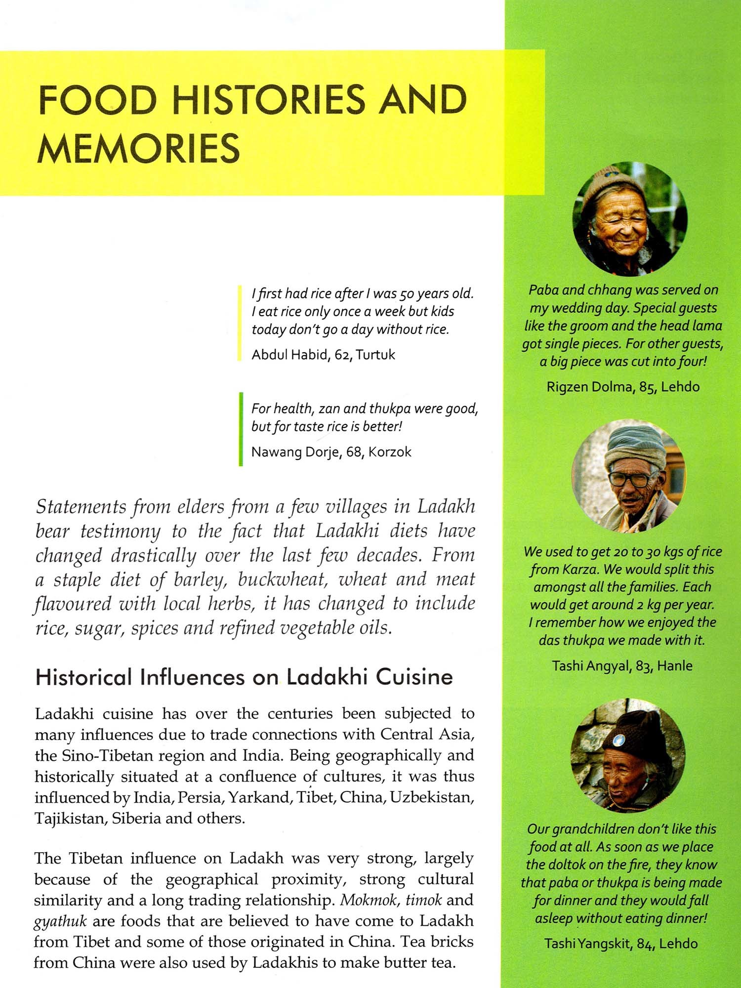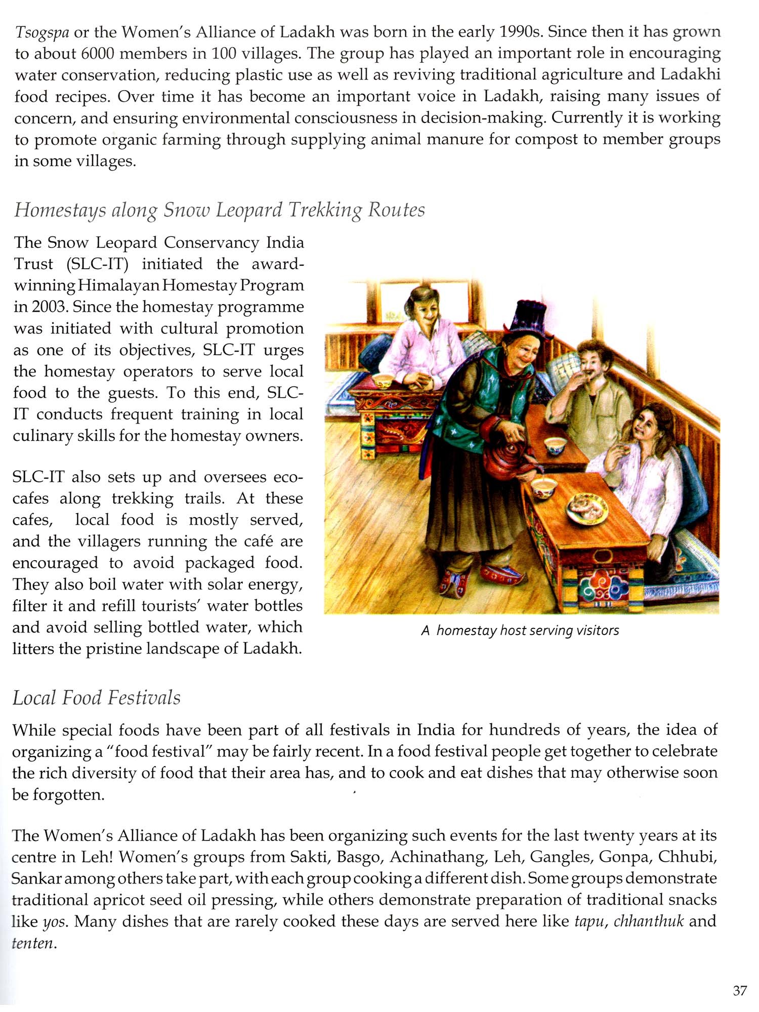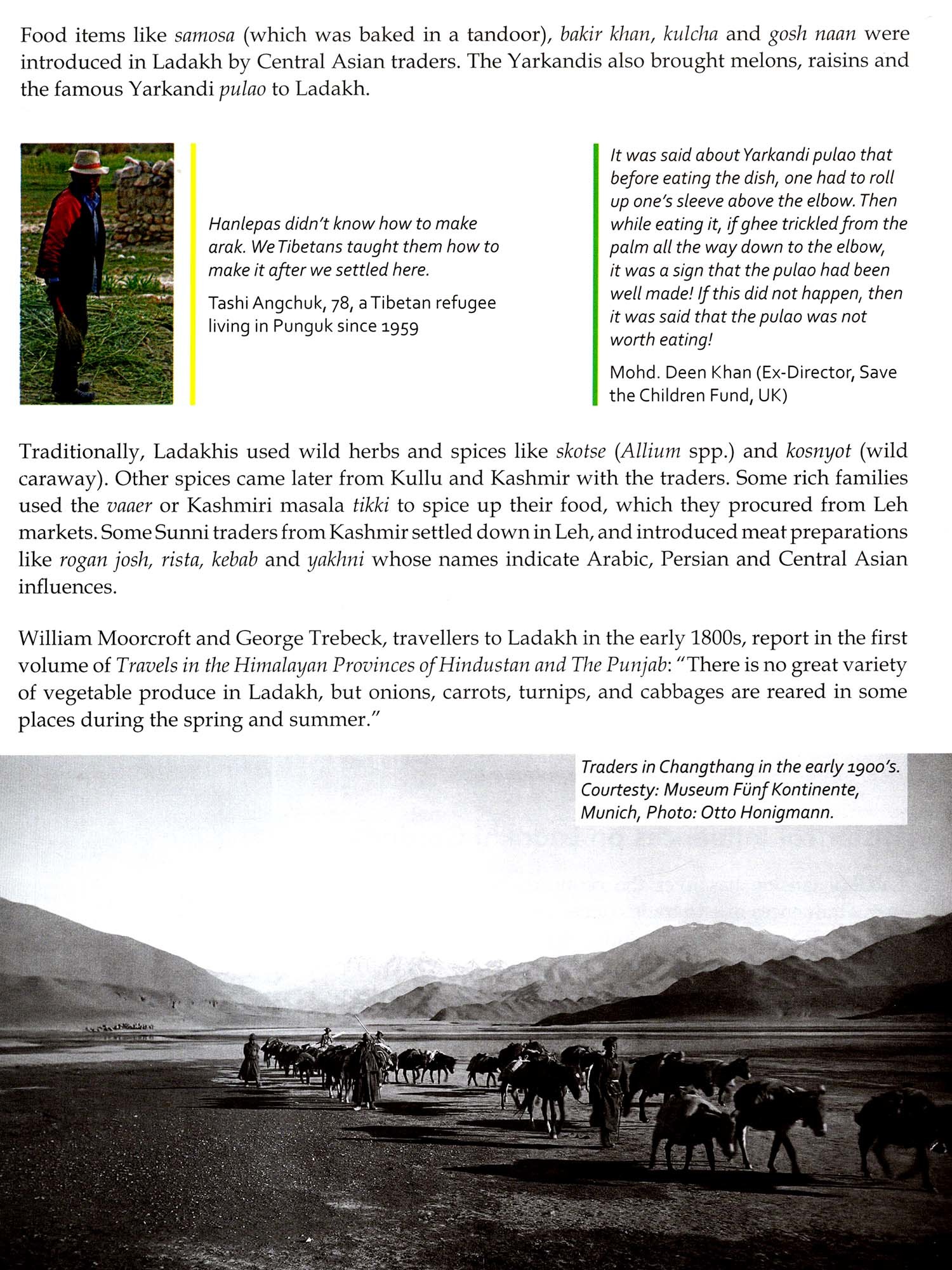 Food and culture: It is difficult to think about these two words separately. The origin of the word "culture" itself relates to preparing and taking care of the soil for farming. Bacterial 'cultures transform and enhance foods through fermentation, and every human culture depends on these bacterial cultures. One way of thinking about a culture is a group of people in a specific place relating to and transforming the natural elements of that place into various expressions: language. clothing, buildings, tools, crafts, art, ceremonies, music, stories, and above all, food. To a large degree, the culture of a place and the food of a place are one: agriculture is the art of people forming mutual relationships with seeds, animals, water, soil, seasons, and plants. This is like a slow dance of co-evolution over centuries, working with cycles of birth, growth, and decay, shaping the land and being shaped by it in turn. Exchanges with other such cultures over time also shape local food cultures This co-evolutionary 'dance' is as clear in Ladakh as anywhere. Many of the crafts and technologies - from basket weaving to water mills emerged for production, processing, transport and storage of food. The arts, architecture, songs, celebrations, and ceremonies are all sustained by food, and are therefore part and parcel of agriculture and animal husbandry. It is no accident that many of the traditional songs praise food, drink, and the land, and that most artisans and craftspeople are also farmers and shepherds. Ladakh's food culture is of course a hybrid, having over the centuries incorporated crops, recipes and more from the caravans traversing the vast distance of the Silk Road, from India, even from Europe more recently as in the case of the many vegetable varieties introduced by the Moravians. Ladakh's took these various food influences and materials and made them their own, adapting them to Ladakh's unique geography in harmonious combination with indigenous crops and foods. While trade always played an important role in the Ladakhi food economy, especially for some essentials like salt, until recently, the local agro-pastoralist system provided a high degree of village-level self-reliance.