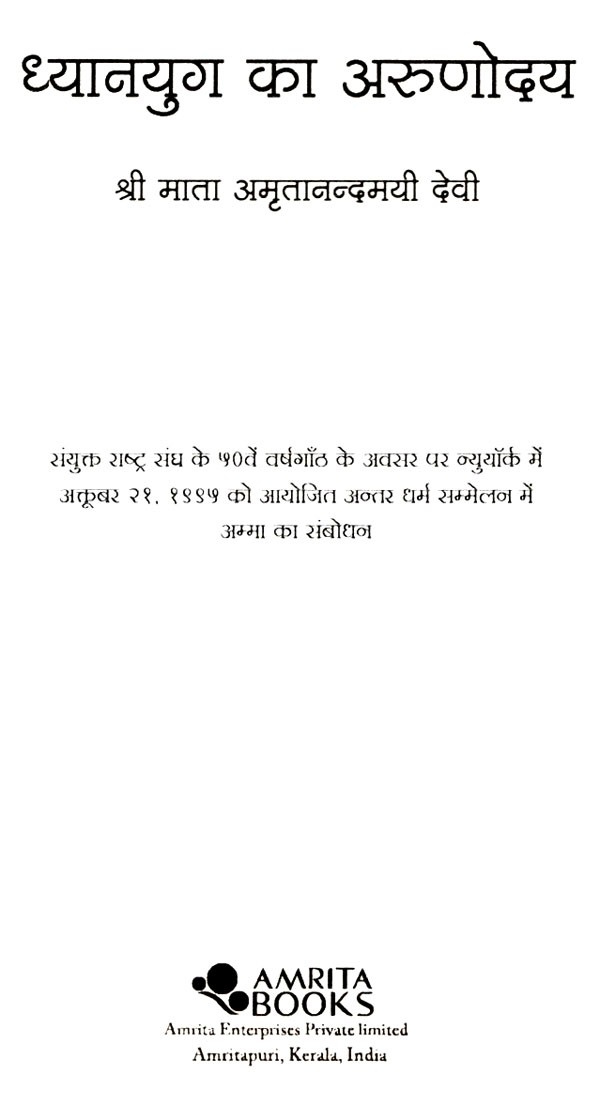 छोटे केरल के समुद्रतट पर स्थित एक मामूली गाँव में जन्म। ठेठ देहातिन। नियमित प्रथामिक शिक्षा पूरी नहीं की। वेश-भूषा और भाव-भंगिमा में अतिशय सादगी और निश्छलता। तथापि ये १९९३ में शिकागो महानगर में विश्वधर्म महासम्मेलन में अन्य विख्यात मनीषियों के साथ भाषण देती है। विश्वधर्माध्यक्षों की मंडली के लिये इनका चयन किया जाता है। आगे संयुक्त राष्ट्र संघ की स्वर्ण जयंती के प्रसंग में संचालित अन्तर-धर्म-सम्मेलन में भाग लेकर ये सब का सम्मान-पात्र बनती हैं। क्या कोई ऐसे चमत्कार की कलप्ना कर सकता है? वर्तमान युग में ईश्वर के अस्तित्व और आध्यात्मिकता की प्रासंगिकता तक को चुनौती दी जाती है। ऐसे युग में बुद्धिजीवी और अन्वेषण-प्रेमी लोग श्री अमृतानन्दमयी देवी जैसे विलक्षण व्यक्तित्व की कैसी व्याख्या दे पायेंगे? हमारे वर्तमान समाज में लोग क्षणिक सुखों के पीछे पागल होकर भटक रहे हैं। निराशा एवं मोह-भंग ने उन्हें अपना दास बनाया है। विज्ञान छलांग मारता आगे बढ़ रहा है। साथ ही इस धरती पर मानव का असितत्व तक सबसे बडी चुनौती का सामना कर रहा है। मानवराशि जीवन के उदात्त मूल्यों पर अधिष्ठित यथार्थ जीवन से अपना संबन्ध गवाँ चुकी है। आज निद्रित मानवराशि को जगाने के लिए आध्यात्मिकता पर अधिष्ठित कर्मप्रणाली आवश्यक हो गयी है।