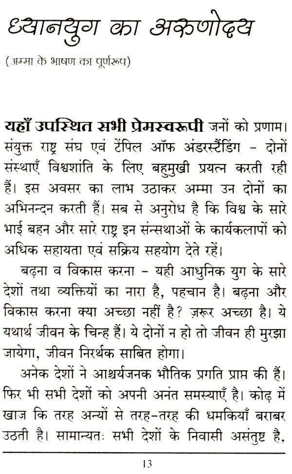 प्रत्येक देश की ओर घूरती समस्याओं को ठीक से पहचान कर उनका आध्यात्मिक दृष्टि से समाधान प्राप्त करने का समय आ गया है। जैसा कि अम्मा अपने भाषण में बताती है, 'बुद्धि के जरिए विकसित वित्रान ध्यान के द्वारा ही पूर्णता प्राप्त कर सकता है। आत्मा के विषय में ज्ञान के द्वारा ही विज्ञान अपनी उच्चतम दशा पर पहुँच सकता है।