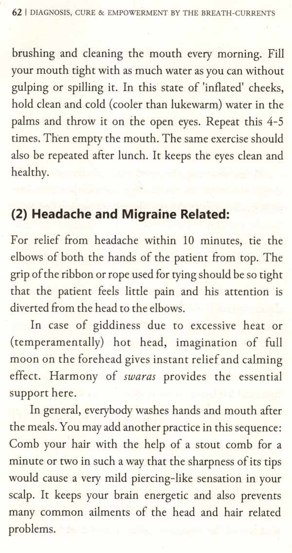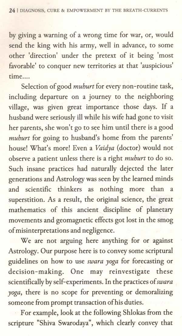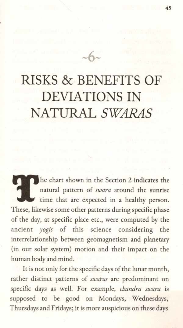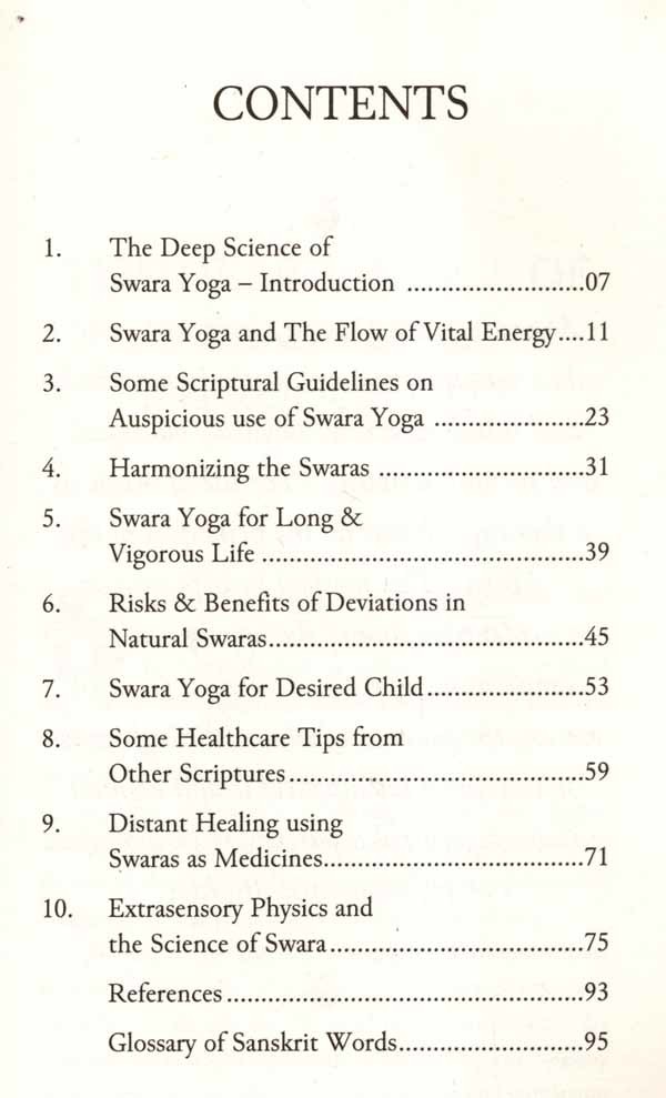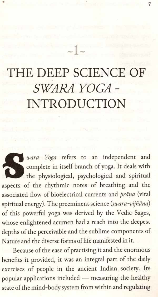 Most of the time we breathe either through our left nostril or through the right nostril; this breathing pattern corresponds to the flow of prana through the channels called Nadis. The book explains these aspects with a rare piece of knowledge on how cosmic magnetic forces, positions of the planets, biological clock, balance of the five basic elements in the body, and the mental state affect the breathing pattern. Principal focus of the book pertains to use of swara yoga in the diagnosis and control of the ailments and disorders in the mind-body functions that have direct correspondence with easily detectable breathing patterns. It also describes the significance of breathing from different nostrils in mental concentration and calmness, etc., and explains how to harmonize various daily activities w.r.t. the swara-patterns to achieve the best results.
