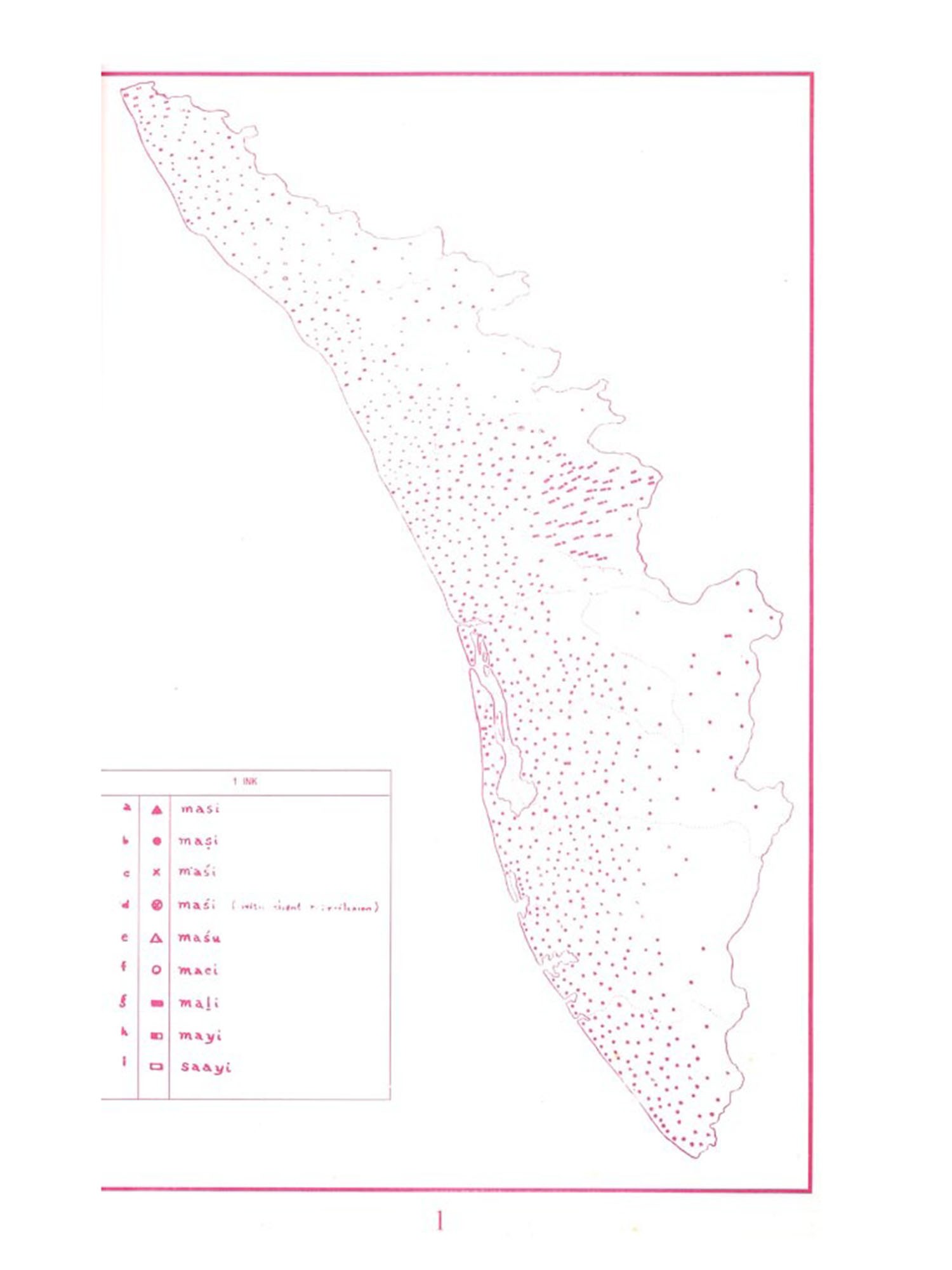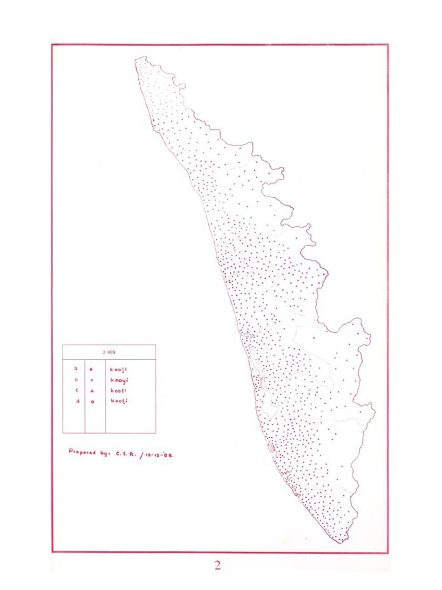 The present Head of the Department of Linguistics in the Kerala University, Dr.N.Rajendran and the Vice Chancellor and Syndicate of the Kerala University generously permitted the publication of the maps. Such a valuable work prepared in 1969 if not printed will crumble to pieces and a future generation of researchers could not refer to the findings collected after strenuous field work.