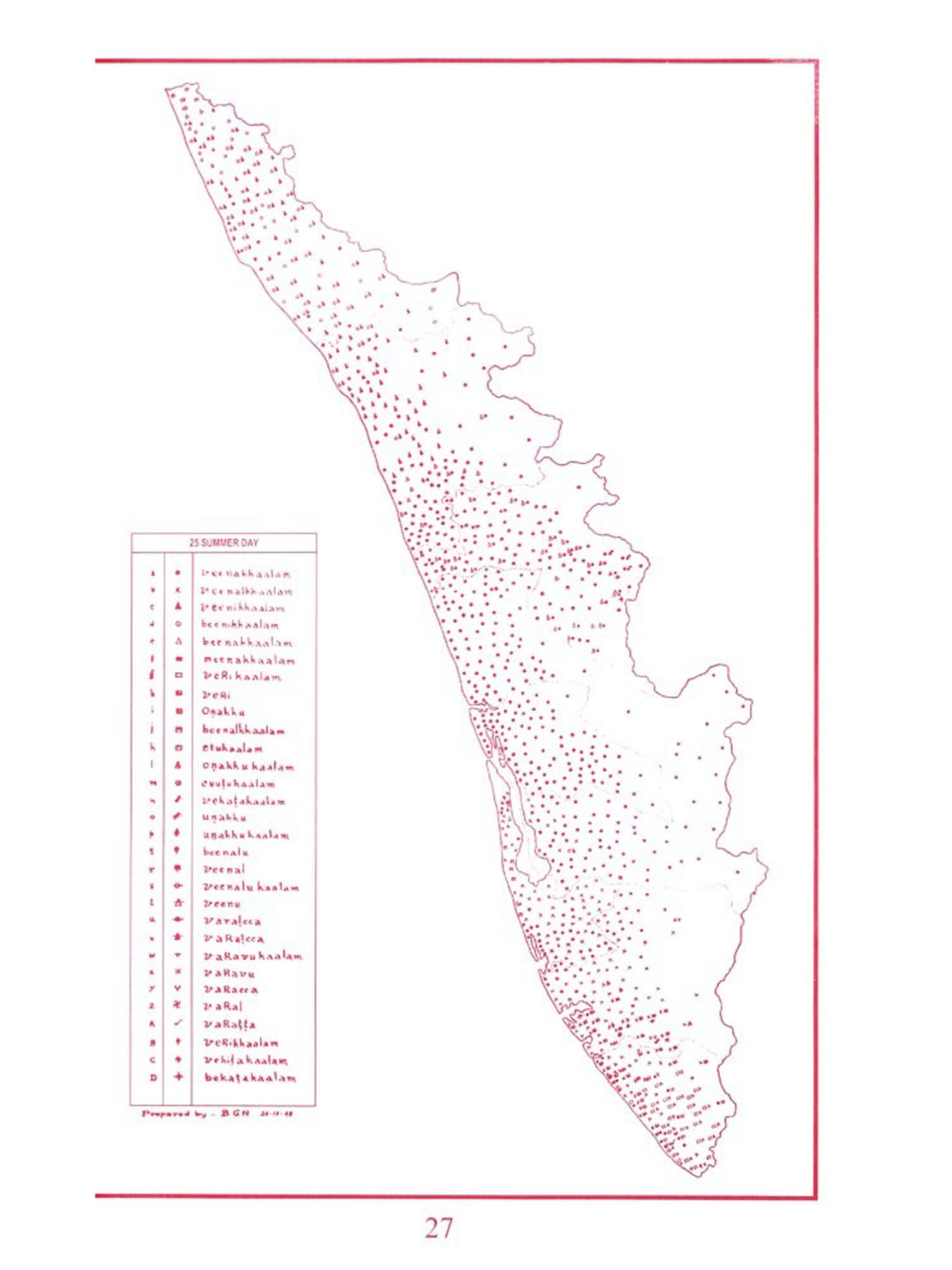 T.Velavan, C. Roy, P'Somasekharan Nair and R.V.K. Thampuran [Research Assistants) worked in two Districts each in Kerala, GK Panikkar, Lecturer helped in eliciting forms in the field and later in arranging the frequency list. CJ Roy and B.Gopinathan Nair prepared the maps. Of the five Research Assistants T.Velavan, P.Somasekharan Nair and R.V.K. Thampuran passed away at an early age. Our sadness in losing them is overwhelming.
