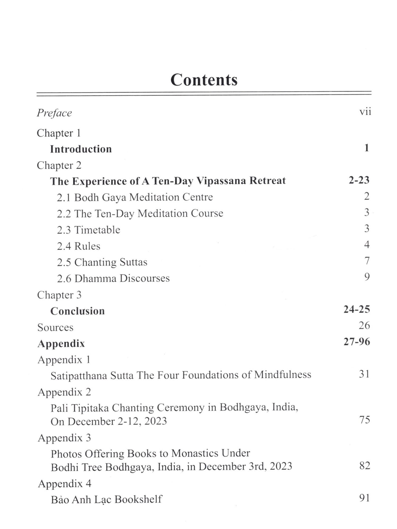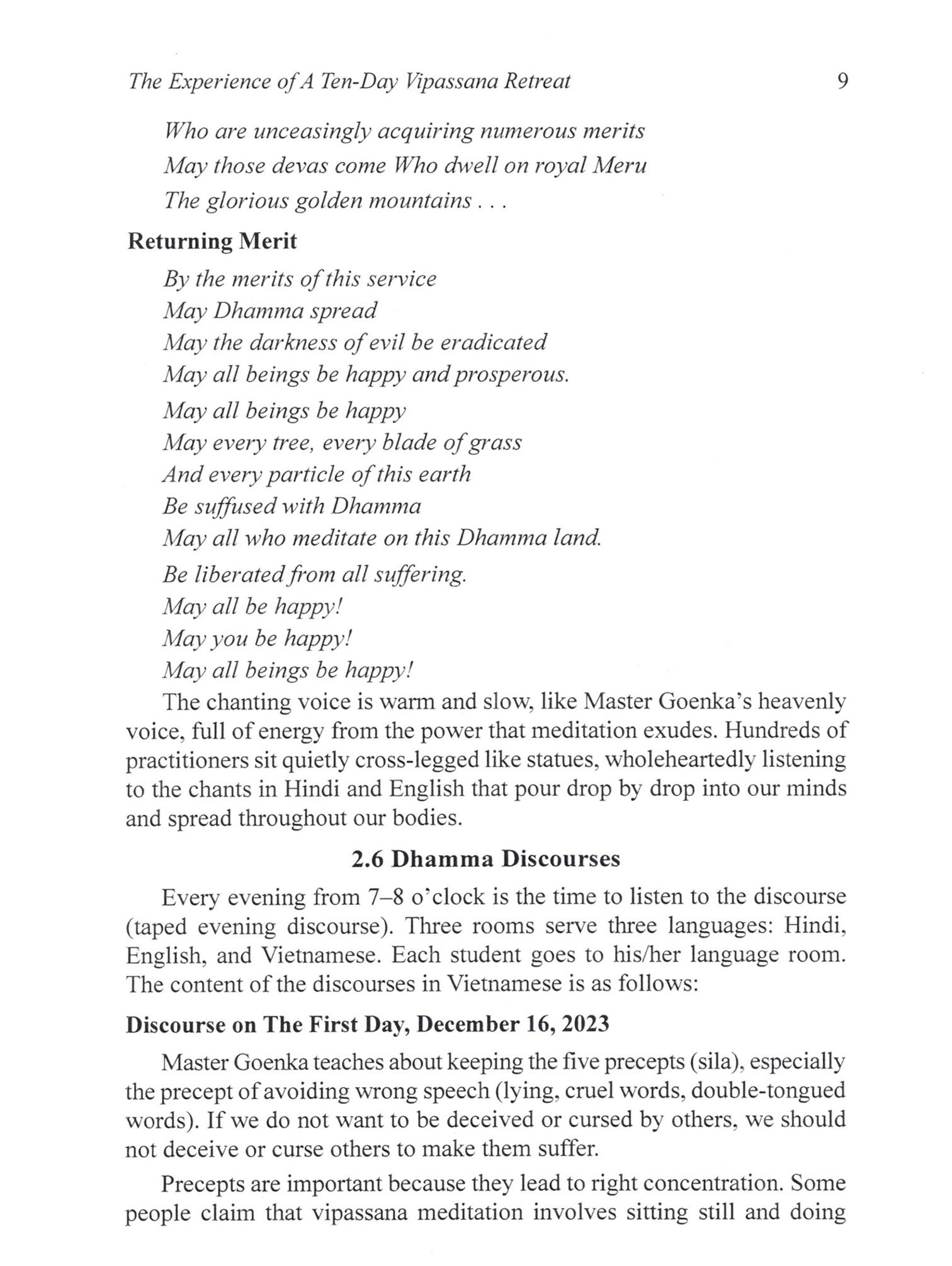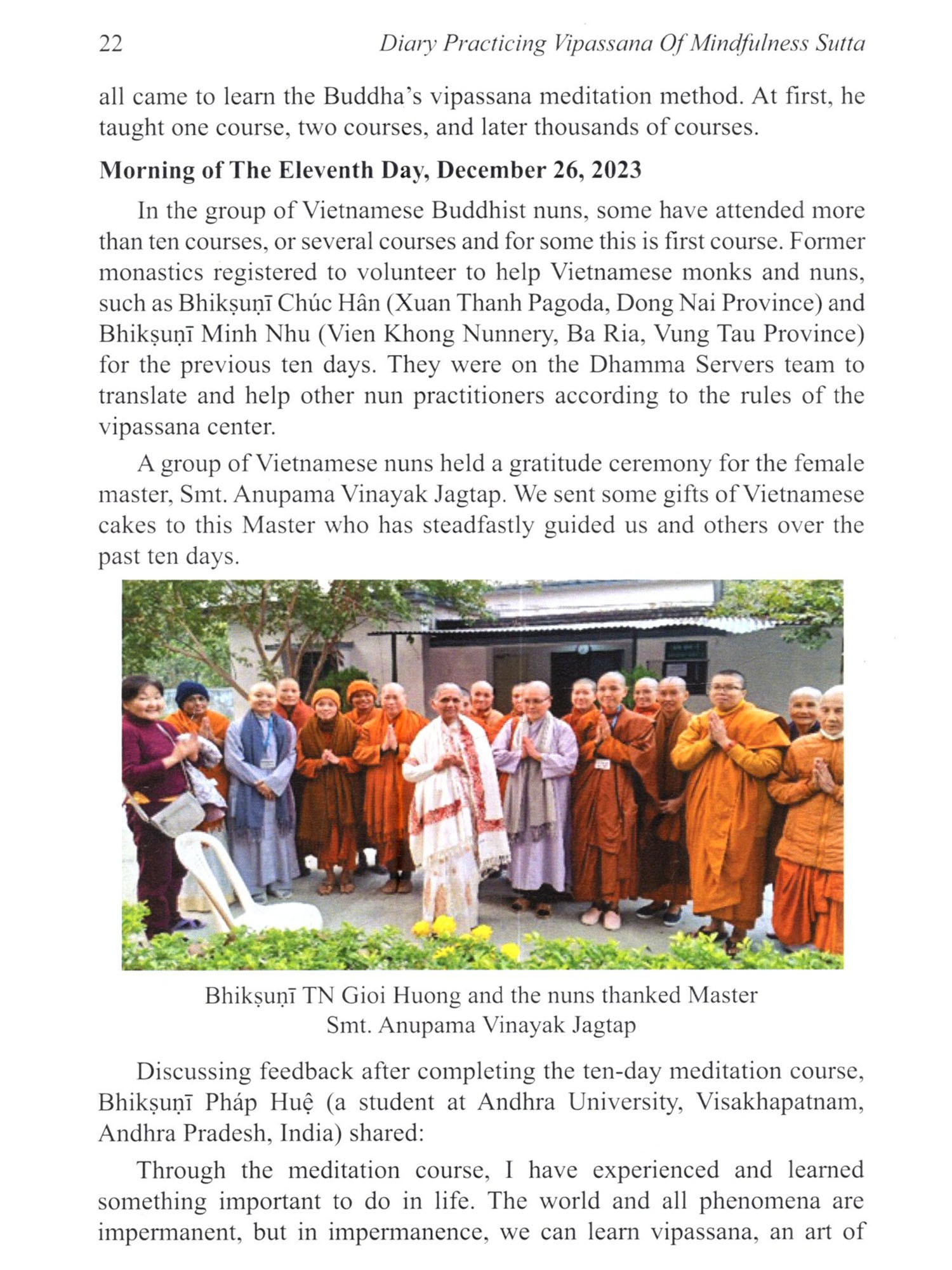 By the end of 2023, Bodhgaya (India) was bustling with more than 4,000 monastics and lay Buddhists from Southeast Asian countries such as India, Cambodia. Thailand, Sri Lanka, Laos, Vietnam, Indonesia, Bangladesh, Malaysia, and Singapore who had come to attend the Pali Tipitaka Chanting Course under the sacred Bodhi tree on December 2-12, 2023. After the chanting course, many Vietnamese nuns and Buddhists joined the ten-day meditation course (December 15-26, 2023) at Dhamma Bodhi Meditation Centre organized by the Bodhgaya International Vipassana Meditation Centre, Bodh Gaya, Bihar, India. 1 (Bhikşuņi TN Gioi Huong), Bhikşunī Tinh Hi, and Bhikşuņi Phap Hue also registered to attend this course on the Buddha land after finishing the Pali Chanting Course. Bhikşuņi TN Gioi Huong (standing in center with a scarf and Vietnamese Nuns in front of Dhamma Bodhi Meditation Hall, 2023