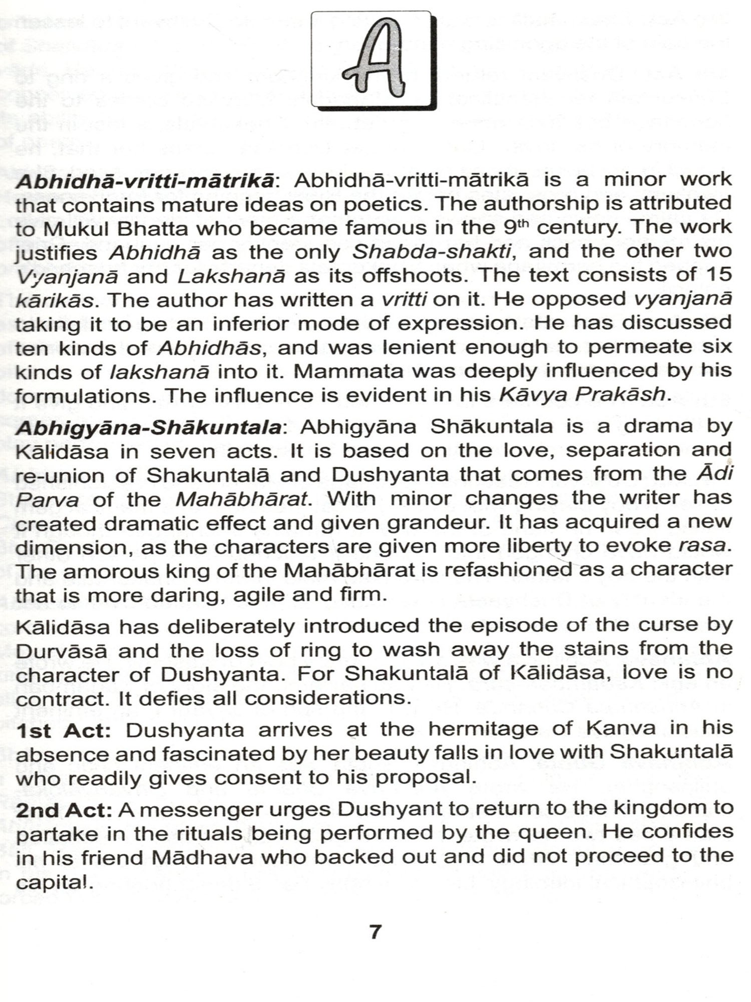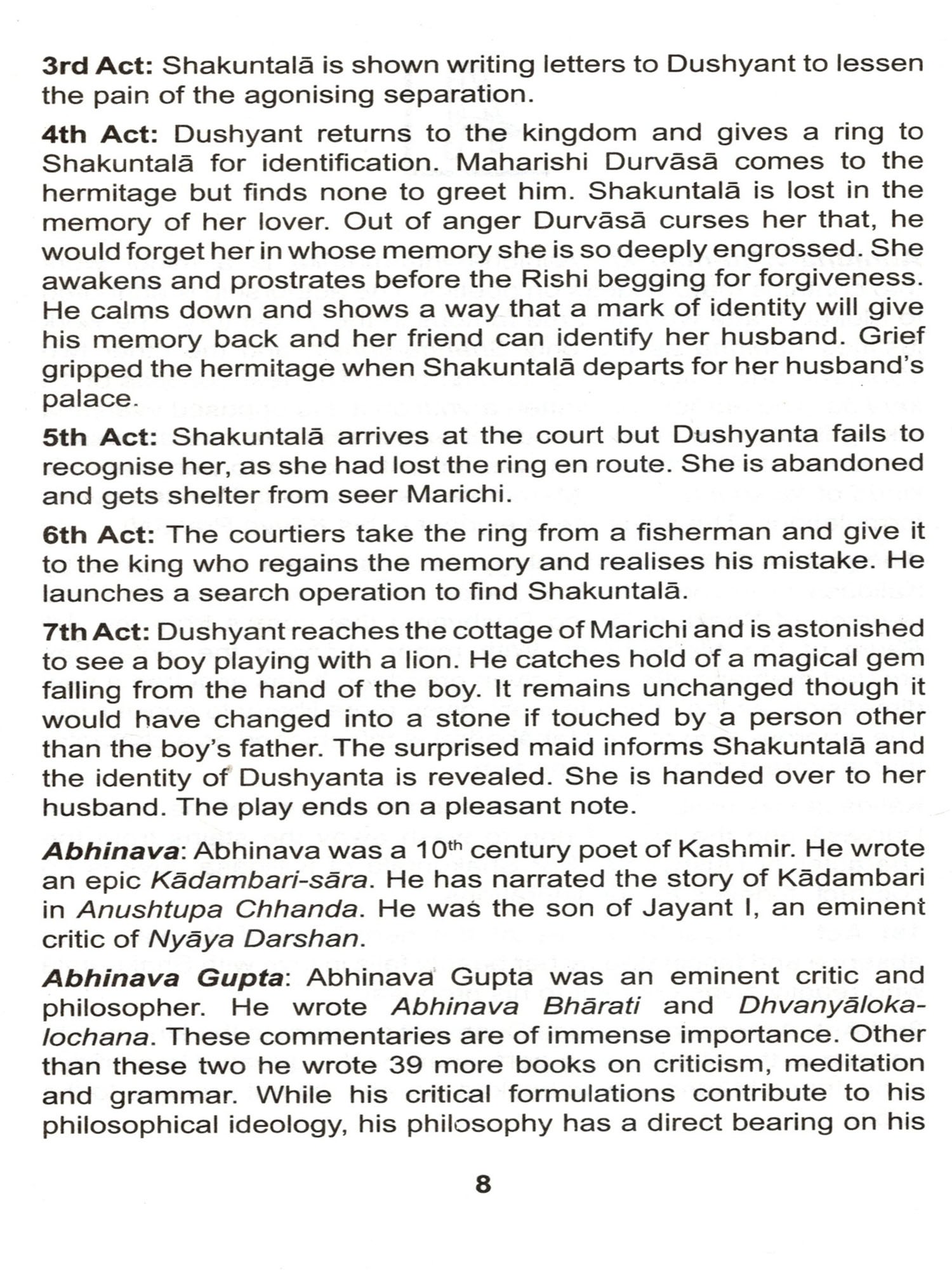 Efforts have been taken to reduce the repetition of similar matters, yet repetitions are bound to occur because at their different places they are an integral part of the term being explained. Take for example, the play Abhigyiinashiikuntalam, which is there as a drama, as the work of the author Kiilidiisa as well as mentioned in the Natyashatra.