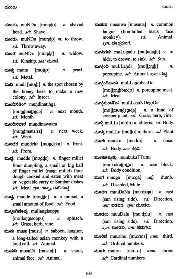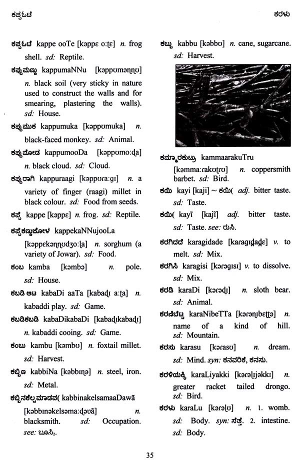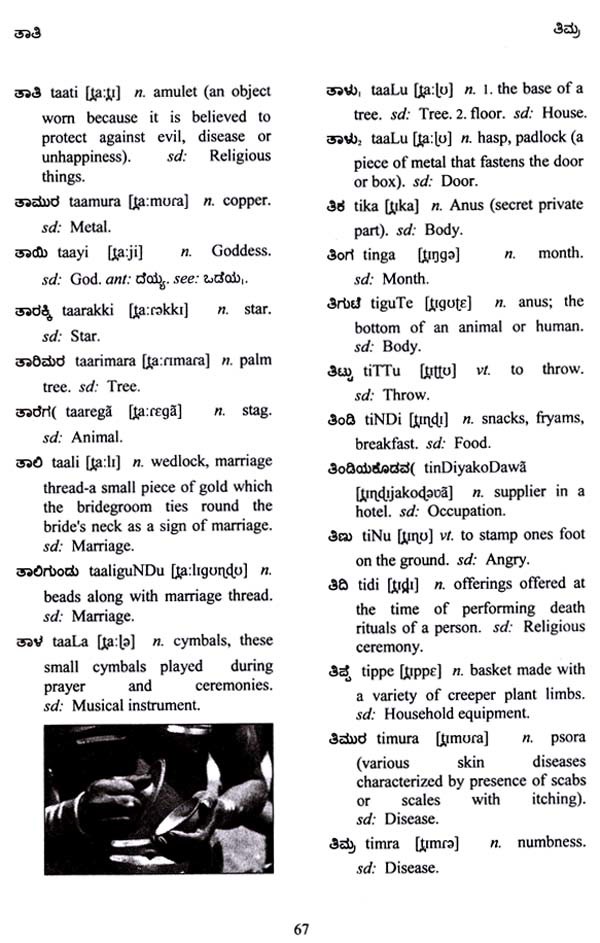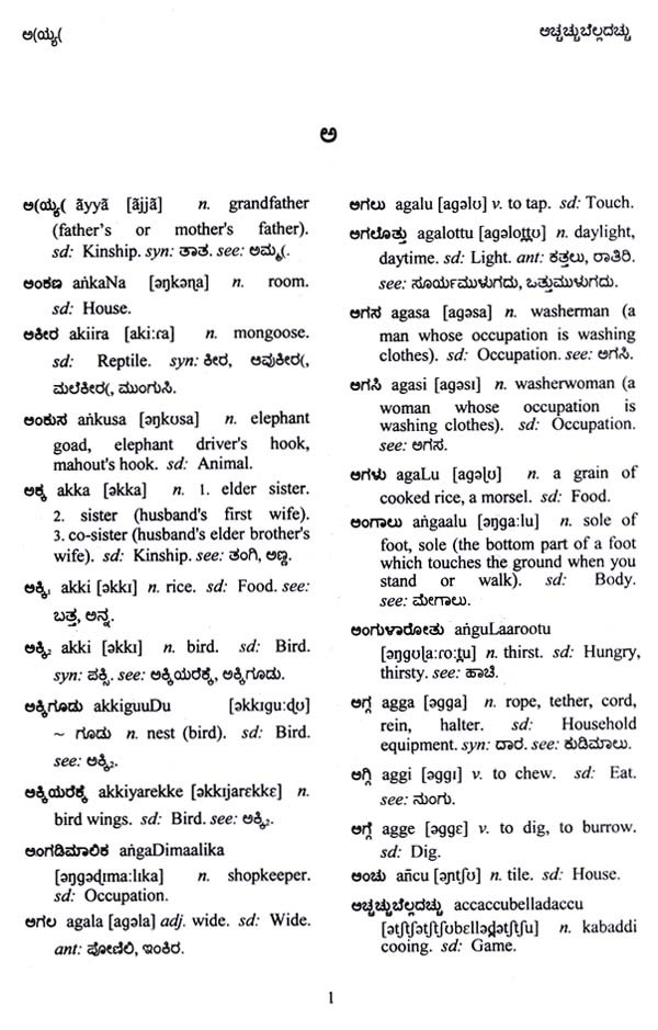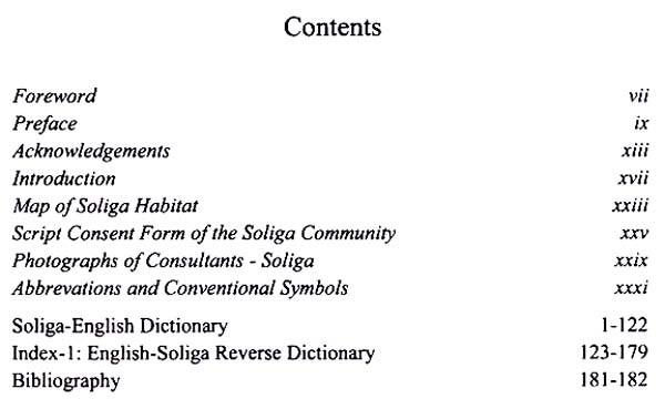 The dictionaries of endangered languages are different from those of the major languages of the world in many aspects the most important one being that they are oftentimes compiled by linguists who are not native-speakers of the language with limited resources of time, money and manpower. Sometimes, the linguist or the dictionary-maker may have to seek the help of an interpreter to elicit the desired information for compilation of the dictionary. Fortunately, in the case of this trilingual dictionary, though English was used as the link language, the investigator with his near-native proficiency in Kannada could do a systematic elicitation of Soliga headwords and provide acceptable definition or explanation of the lemmas, and other lexicographic data.