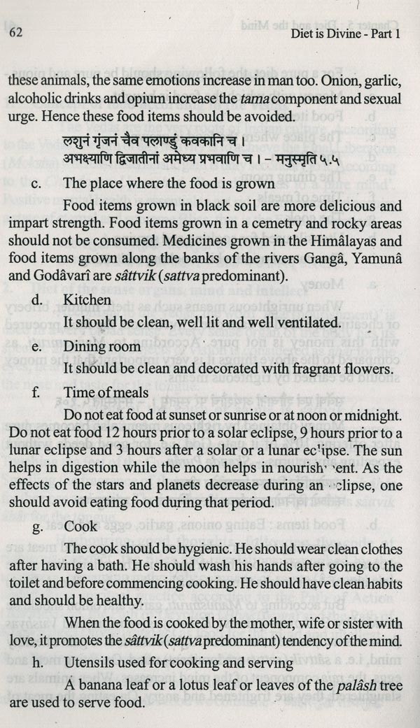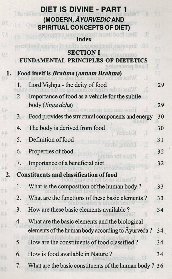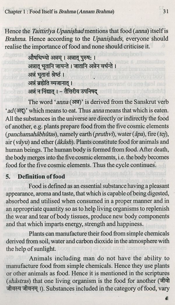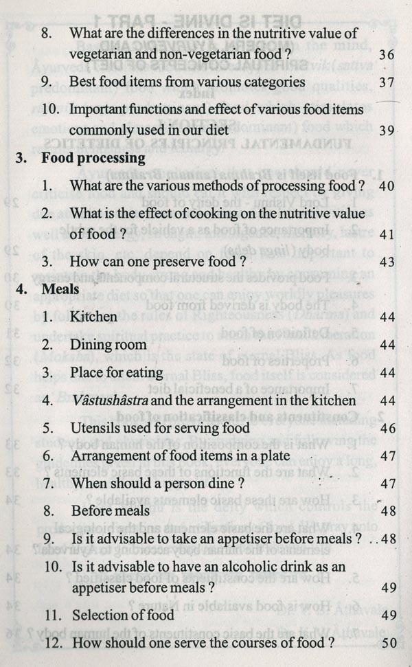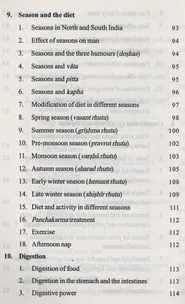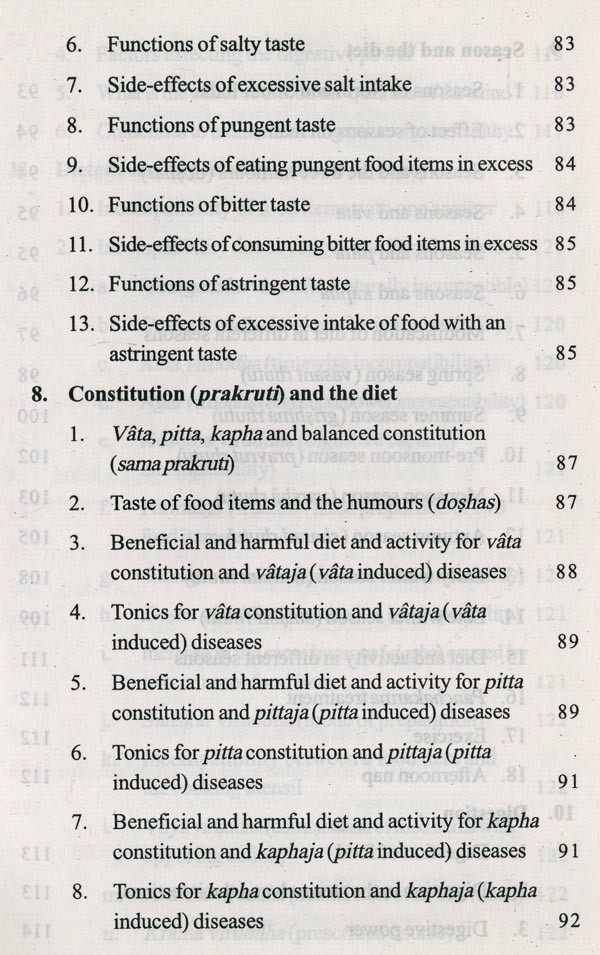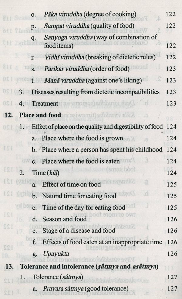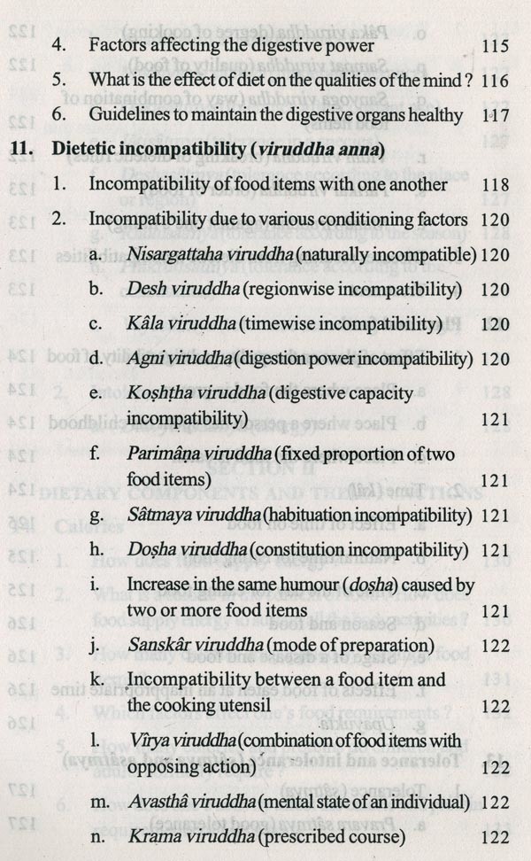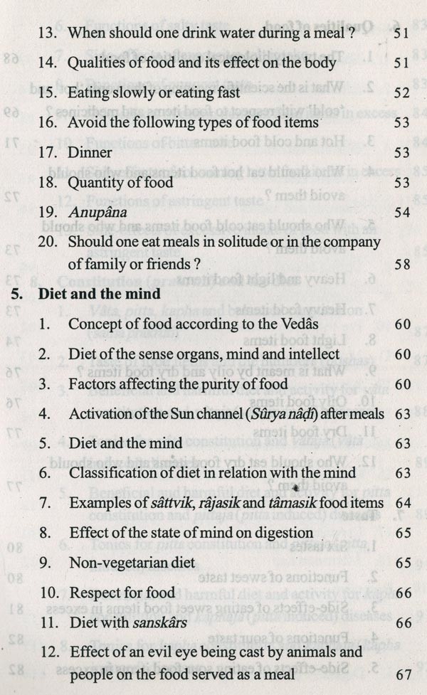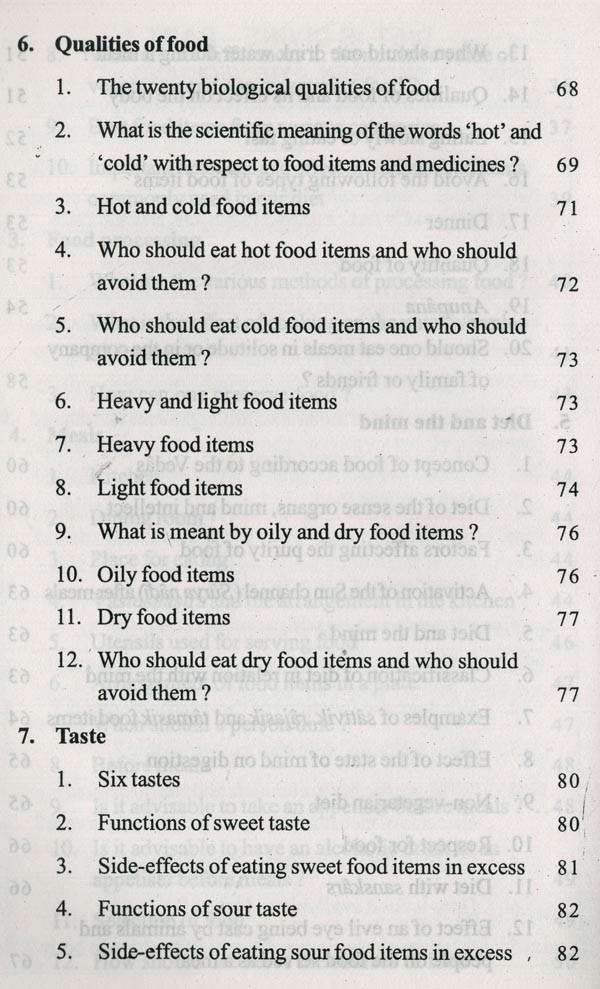 Ayurveda describes the effects of various biological properties of food like cold, hot, warm, heavy and light and their action on the human body. It elucidates the effect of the taste of food on the body and the mind. It gives guidelines to adjust one's diet as per one's constitution, season, age, etc. It gives in detail the effect of every food item on various tissues and organs of the body and describes dietetic incompatibilities. It also enlists in detail the list of food items which are beneficial or harmful in various diseases and how one should vary the diet in the different stages of the disease. Ayurveda emphasises on the importance of following the recommendations and restrictions of diet as advised by the physician in various diseases. Ayurveda gives details of the arrangement in the kitchen, the arrangement of food items in a dish and emphasises on the importance of hygiene. It also describes how one should serve the courses of food and the rituals one should follow before, during and after meals.