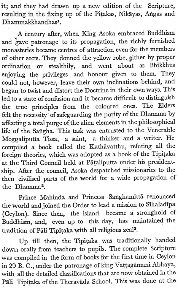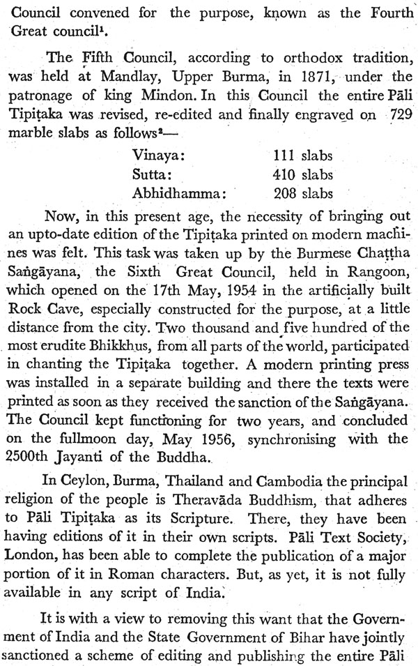 The Buddhist literature, particularly the canonical literature, containing the collection of the words of the Buddha, was collected verbally by his monk disciples in different regional dialects of north and central India. However a considerable part of these collections is lost in original Indian languages and is available only in Chinese and Tibetan Translations. However, Theravada tradition is the only tradition which has preserved the largest collection of Buddha teachings in original in a language which is called Pali. The Buddhist literature preserved in Pali is undoubtedly most authentic and earliest source for the knowledge of earliest form of Buddhism. For centuries after the Mahaparinibbana of the Buddha, the Pali Tipitika was traditionally handed down orally and was compiled in the form of the books for the first time in Ceylon in 29 B.C. Latter on it was again compiled with revision and re-edition at Mandlay, upper Myanmar in 1871 and finally upto date edition of the Pali Tipitika was printed by the sixth great council held in Rangoon in 1954. In the Theravada countries like Ceylon, Myanmar, Thailand, Laos and Cambodia, the Pali Tipitika was printed in the native scripts of the countries. However, complete Pali Tripitaka was not available in any script of India, the land of origin of Buddhism and Pali Tipitaka.