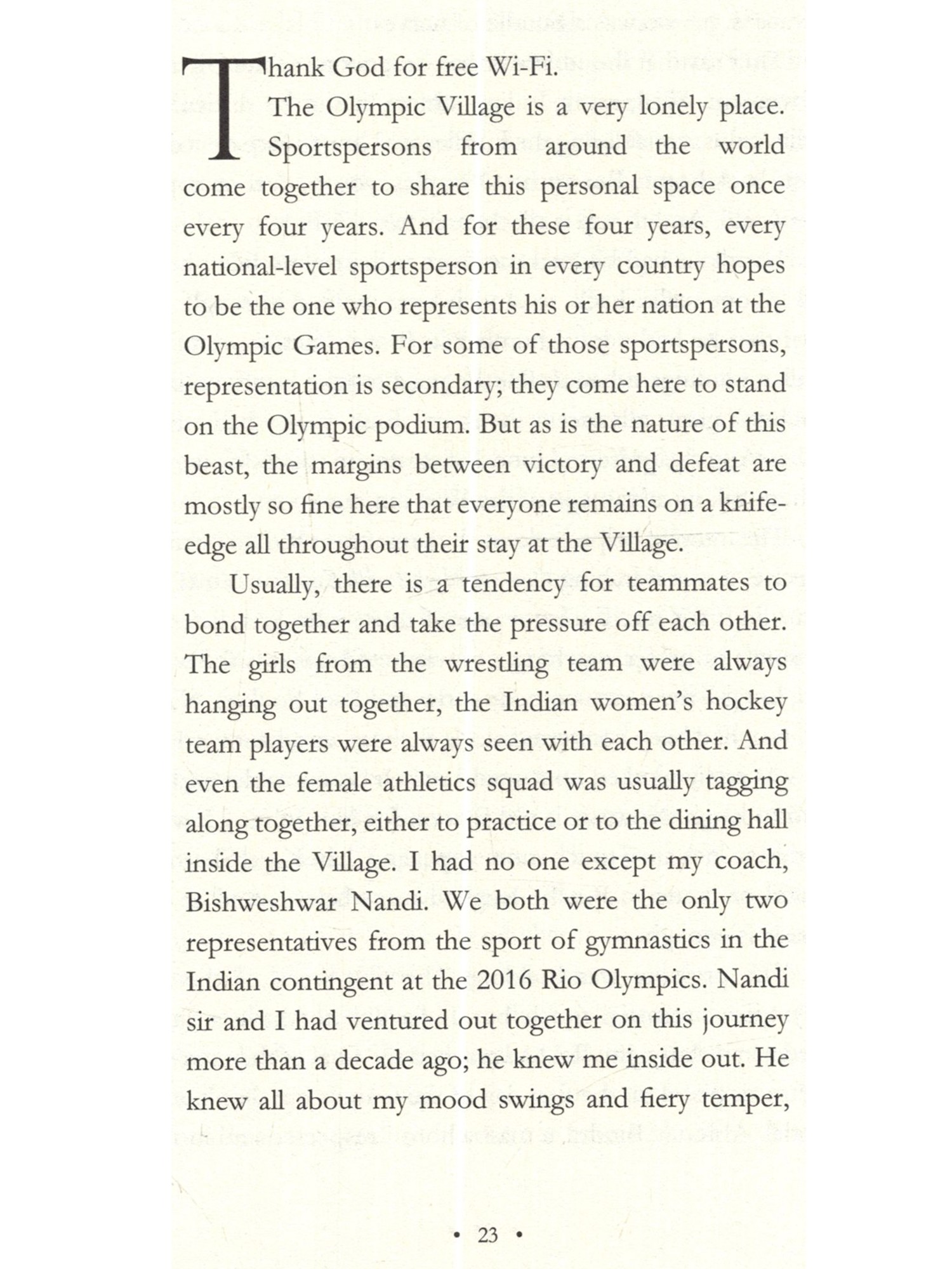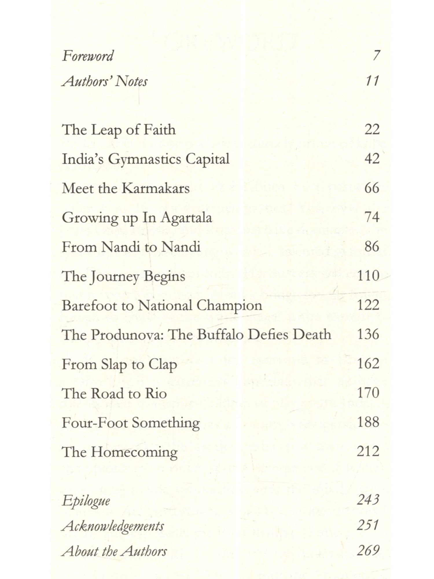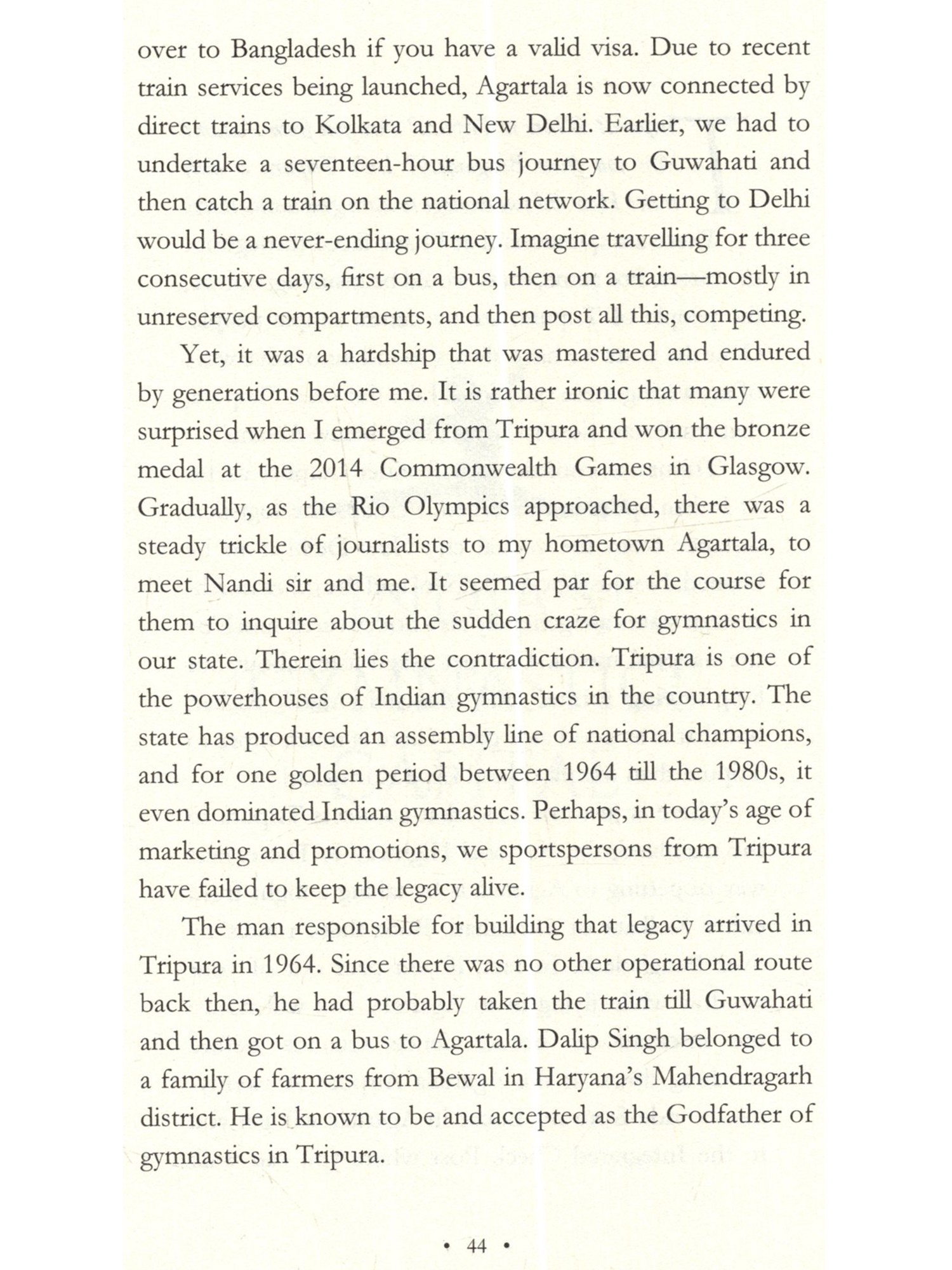 Bishweshwar Nandi Dipa Karmakar's rise in Indian sport caught most of India unawares. "Oh, she is the gymnast who does the death vault," is what we usually got to hear. I would get really upset as the very mention of the word 'death' was something I avoided bringing up in front of Dipa. One can practice as much as possible, but one cannot control the mind. One misstep in gymnastics, and especially the Produnova vault, can lead to disaster and the end of a career. There is a lot more to Dipa than the Produnova. I have been training her since she was ten years old. That mischievous brat who never listened to me has today ensured that I am mentioned alongside her whenever the conversation turns to gymnastics. To be honest, her story is my story. Together we have battled the odds and endured a lot of humiliation and ridicule along the way. This book is an attempt to share our story with a wider audience. Dipa was inundated with questions post her fourth place finish at the Rio Olympics. An entire generation seemed oblivious to the history of gymnastics in Tripura and we were supposed to have emerged from nowhere. There was an urgent need to change the narrative, about our state and our gymnastics. I am grateful to Vimal Mohan and Digvijay Singh Deo for convincing both Dipa and me to share our story through them. I must admit we were rather anxious as we were not fully aware of the effort needed for a book on Dipa's life and career. Our focus had turned to the 2020 Tokyo Olympics the moment we flew out of Rio and I did not want any distractions. Viimal and Digvijay convinced me over multiple sittings that Dipa's practice would not be affected one bit and that our story had to be told to inspire a new generation. Over the course of this book, they have travelled to Tripura, met gymnasts who once ruled the Indian gymnastics scene, and have returned educated about the contribution of our state to the sport of gymnastics. Both Dipa and I have been honest and it is not our intention to settle scores or create controversy. There are many Dipas out there who have not received the right opportunity to break through but I am confident they will be inspired by Dipa's story and chart their own course to success.