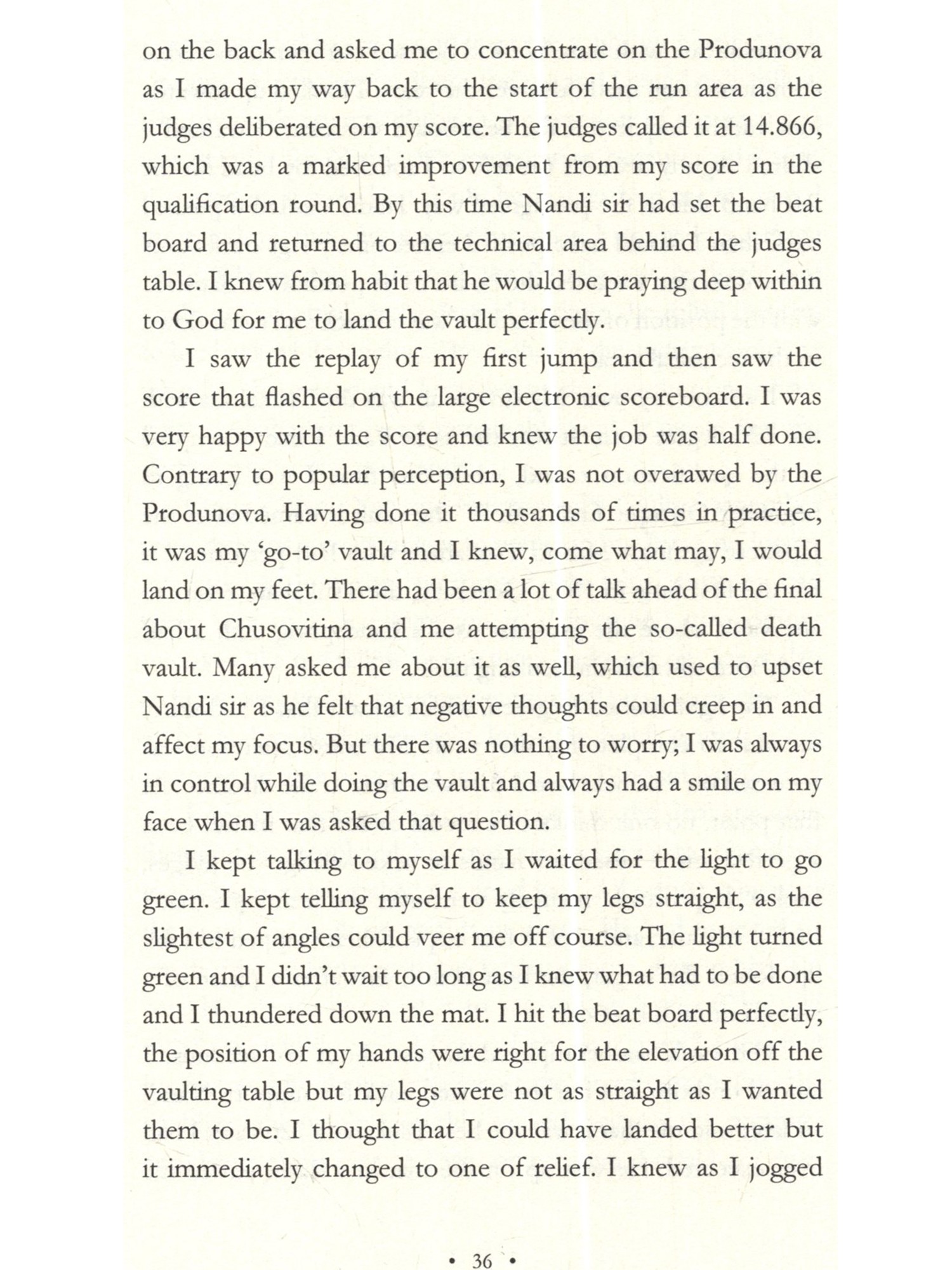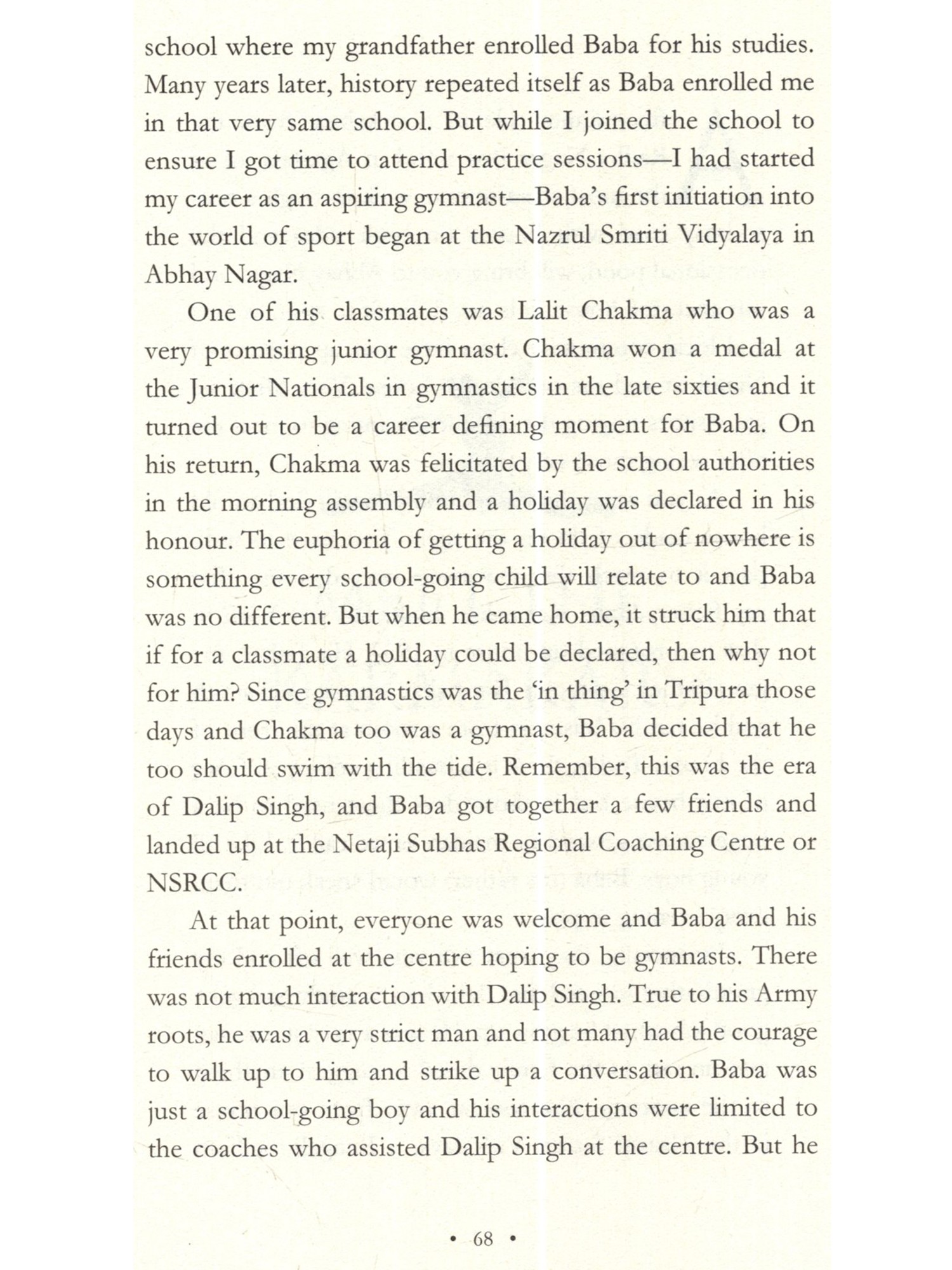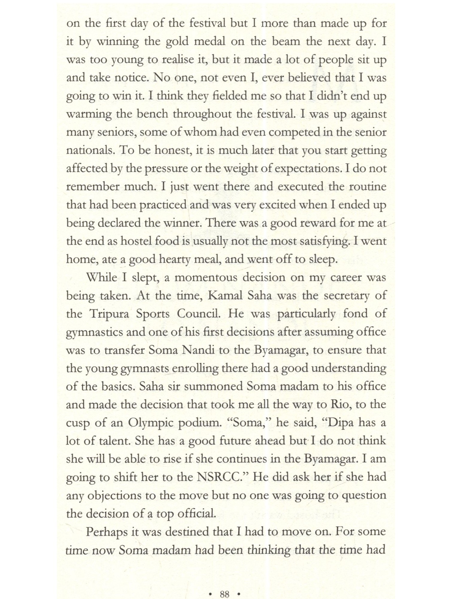 Bishweshwar Nandi Dipa Karmakar's rise in Indian sport caught most of India unawares. "Oh, she is the gymnast who does the death vault," is what we usually got to hear. I would get really upset as the very mention of the word 'death' was something I avoided bringing up in front of Dipa. One can practice as much as possible, but one cannot control the mind. One misstep in gymnastics, and especially the Produnova vault, can lead to disaster and the end of a career. There is a lot more to Dipa than the Produnova. I have been training her since she was ten years old. That mischievous brat who never listened to me has today ensured that I am mentioned alongside her whenever the conversation turns to gymnastics. To be honest, her story is my story. Together we have battled the odds and endured a lot of humiliation and ridicule along the way. This book is an attempt to share our story with a wider audience. Dipa was inundated with questions post her fourth place finish at the Rio Olympics. An entire generation seemed oblivious to the history of gymnastics in Tripura and we were supposed to have emerged from nowhere. There was an urgent need to change the narrative, about our state and our gymnastics. I am grateful to Vimal Mohan and Digvijay Singh Deo for convincing both Dipa and me to share our story through them. I must admit we were rather anxious as we were not fully aware of the effort needed for a book on Dipa's life and career. Our focus had turned to the 2020 Tokyo Olympics the moment we flew out of Rio and I did not want any distractions. Viimal and Digvijay convinced me over multiple sittings that Dipa's practice would not be affected one bit and that our story had to be told to inspire a new generation. Over the course of this book, they have travelled to Tripura, met gymnasts who once ruled the Indian gymnastics scene, and have returned educated about the contribution of our state to the sport of gymnastics. Both Dipa and I have been honest and it is not our intention to settle scores or create controversy. There are many Dipas out there who have not received the right opportunity to break through but I am confident they will be inspired by Dipa's story and chart their own course to success.