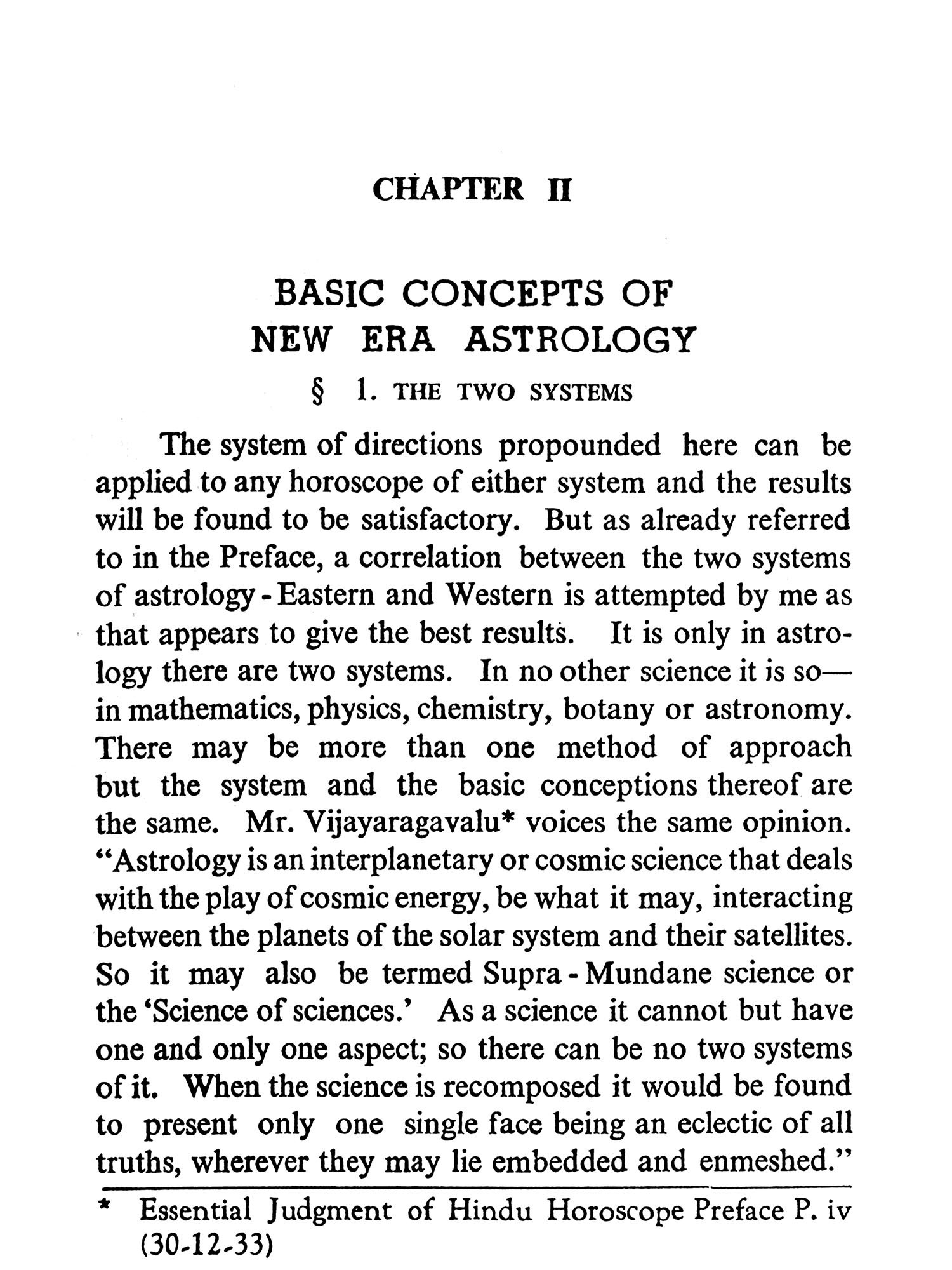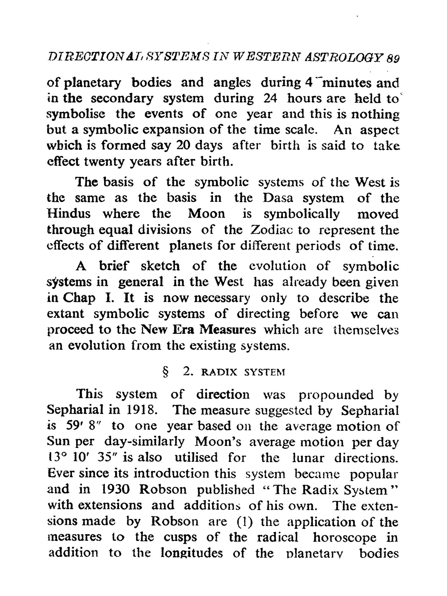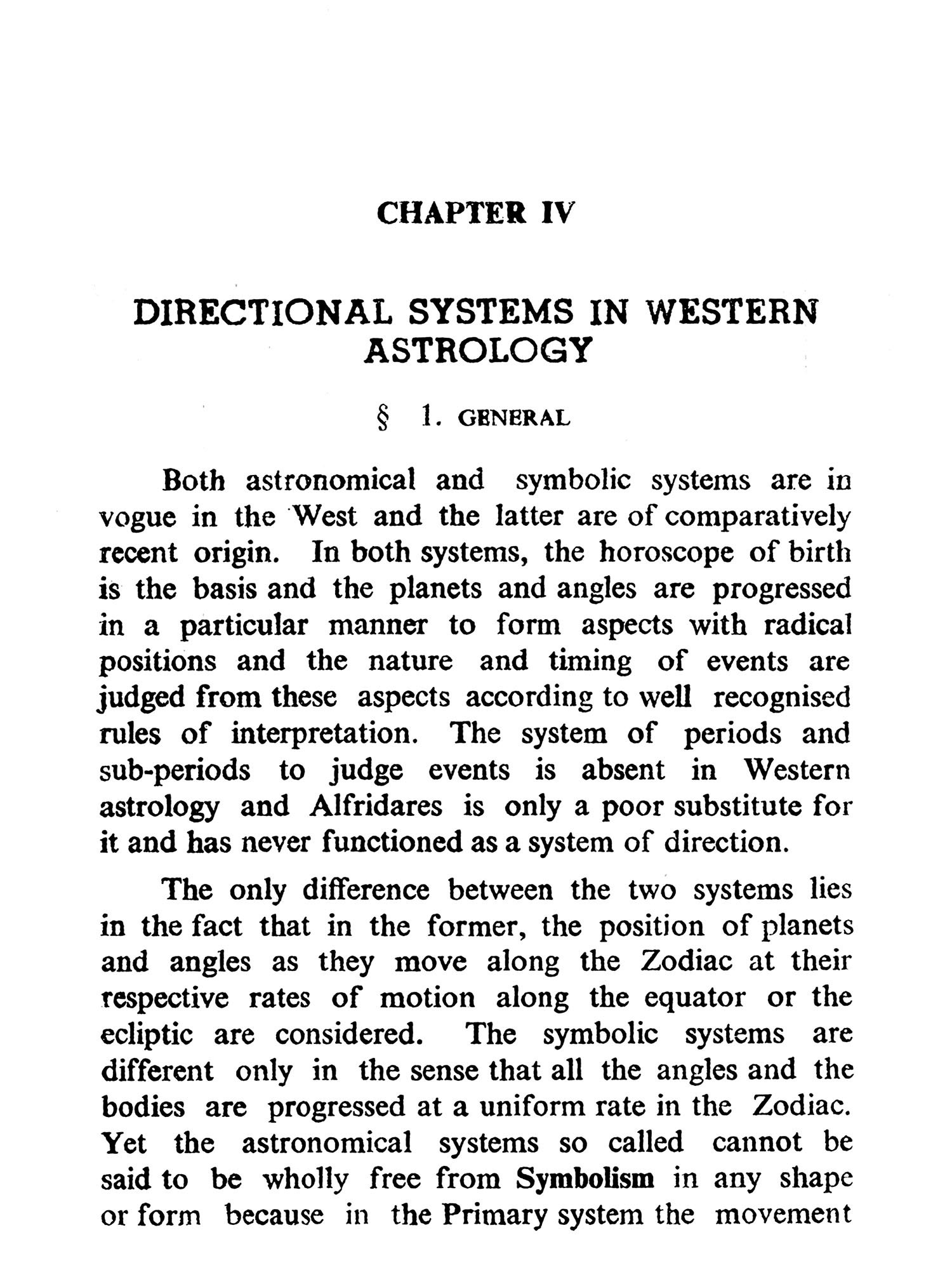 But astrologers employ other methods of making predictions which come under the heading of symbolical Prognostication. These include Directions (Primary and Secondary), Arabic Progressions, the Indian Dasa Systems, and Symbolics proper. Primary directions are related to the Mundane sphere and not to the ecliptic circle. Claudius Ptolemy, the disputed author of the Tetrabiblos in which the theory is first expounded, believed that the planets at birth left a permanent impress of their influences on the positions they occupied in the mundane sphere (i.e. in the Bhavas or "Houses"). Suppose birth occurred at sunrise about the time of the Vernal Equinox (March 21st) when Mars was precisely on the upper meridian (Midheaven) the Sun being on the ascending degree. According to this theory the influence of Mars irrespective of its zodiacal position is indelibly impressed on the midheaven, as that of the Sun is impressed on the eastern horizon. Six hours after birth would be noon, when the Sun would have come to the upper meridian (culminated) and hence it would be mundanely in conjunction with Mars; and as Ptolemy believed one hour of equinoctial time to be astrologically equivalent to IS years of life, then the effects of this direction would operate in the native's 90th year. The secondary method is on all fours' with the primary except that directions "In Zodiaco" are made to the ecliptic degrees occupied by the natal planets. Assuming a life span of 120 years all possible directions would occur within some eight hours of birth, Ptolemy's method of effecting these directions by proportion of semi arcs is open to serious mathematical objections. R. C. Smith (the first "Raphael") very logically suggested that such directions should be made under the Poles of the significators but Sepharial's formulae for computing these Poles is trigonometrically inaccurate. Inci-dentally these systems were never popular since they called for at least a working knowledge of trigonometrical functions, apart from the fact that they were laborious, tedious and time-consuming. The system most popular in the West, and still in vogue, is the Arabic method of progressions which is based on the assumption that every day after birth is equivalent to one year of life. According to this theory if the Sun and Jupiter come into mutual conjunction 30 days after birth, then the wonderful effect of this configuration would be experienced in the native's 30th year. In India the Dasa system of predicting by planetary periods is in popular use. As the method is explained with much detail by our author in this book it is not necessary to enlarge on it here.