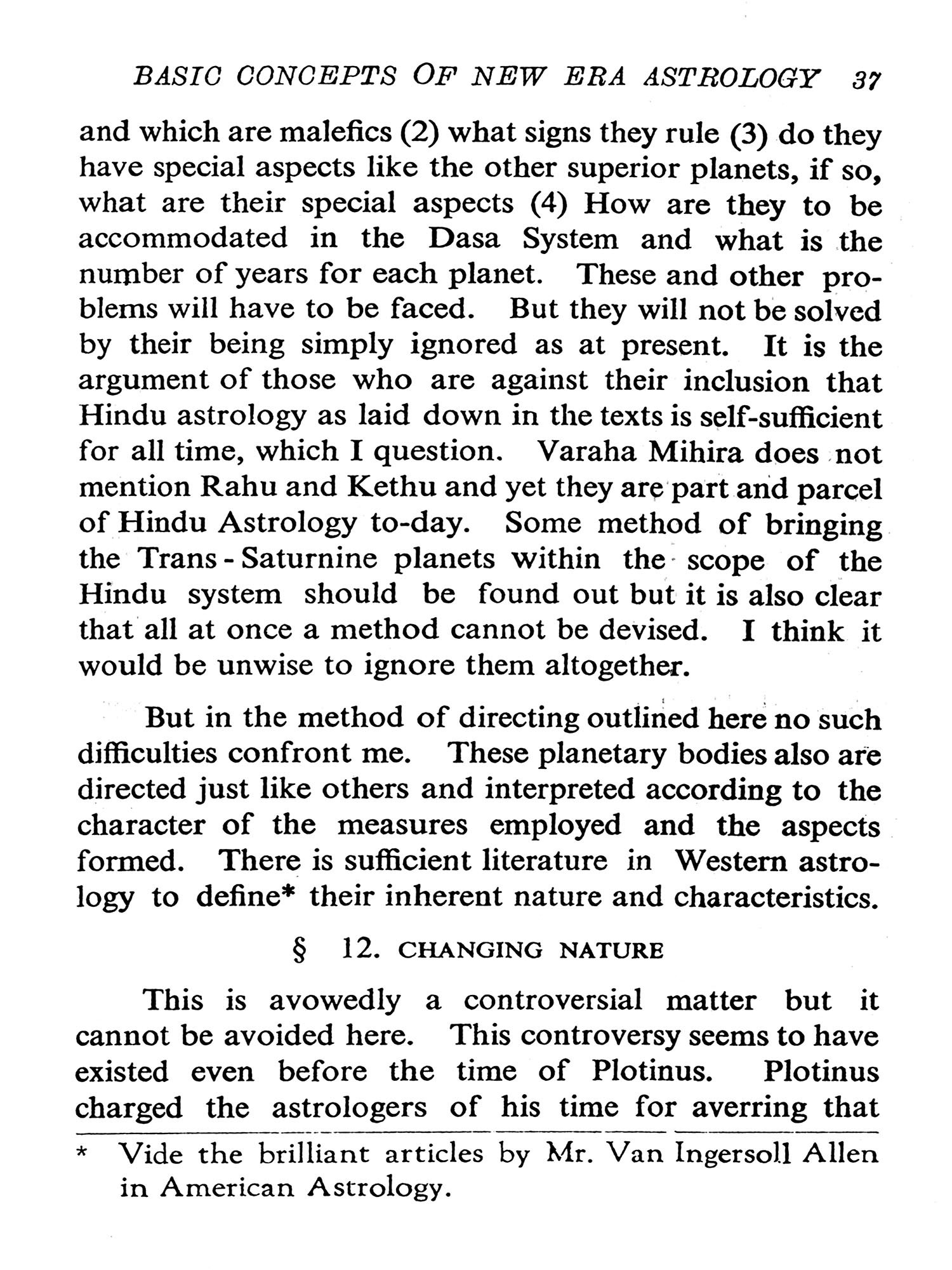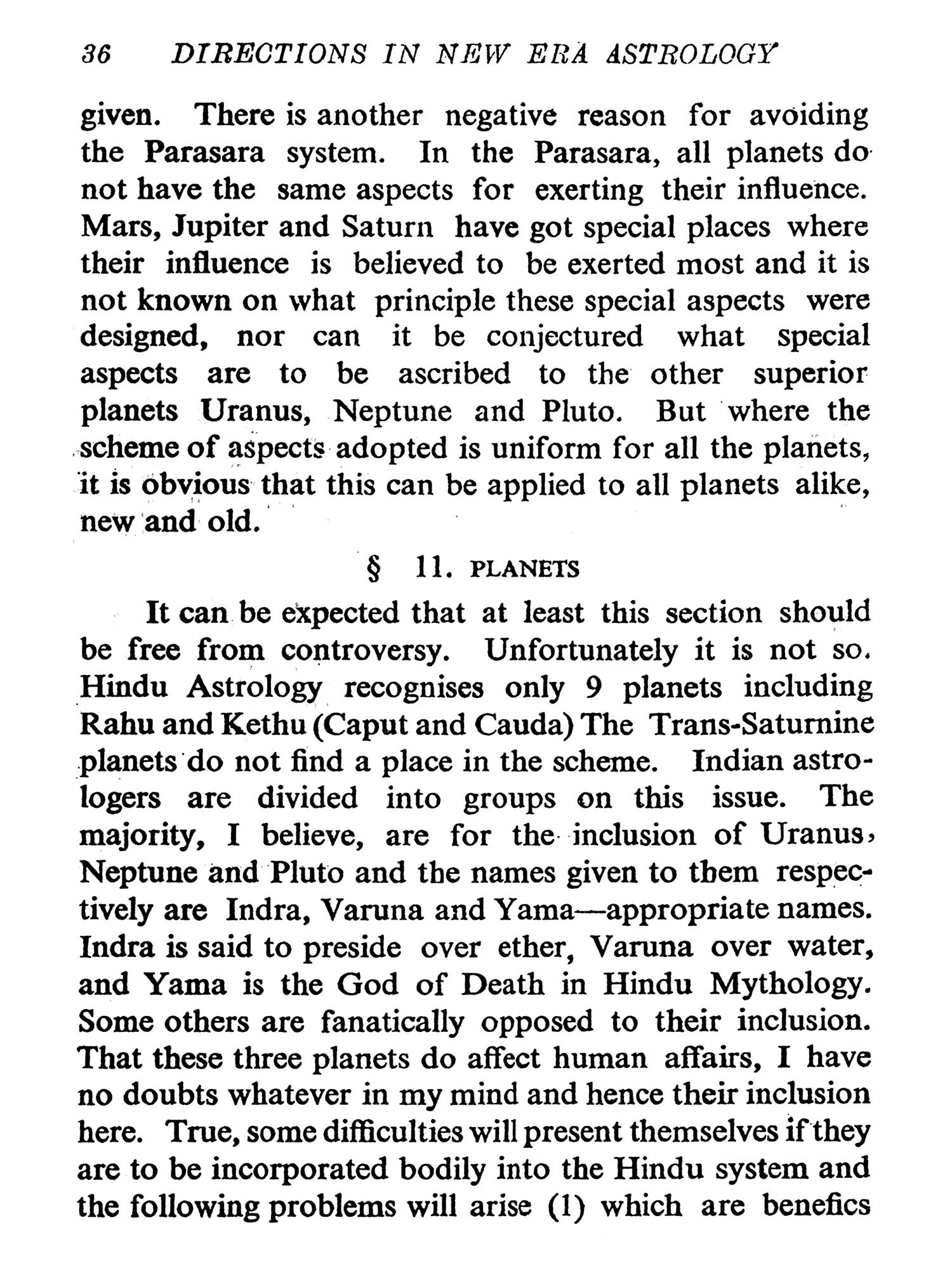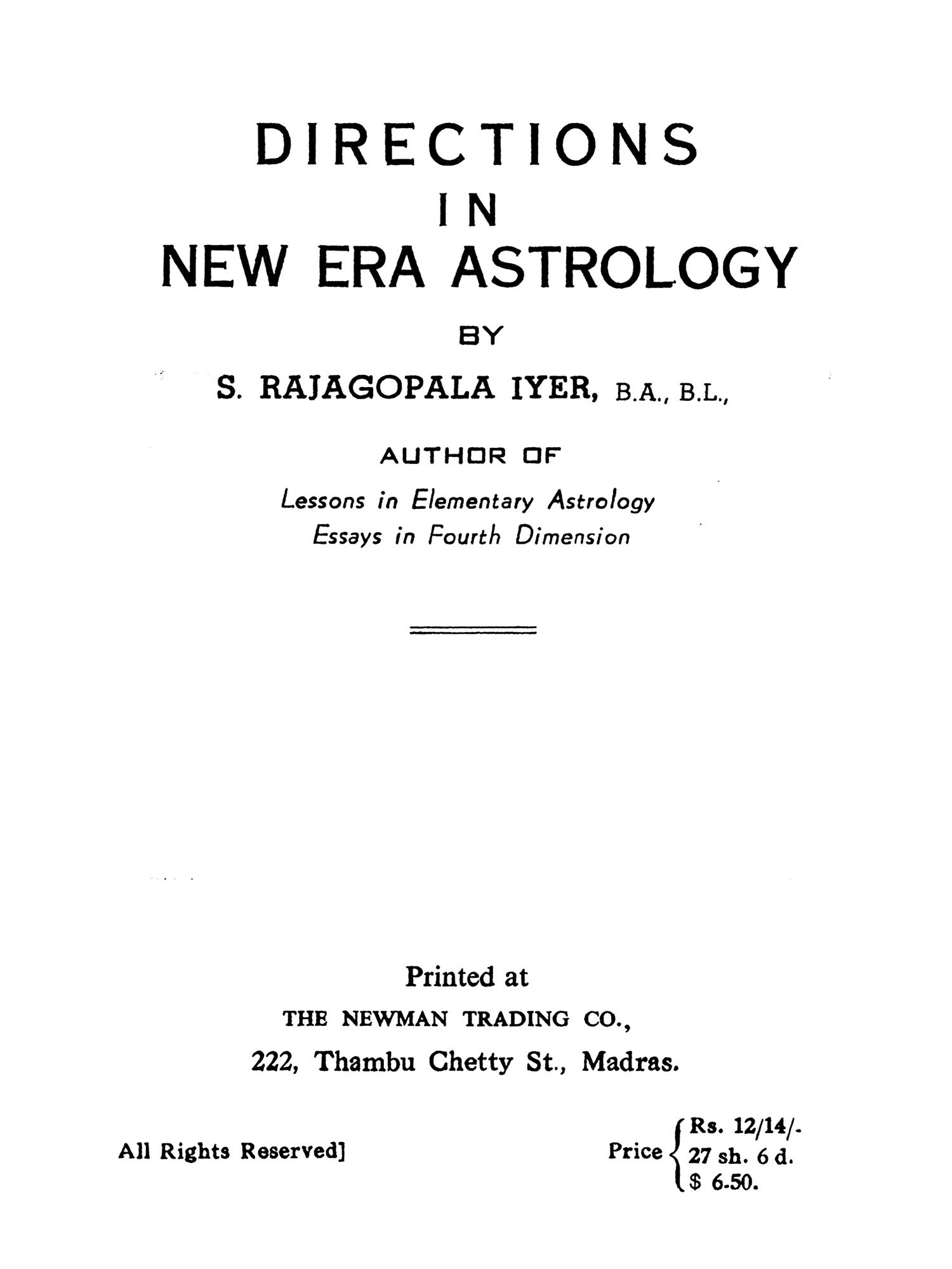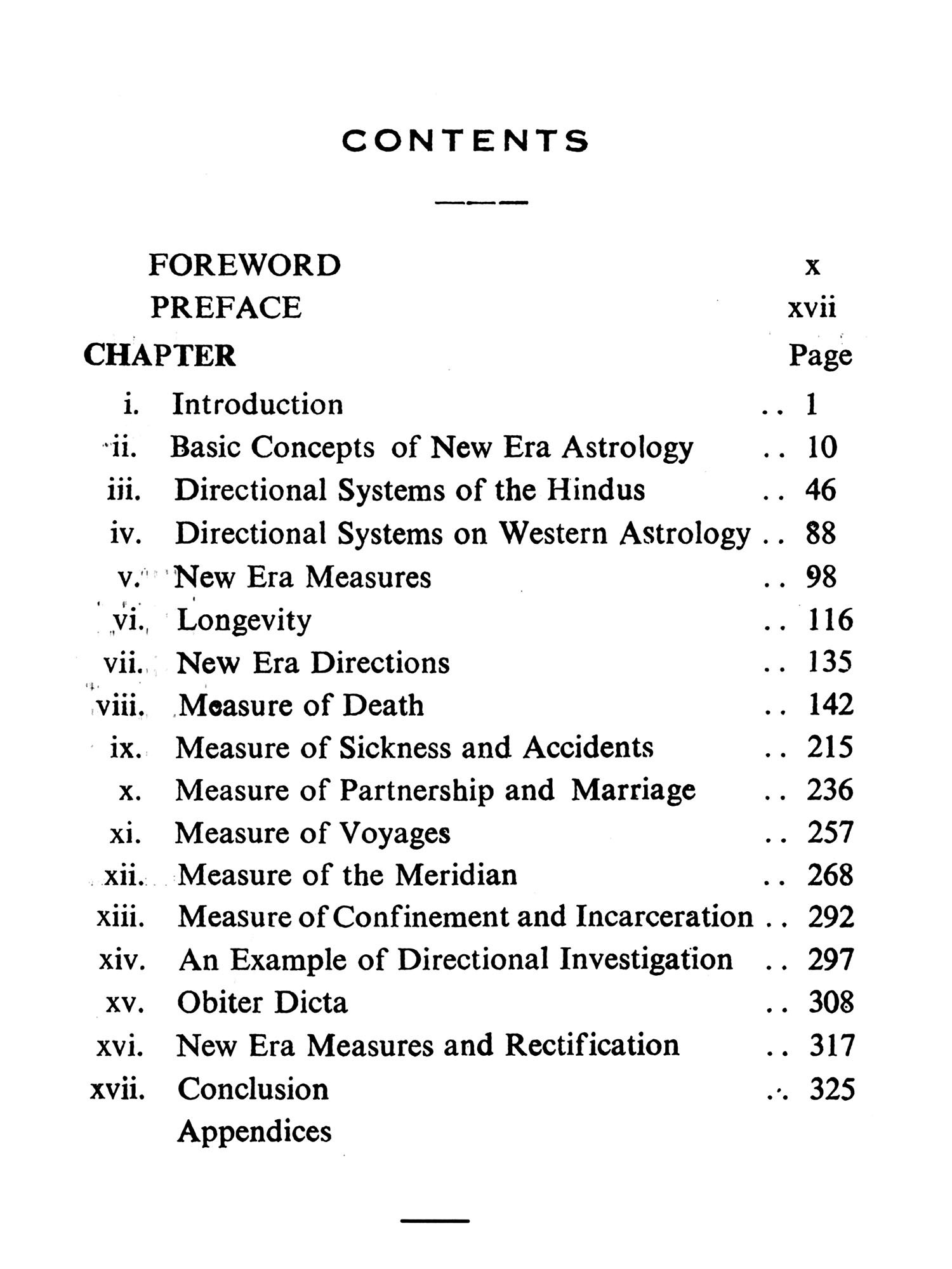But astrologers employ other methods of making predictions which come under the heading of symbolical Prognostication. These include Directions (Primary and Secondary), Arabic Progressions, the Indian Dasa Systems, and Symbolics proper. Primary directions are related to the Mundane sphere and not to the ecliptic circle. Claudius Ptolemy, the disputed author of the Tetrabiblos in which the theory is first expounded, believed that the planets at birth left a permanent impress of their influences on the positions they occupied in the mundane sphere (i.e. in the Bhavas or "Houses"). Suppose birth occurred at sunrise about the time of the Vernal Equinox (March 21st) when Mars was precisely on the upper meridian (Midheaven) the Sun being on the ascending degree. According to this theory the influence of Mars irrespective of its zodiacal position is indelibly impressed on the midheaven, as that of the Sun is impressed on the eastern horizon. Six hours after birth would be noon, when the Sun would have come to the upper meridian (culminated) and hence it would be mundanely in conjunction with Mars; and as Ptolemy believed one hour of equinoctial time to be astrologically equivalent to IS years of life, then the effects of this direction would operate in the native's 90th year. The secondary method is on all fours' with the primary except that directions "In Zodiaco" are made to the ecliptic degrees occupied by the natal planets. Assuming a life span of 120 years all possible directions would occur within some eight hours of birth, Ptolemy's method of effecting these directions by proportion of semi arcs is open to serious mathematical objections. R. C. Smith (the first "Raphael") very logically suggested that such directions should be made under the Poles of the significators but Sepharial's formulae for computing these Poles is trigonometrically inaccurate. Inci-dentally these systems were never popular since they called for at least a working knowledge of trigonometrical functions, apart from the fact that they were laborious, tedious and time-consuming. The system most popular in the West, and still in vogue, is the Arabic method of progressions which is based on the assumption that every day after birth is equivalent to one year of life. According to this theory if the Sun and Jupiter come into mutual conjunction 30 days after birth, then the wonderful effect of this configuration would be experienced in the native's 30th year. In India the Dasa system of predicting by planetary periods is in popular use. As the method is explained with much detail by our author in this book it is not necessary to enlarge on it here.