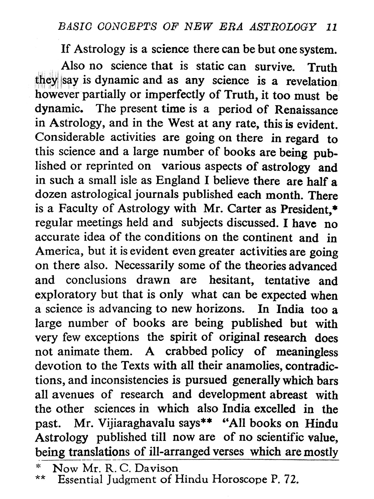 In so far as it relates to genitures prognostic astrology can be divided into two main divisions (1) Natural and (2) Symbolical. The former assumes that the Sun, Moon and planets permanently impress their individual influences on that portion of the circle of the Zodiac that they each happened to occupy at the moment of birth and that the subsequent transits (crossings) of the planets over these natal positions modify these influences. As the dates of such transits can easily be determined from astronomical almanacs or ephemerides-computed many years in advance, or by the direct observation of the night skies, the astrologer has at hand a direct means of making and timing a prediction. Suppose by way of illustration, a person was born at 0h 39m a. m. G. M. T. on July 25, 1920. On this date and time, the planet Venus was in exact ecliptical conjunction with the fixed star Asellus Australis ("The Southern Ass".) Catalogued as Delta Canceri and situated in 13° 54' of the constellation Cancer. Tradition affirms and empiricism confirms that the amatory impulses are in some inexplicable way bound up with this planet. Tradition and empiricism also attest that Jupiter is the bringer of joy and Saturn of sorrow. Had an astrologer consulted the 'Nautical Almanac for 1943 he would have found that Jupiter in its course transitted "The Southern Ass." on August 7, 1943 (This transit could not be seen in the night skies, as Jupiter was then a day-star being close to the Sun) that is over the place in the ecliptic occupied by Venus at birth, and he would have been safe in predicting that the native would be successful in his love affairs at this time, and Cupid would have brought him great joy? On the other hand had he scanned the night skies immediately after sunset of July 1st 1947 he would have seen that Saturn was close to "The Southern Ass. " and he would know that the native was then meeting with disappointment and reverses in his love affairs and all was not too happy in his domestic circle.