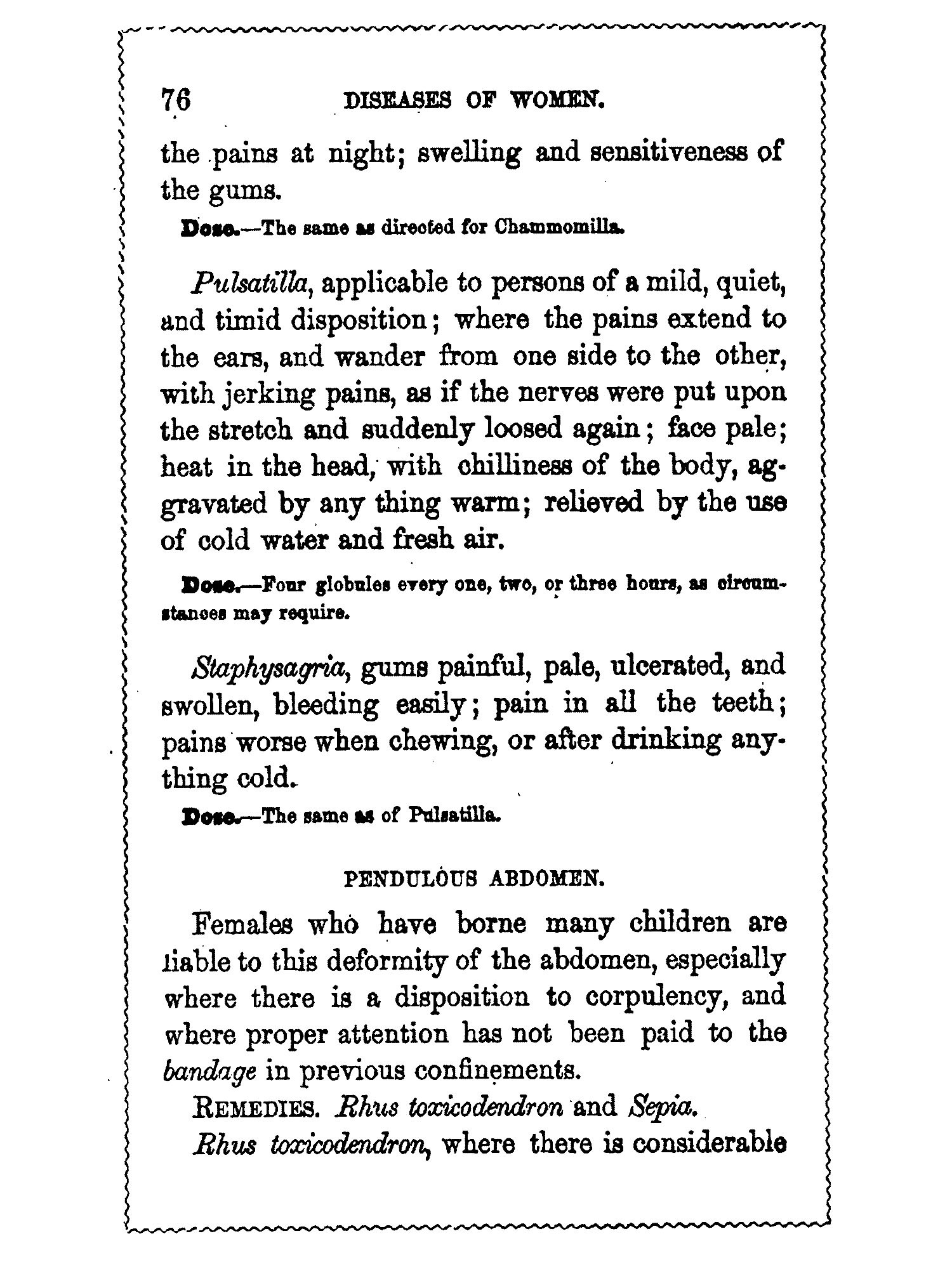 A FEW years since, several of my personal friends, having expressed a wish to have some instructions concerning the diseases of females, and the conduct to be observed during pregnancy, labour, and confinement; and also directions for the management of new-born infants, in accordance with the principles of our school; I was induced to prepare for the press, a short treatise on the Homeopathic treatment of the diseases of females and children. Several subjects and diseases were introduced which were not contained in works published before that time. The first edition is now exhausted, and the call for a second, is accompanied with a request to include the general diseases incident to childhood and youth. Those additions have been made in the present edition, and the dose, repetition, and mode of administration, affixed to the indications for each remedy. The book is not written for criticism, but in the hope that it may be useful in the treatment of the various diseases mentioned, it is offered to the public.