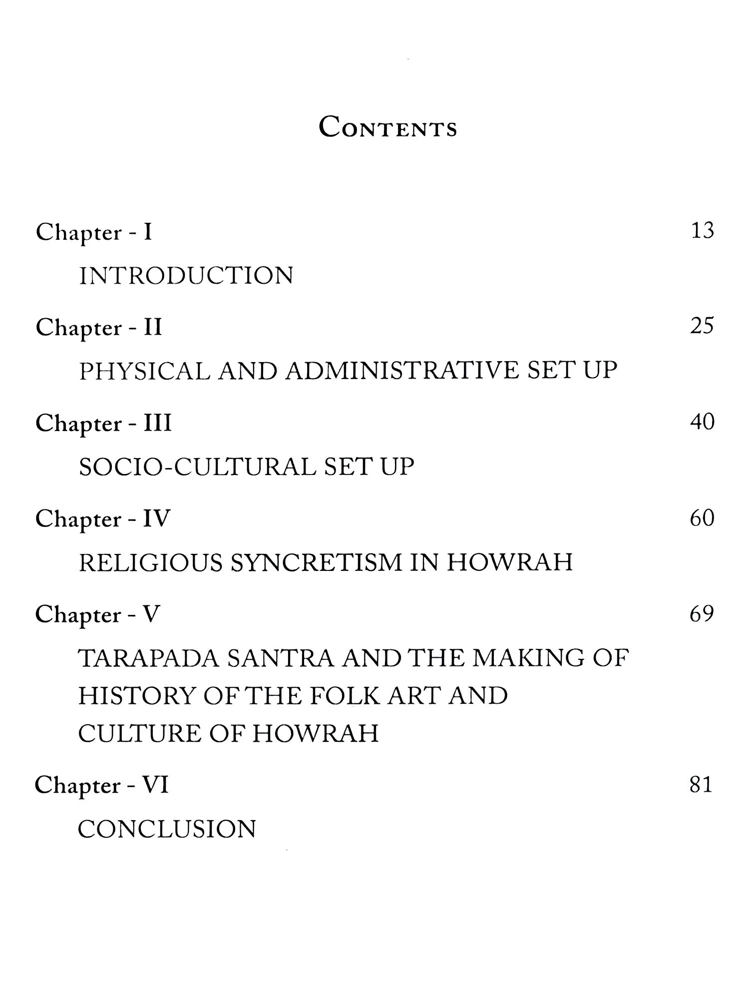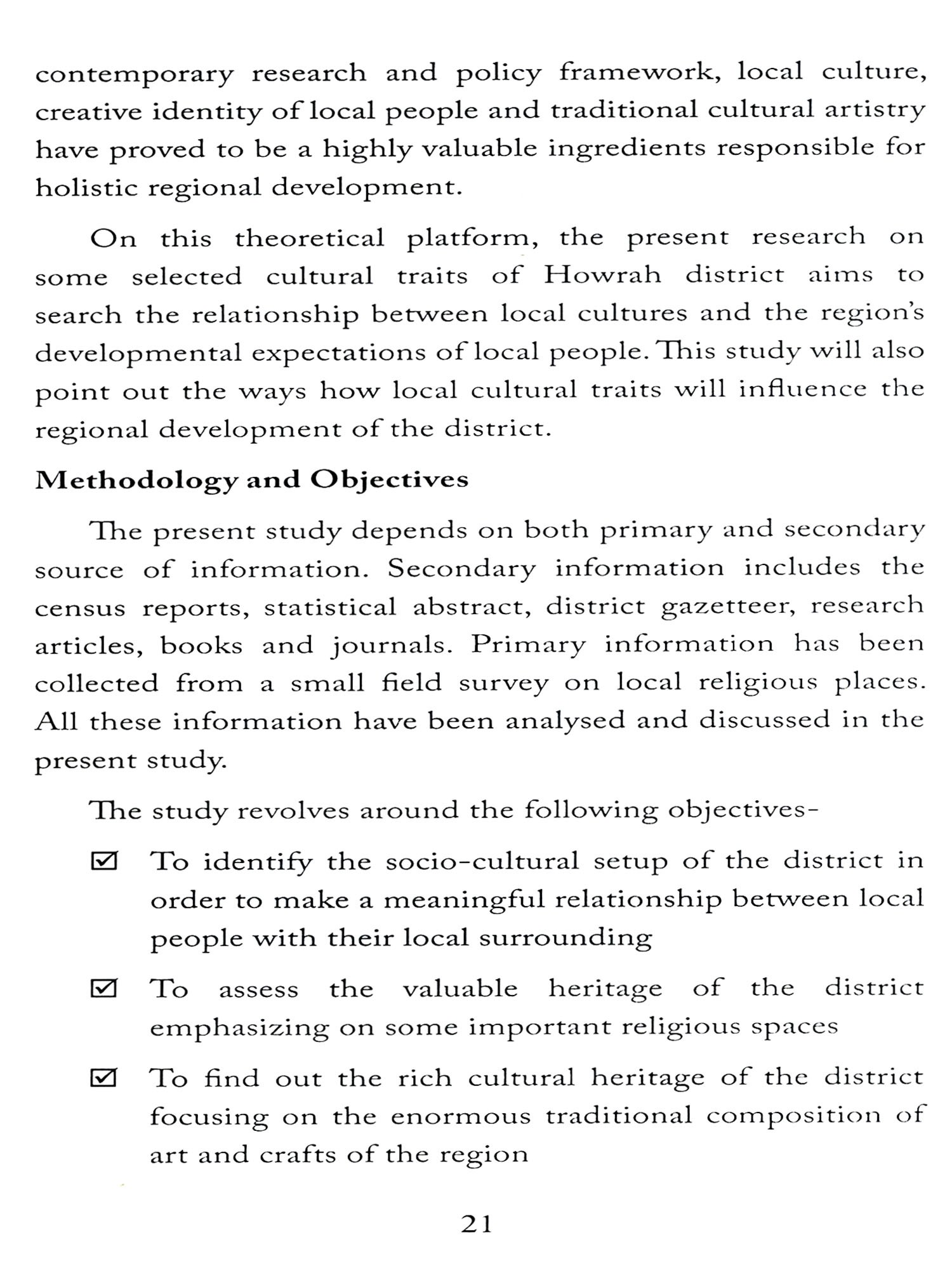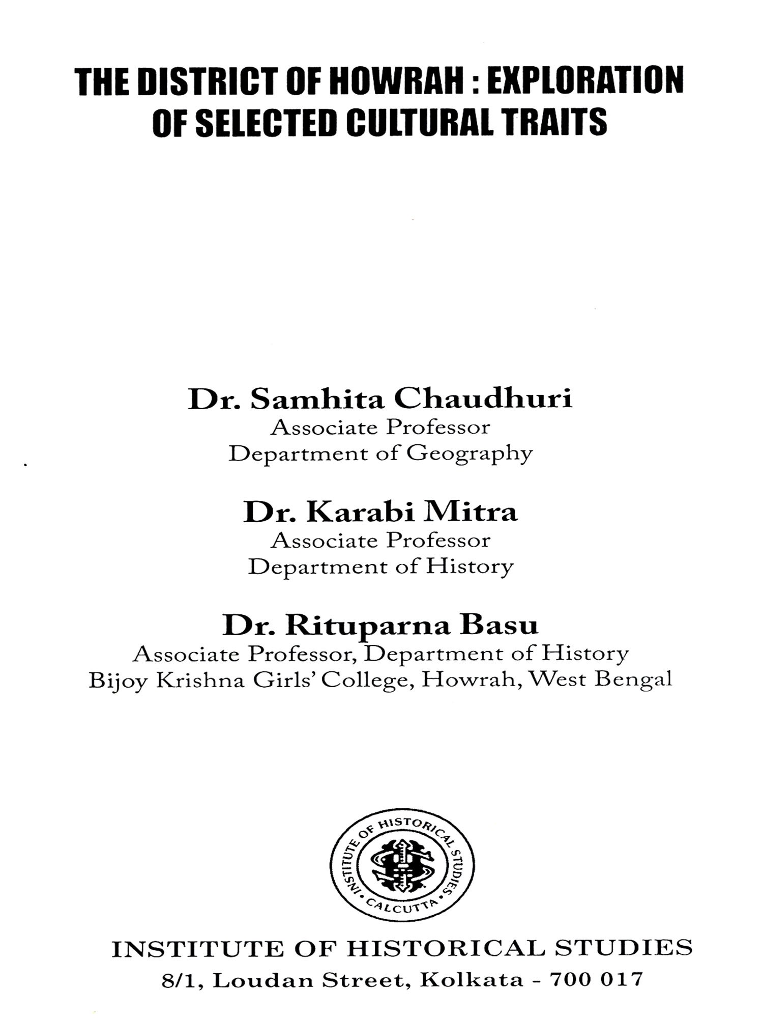 This study of Howrah district revolves around the making of a cultural identity of the region which is achieved through age-old traditions of various cultural parameters unique for the district. Glimpses of these cultural elements of different parts of the district will help to manifest its historical endowments, geographical diversity, cultural assimilation in creating a gorgeous identity in contemporary period. The Howrah district has a rich cultural heritage and an enormous oeuvre of art and crafts that constituted a living tradition.