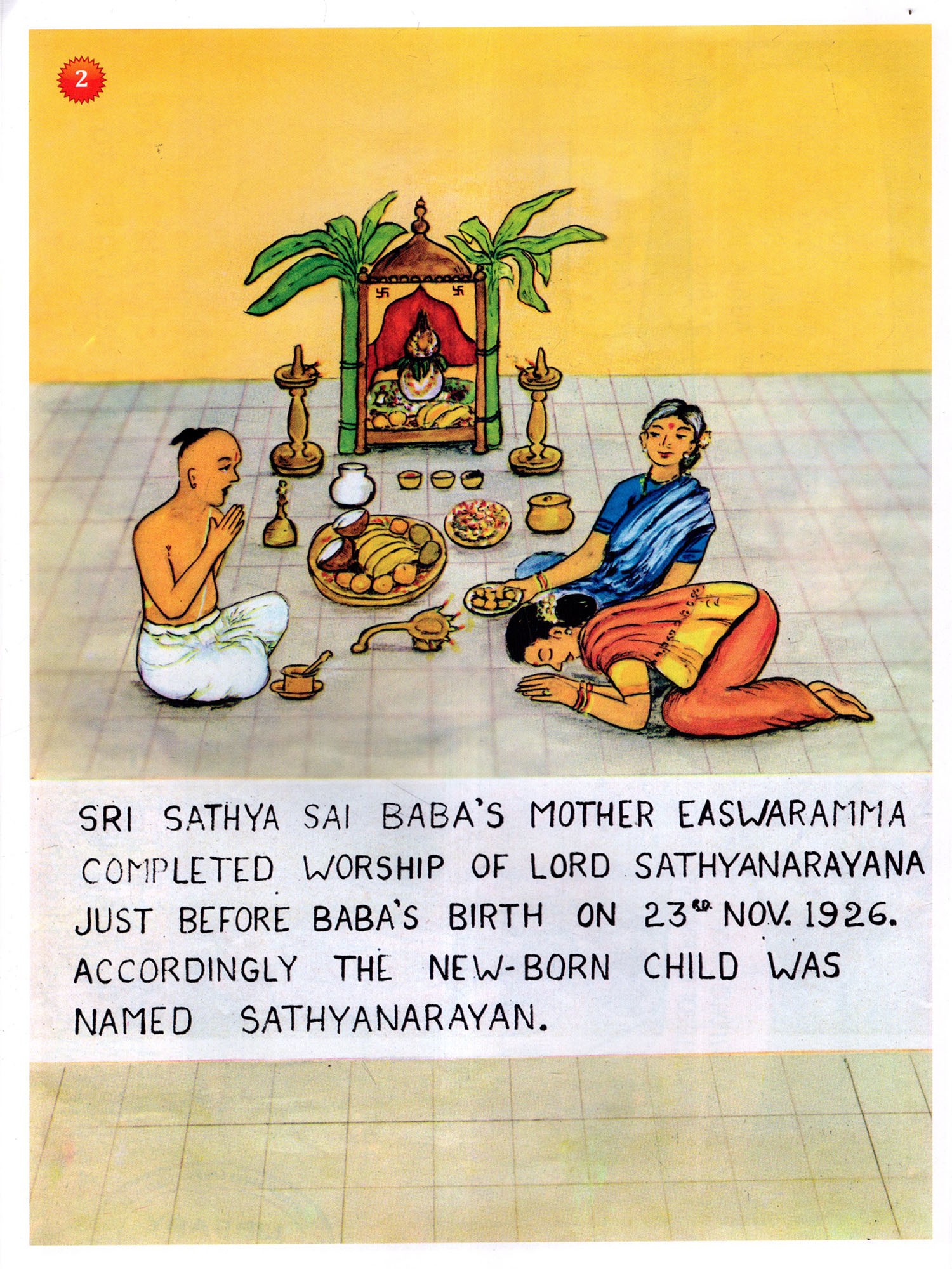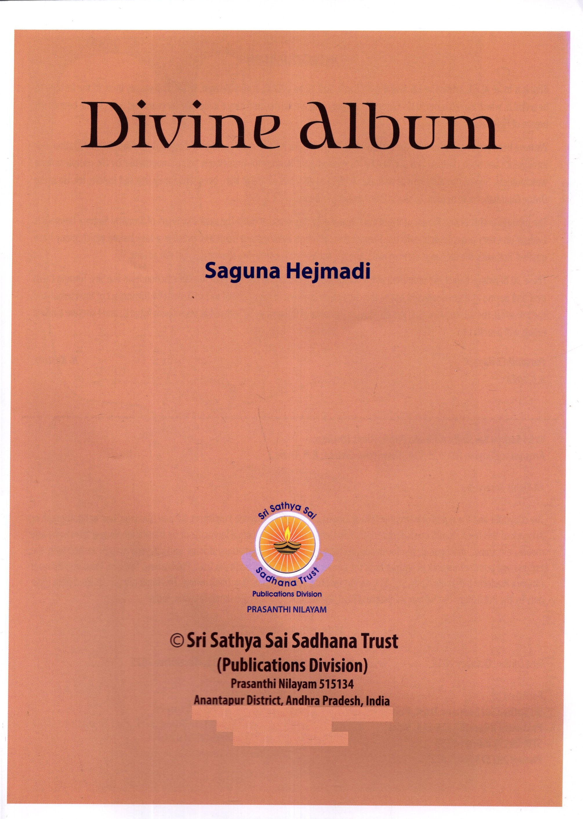 The pictures in this Divine Album of Beauty are inspired by this sense of duty. The maternal heart of Srimathi Saguna Heymadi is evident on every page. To delineate the Divine Leelas through incompetent paint and brush is a tank before which many have quailed. But, with the blessings of Bhagawan, she has succeeded in conveying the message of the advent.