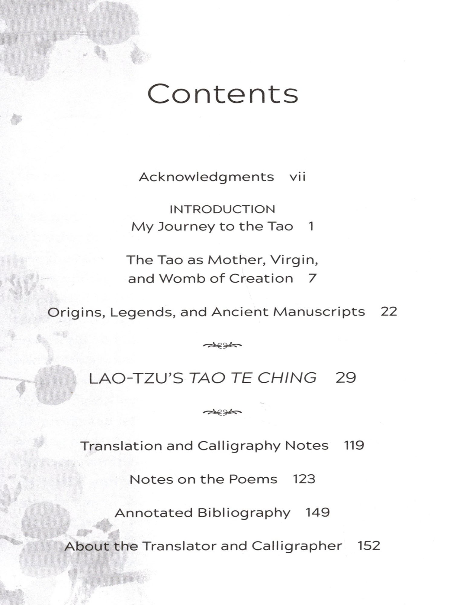 Franslating ranslating the Tao Te Ching has been a work of love. Friends and colleagues have helped me along the way. Among them is Paul Goodberg, my spiritual teacher for some twenty years. His companionship and spiritual training in esoteric traditions from central Europe and Latin America was invaluable to me because he would ask questions I would never have thought to ask, which inevitably invited me to deepen my understanding of the Chinese text. Paul also introduced me to my editor, Linda Sparrowe, who helped me revise the introductory chapters and book proposal and introduced me to my publisher. Paul and Linda's enthusiasm for my translations of the poems never wavered.