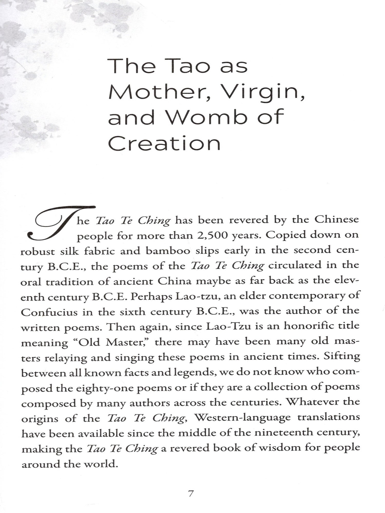 To my surprise, I discovered that the Tao was profoundly feminine! Never could I have predicted that because, in the English translations I read, the Tao is commonly referred as "It" throughout the poems. How could so many translators, almost all men, not have noticed that the Tao is consistently referred to as "mother," "virgin," and "womb of creation," all of which are clearly feminine and hardly gender neutral? Only in a rare poem do a few translators refer to the Tao as "She" when the reference to "mother" or "womb" is blatant. Therefore, as I continued to translate the poems, I kept asking myself, "Am I really the first to notice that the Tao is feminine throughout the poems?" English translators typically determine gender by the context provided in the Chinese text rather than by gram-mar, so how could nouns like "mother," "virgin," and "womb" not signify a Divine Feminine Tao? My friends could not understand why I was so surprised. They just said some version of "Just the same old thing. Why would other translators want to recognize a feminine Tao and challenge the general consensus about the correct pronoun to use?" But, having recognized the Tao in this intensely feminine way, I could not possibly refer to the Tao as anything other than "She." There was no going back. You will see what I mean in the next chapter.