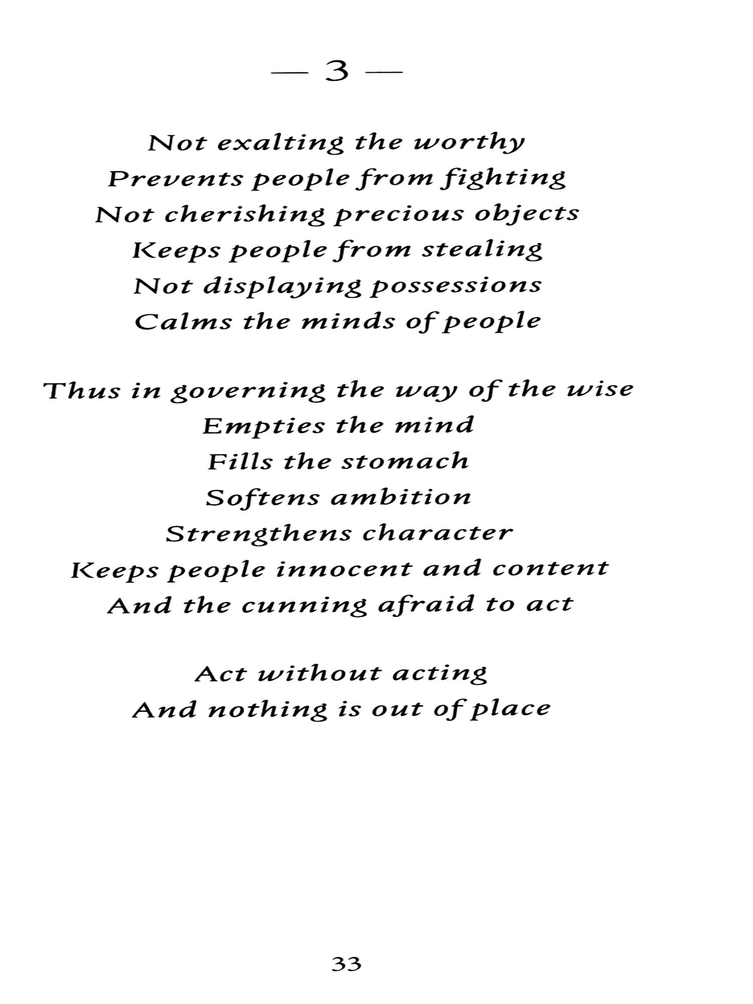 Since wei wu wei is an essential lesson of Lao-tzu's Tao Te Ching, this on-the-ground learning gave me the experiential and embodied understanding I needed to translate the text into English decades later. In fact, wei wu wei was invaluable to me first as a reader and then as a translator-because it allowed me to wait for a poem to reveal itself to me instead of chasing down meanings intellectually or multi-tasking. I had to slow down, turn off my agenda, and listen until a great silence entered my being.
