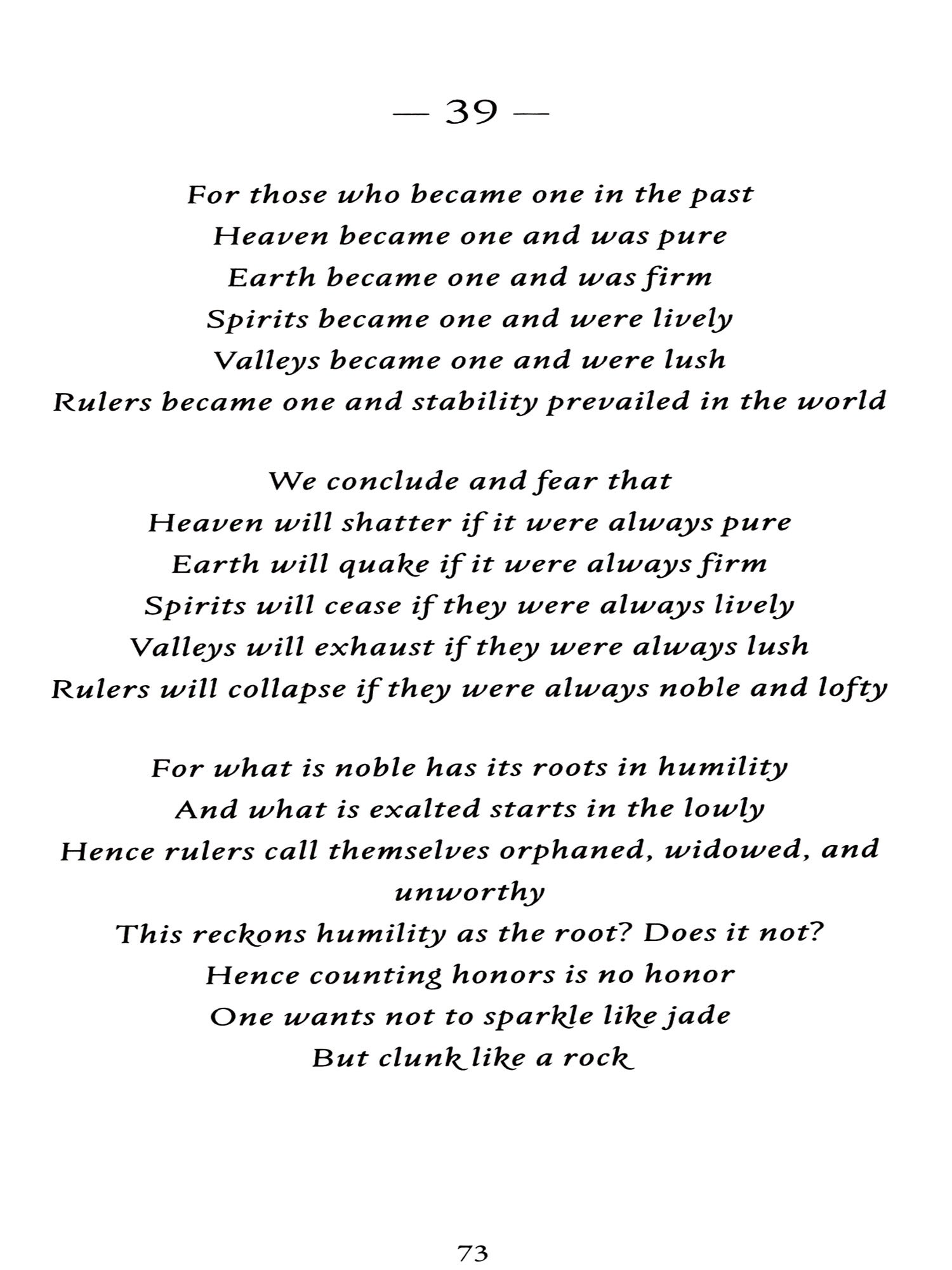 These phrases would flash at me and speak to me intimately. spiritually. However, it was not until I retired that I wondered if I could translate the Chinese manuscript for myself. After all, I could read basic Chinese and scholarly books were now available to help me with the Chinese characters that I did not recognize. Perhaps in translating the poems initially just for my own benefit and delight, I might discover something new in the Tao Te Ching or something new about myself.