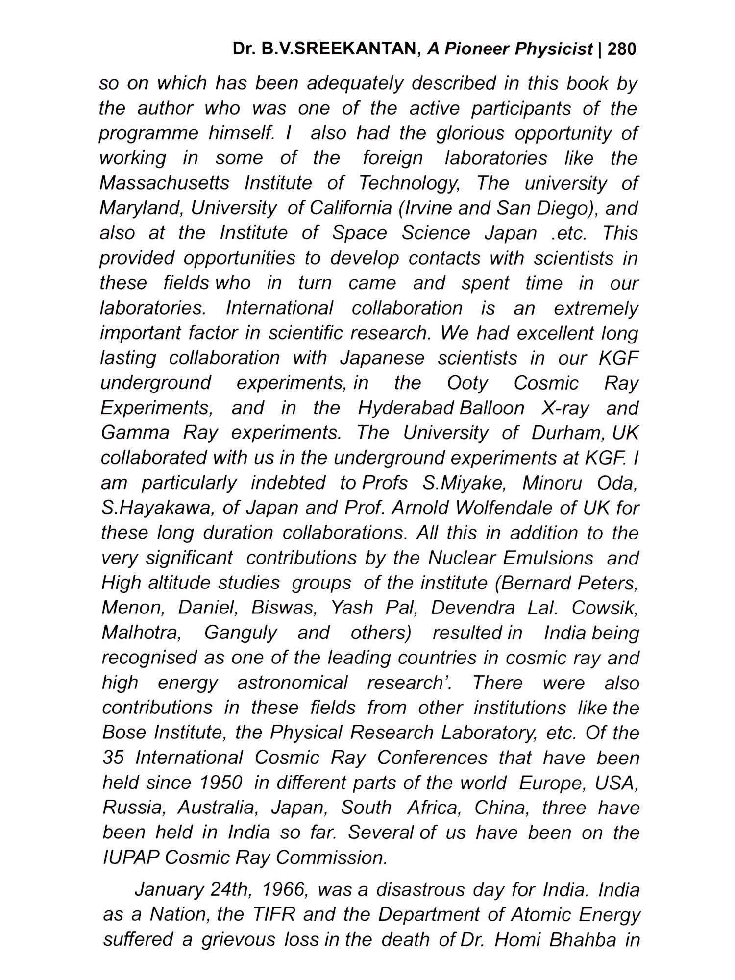 When Prof. S.Balachandra Rao of Gandhi Centre, Bharatiya Vidya Bhavan asked me whether I could write a biography of Prof. B.V.Sreekantan, I mulled over it for quite some time before deciding to really take it up. I realized that this had to be a record of the pioneering activities of a prominent group of a premiere research institution in the country. While doing this the book should concentrate on the difficulties as well as the excitements of a pioneer and his group in a newly independent nation with very few resources. And it should recount how some of those experiments rivaled international efforts also. I asked myself as to who would be the readers of such a book. While there would probably be some historians and some eclectic academics, I wanted that the excitement of doing experimental science should be conveyed at least partially to college and university students. Now it is completed, I am not sure whether the book as it turned out to be has done justice to all these aspirations I had when I started out.