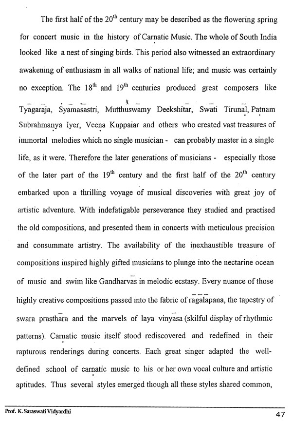 The Indian music being essentially melodic in character, the musical genius of a musician finds a comprehensive expression exclusively through his individual performance as a vocalist or an instrumentalist. He/she is happily free from the need to depend upon a large number of assistants or instruments to achieve musical heights in performance. A singer assisted only by two or three instrumentalists can cast a spell on thousands of listeners by singing extempore. To attend a music concert of South Indian Music is highly aesthetic and spiritual experience for any rasagna. But very few realise that over a hundred years ago the concert was not probably what it is today.