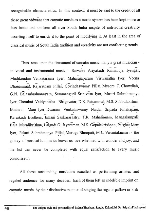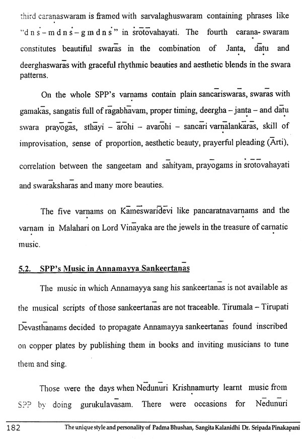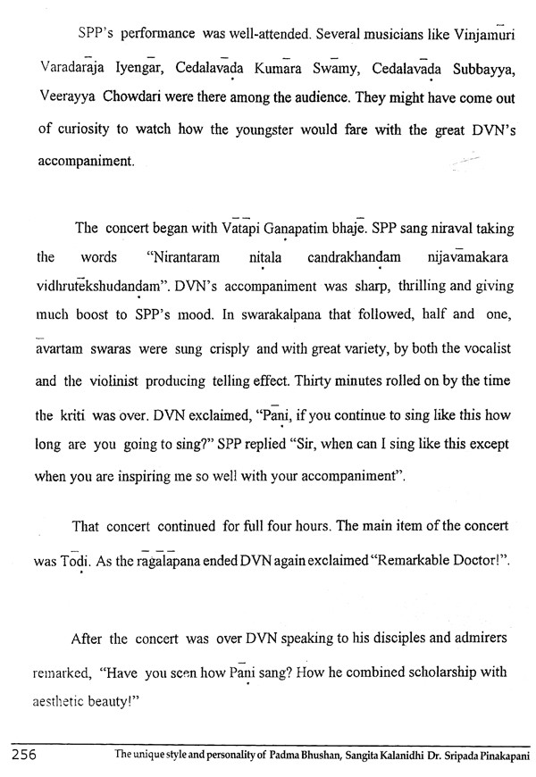 "The unique style and personality of Padma Bhushan and Sangita Kalanidhi Dr Sripada Pinakapani" is the topic for my thesis of Ph.D. In this thesis I tried to throw light on the several aspects of Dr Pinakapani's personality and his music. Dr Pinakapani moulded an intricate style of his own after intensively studying the music performances of eminent carnatic legends like Sarvasree Ariyakkudi Ramanuja Iyengar, Madurai Pushpavanam Iyer, Madurai Mani Iyer, Mudikondan Venkatarama Iyer, Rajaratnam Pillai, Govinda Swamy Pillai, Ranga Ramanuja Iyengar, Veena Dhanammal, GN Balasubramaniam, Semmangudi Srinivasa Iyer etc.
