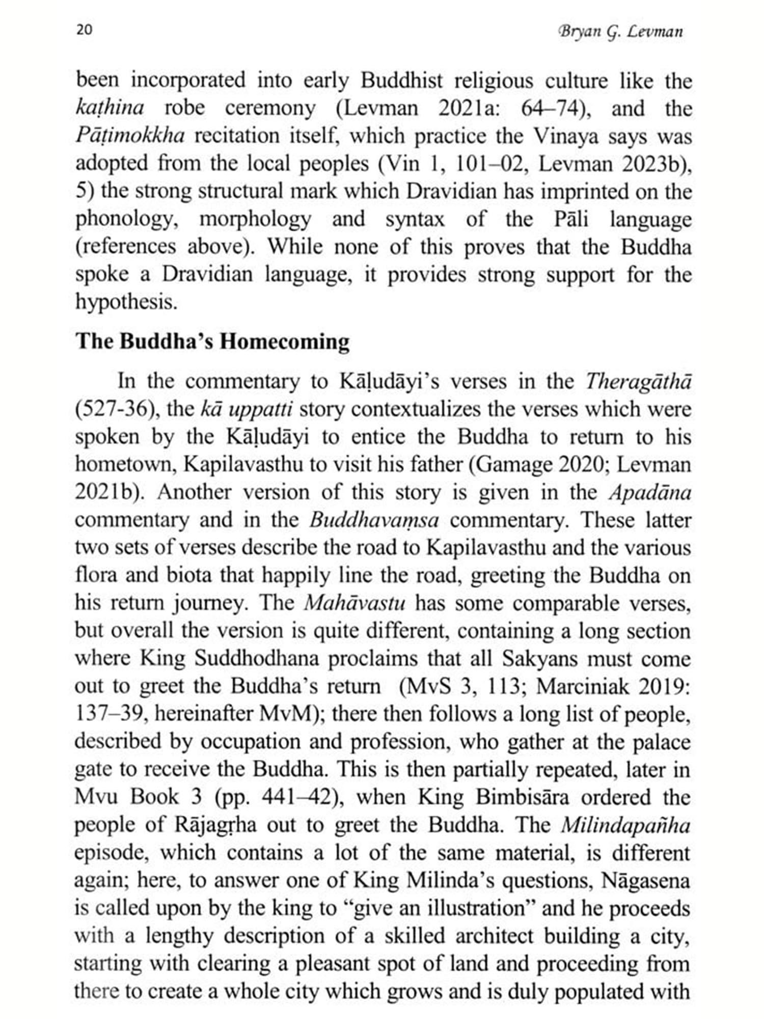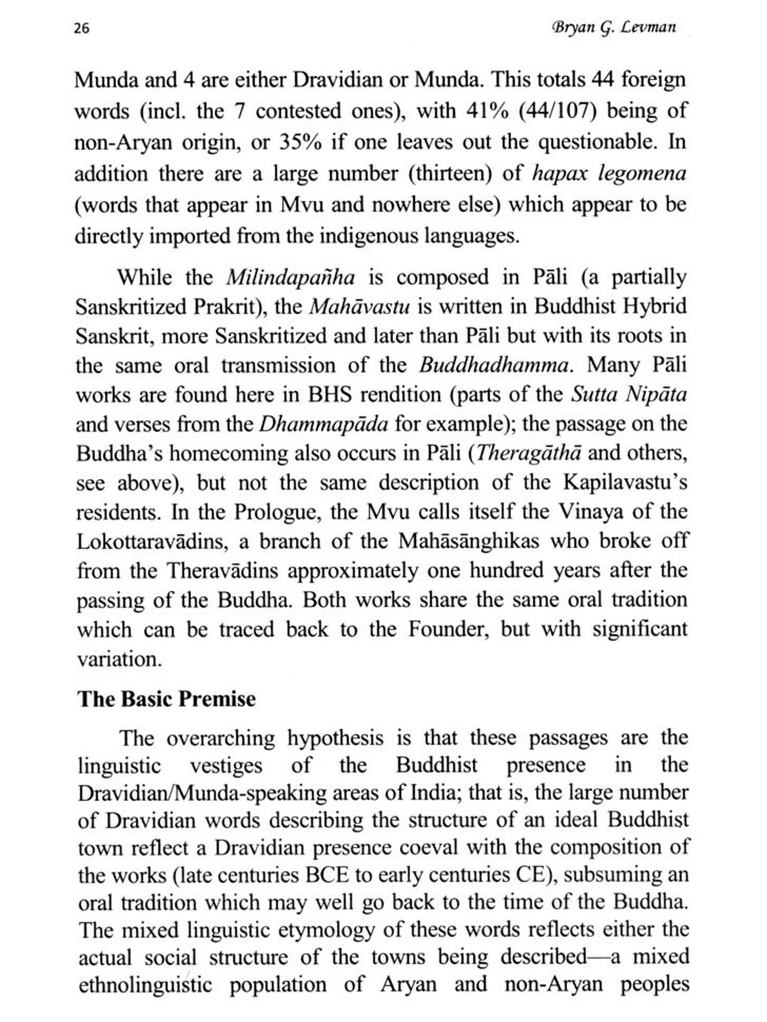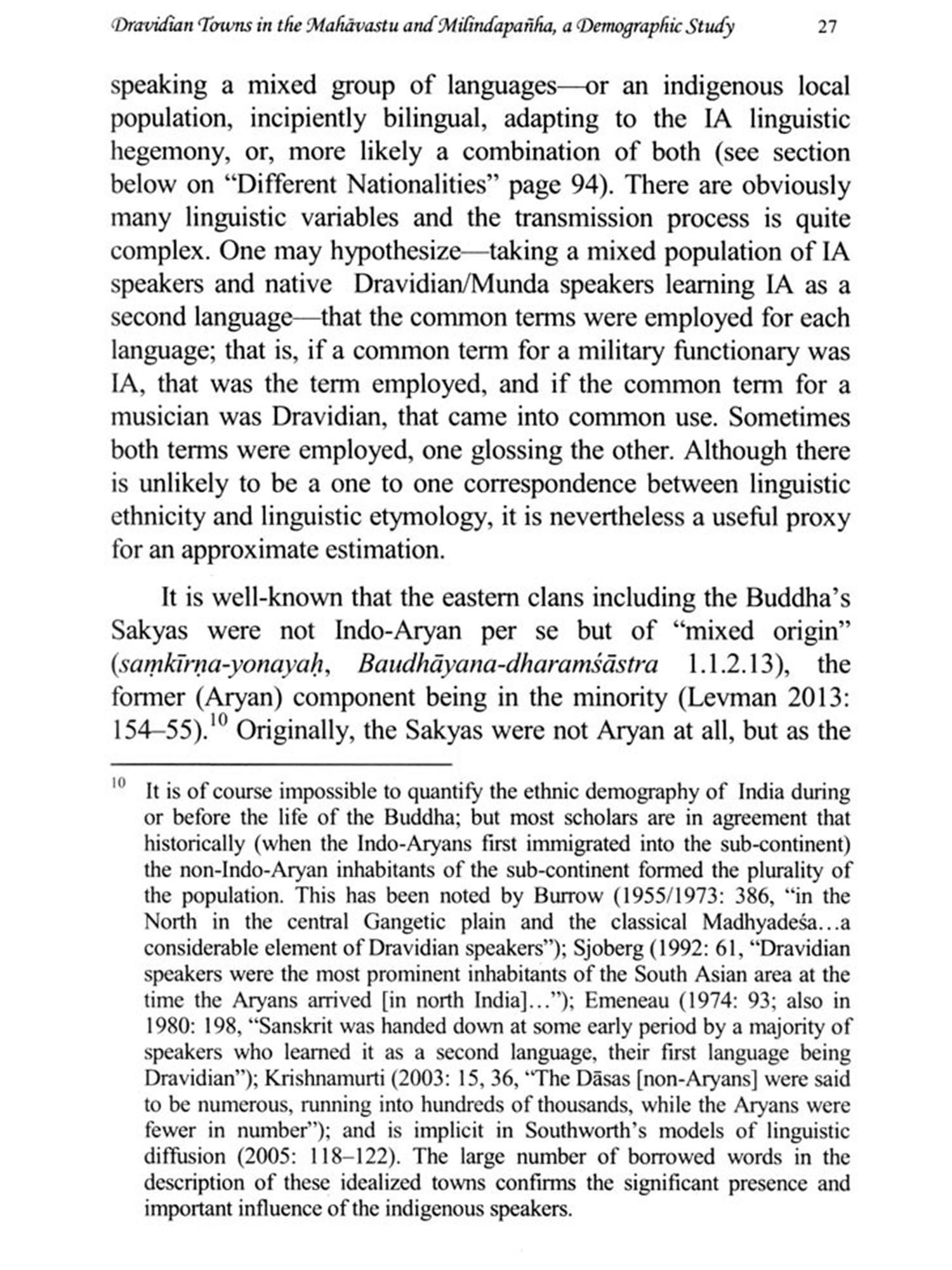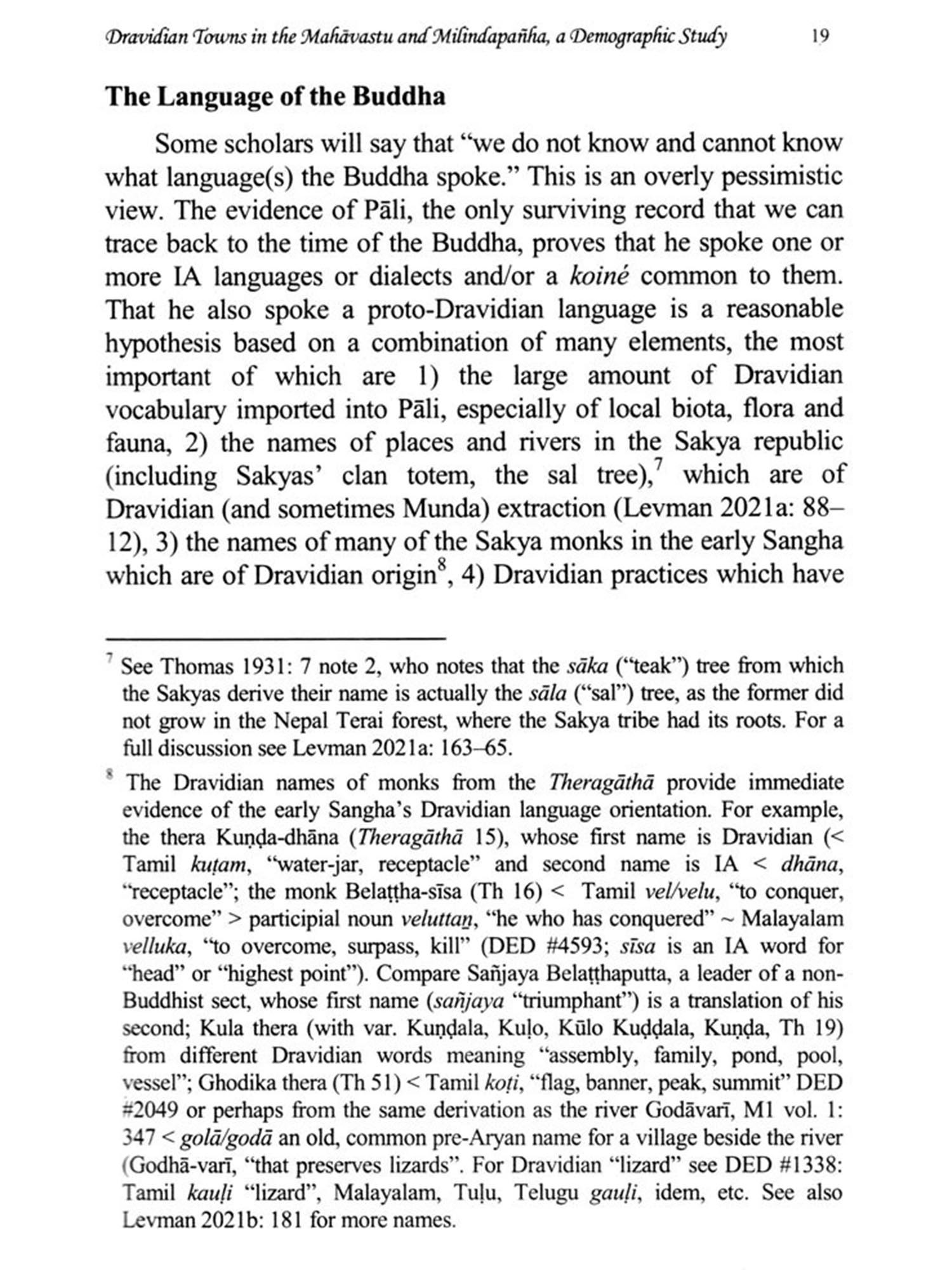 History provides ample evidence that the Sakyas were (historically) a Dravidian speaking clan and that the Buddha taught in both Dravidian and Indo-Aryan (IA) languages. Though Andhra Pradesh (ancient Kalinga) and Tamil Nadu were part of the Buddhist Sangha, it is intriguing that none of the Buddha's teachings and very little Buddhist literature have survived from that time in a Dravidian language (Levman 2023b:74-80). But vestiges of the Dravidian component of the Buddha's teachings may be found in both the Pali canon (Milindapanha) and in Mahavastu, a Buddhist Hybrid Sanskrit composition. In Mahavastu, the residents of the Buddha's home town Kapilavastu are described and Milindapanha describes the residents of an ideal Dhammanagara. Approximately half of the vocabulary describing the towns and their occupants is borrowed from non-IA indigenous language sources. This suggests that the towns' residents were a mixed ethno-linguistic group, consisting of IA speakers and a Dravidian/Munda-speaking autochthonous population gradually assimilating the new Indo-Aryan language.
