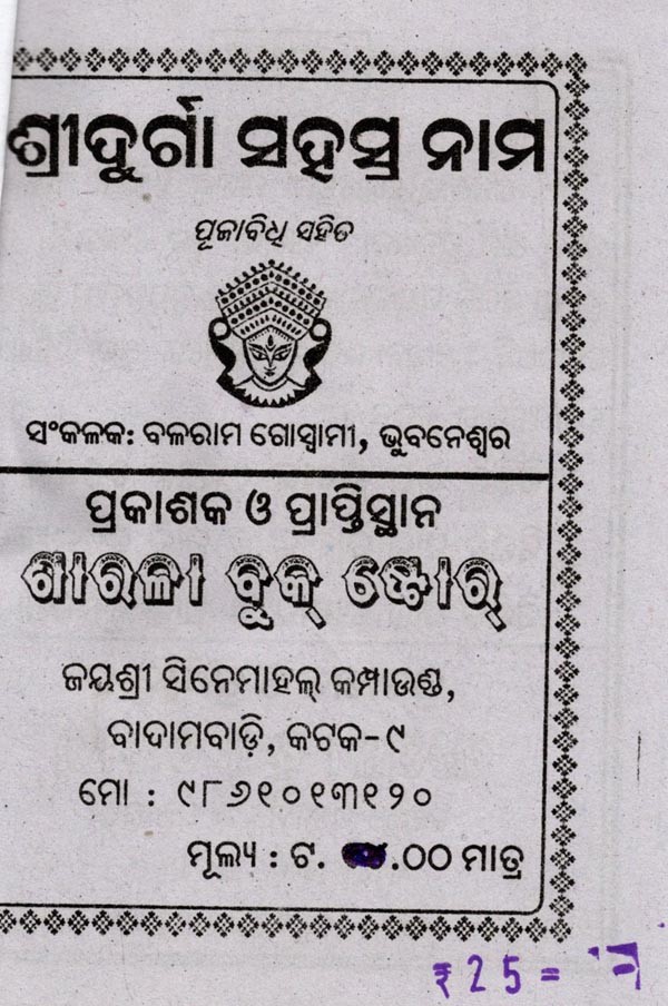 ଶ୍ରୀ ଶ୍ରାଭାମ ସହସ୍ରନାମ- Shri Shri Ram Sahasranama in Oriya (An Old and Rare Book)