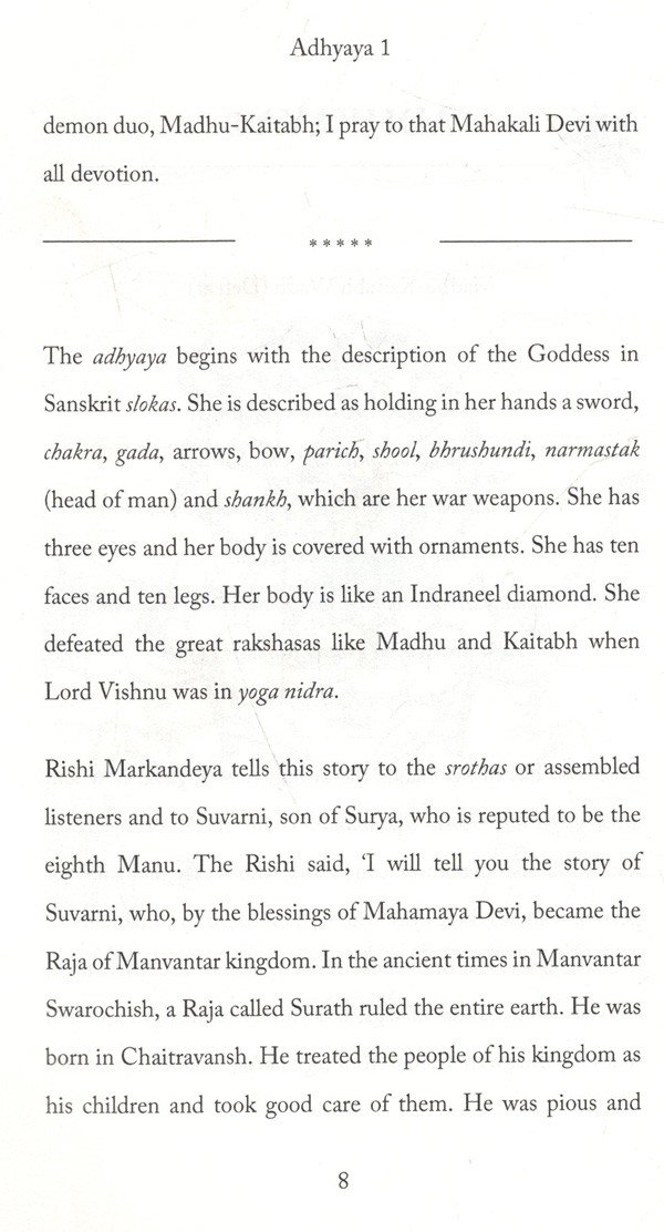The book Durga Sapta-Shati is a mythological story. It is the story of the Goddess Durga who was created to defeat Mahishasura. Mahishasura was a rakshasa (demon) who had defeated the Gods and occupied their kingdom much to their dismay. It is a great story and should be read to understand the power of God, who is not only brave but also merciful and ready to bless all devotees with peace and prosperity. Her qualities of grace are unmatchable, and her might, power and courage are unique and unparalleled.