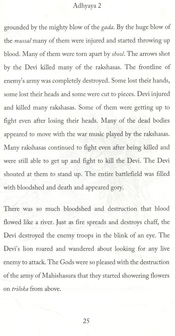 The story narrates in detail, and with great vividness, the mammoth war that Goddess Durga fought not only with Mahishasura and Chund-Mund but also the wars fought between the Goddess and Shumbh-Nishumbh and Raktabeej and their demonic armies. The description of weapons used for attack from all sides and how Goddess Durga effortlessly tackles all such attacks taking various forms in fiery countenance makes for fascinating reading.