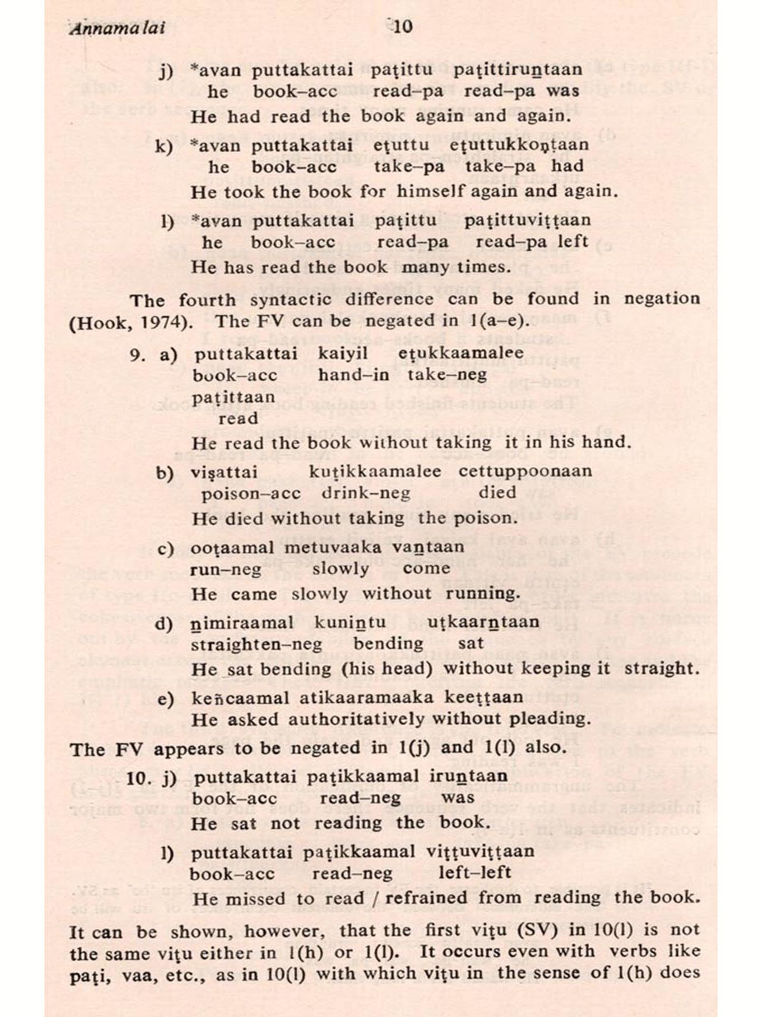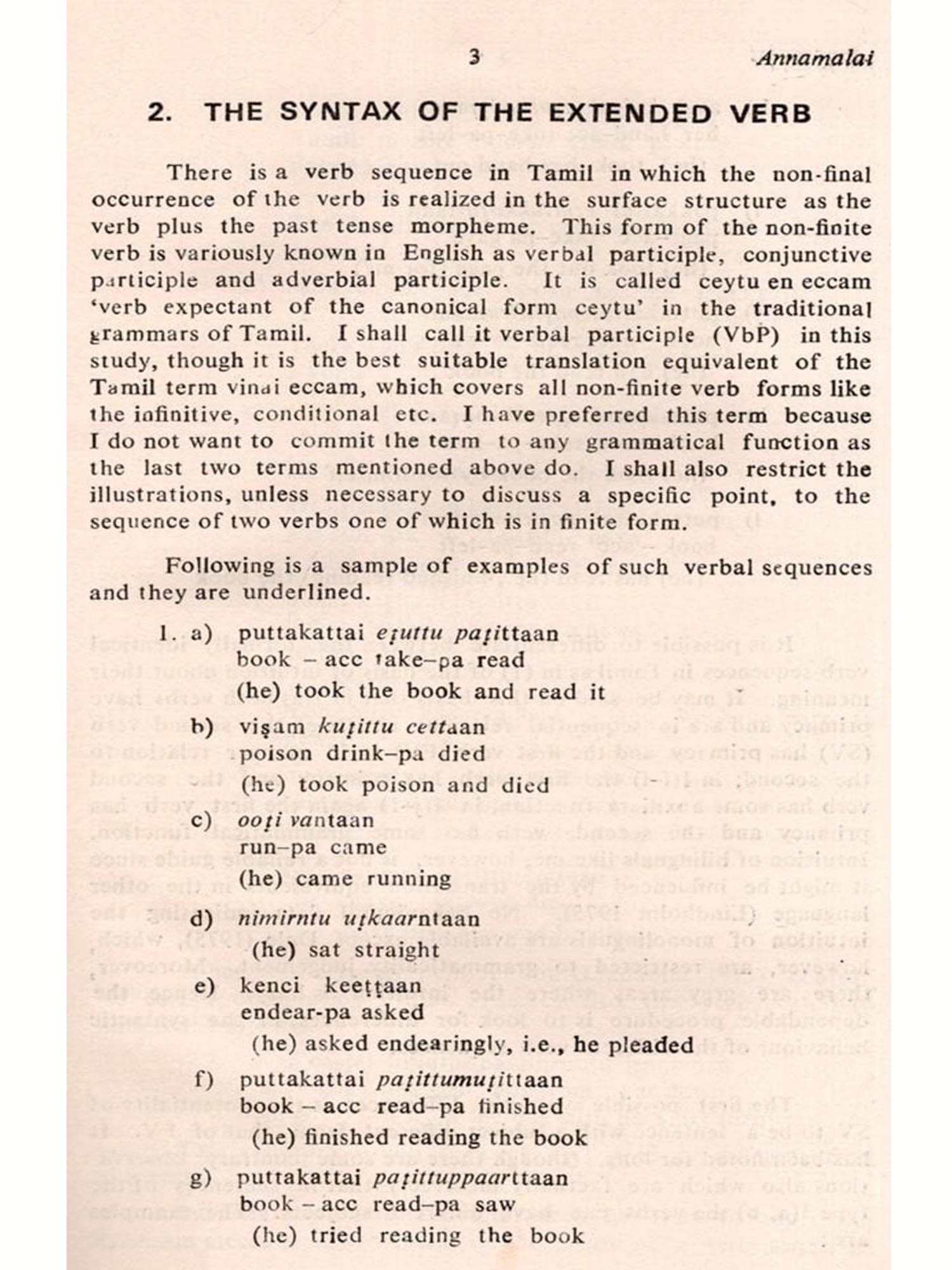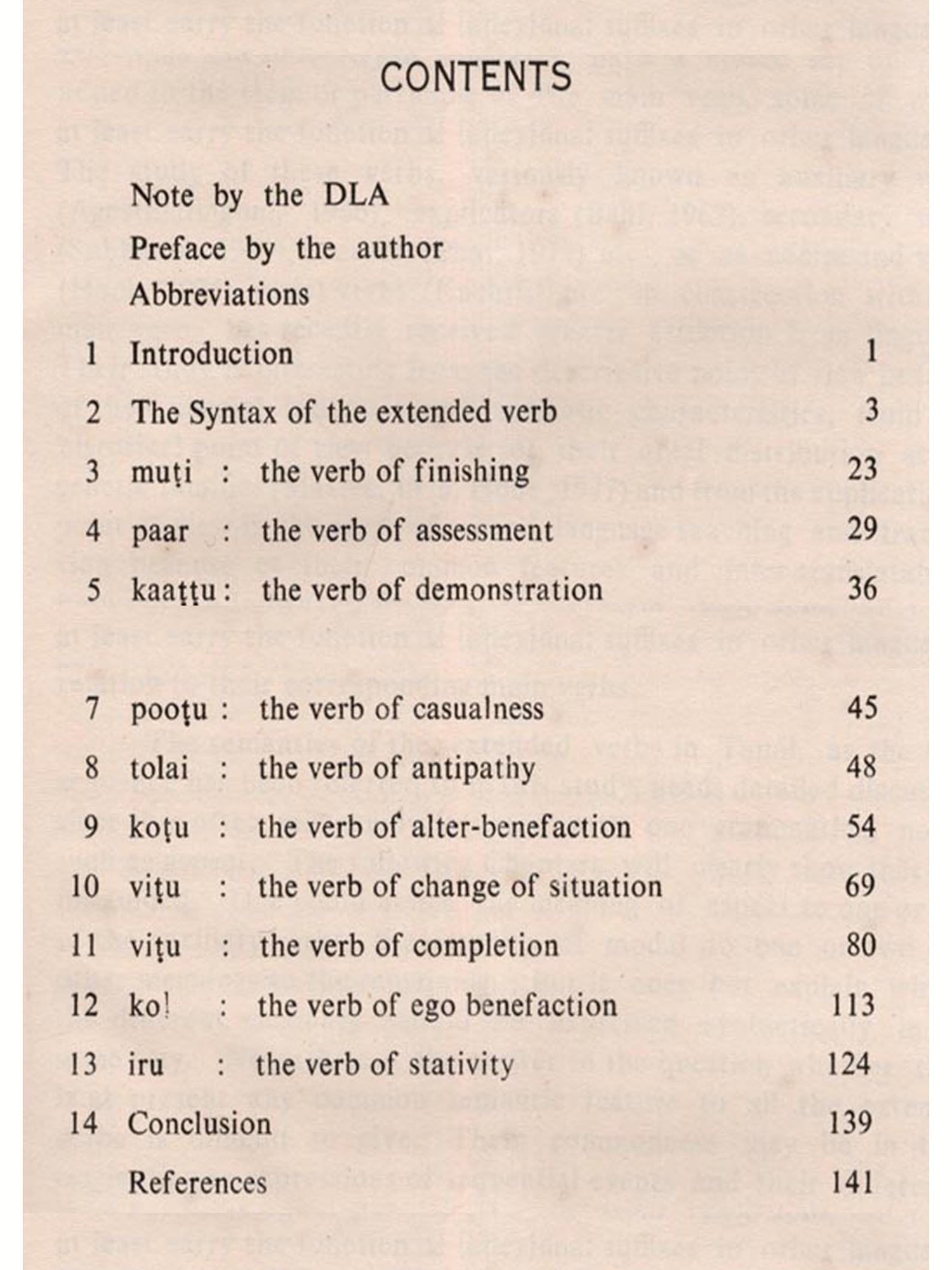 The semantics of the extended verbs in Tamil, as the verb sequence has been referred to in this study, needs detailed discussion since it is often mistakenly equated with one grammatical notion such as aspect. The following Chapters will clearly show that it is misguided. One could assign the meaning of aspect to one or two of the auxiliary verbs, the meaning of modal to one or two and other meanings to the remaining. But it does not explain why all the different meanings should be expressed syntactically in the same way. Nevertheless, the answer to the question whether there is at present any common semantic feature to all the extended verbs is difficult to give. Their commonness may be in their originating as expressions of sequential events and their differences may be in the meanings of the auxiliary verbs each of whose semantic and syntactic development followed a separate course. This would argue that the extended verbs could be better under-stood in a developmental or dynamic framework.