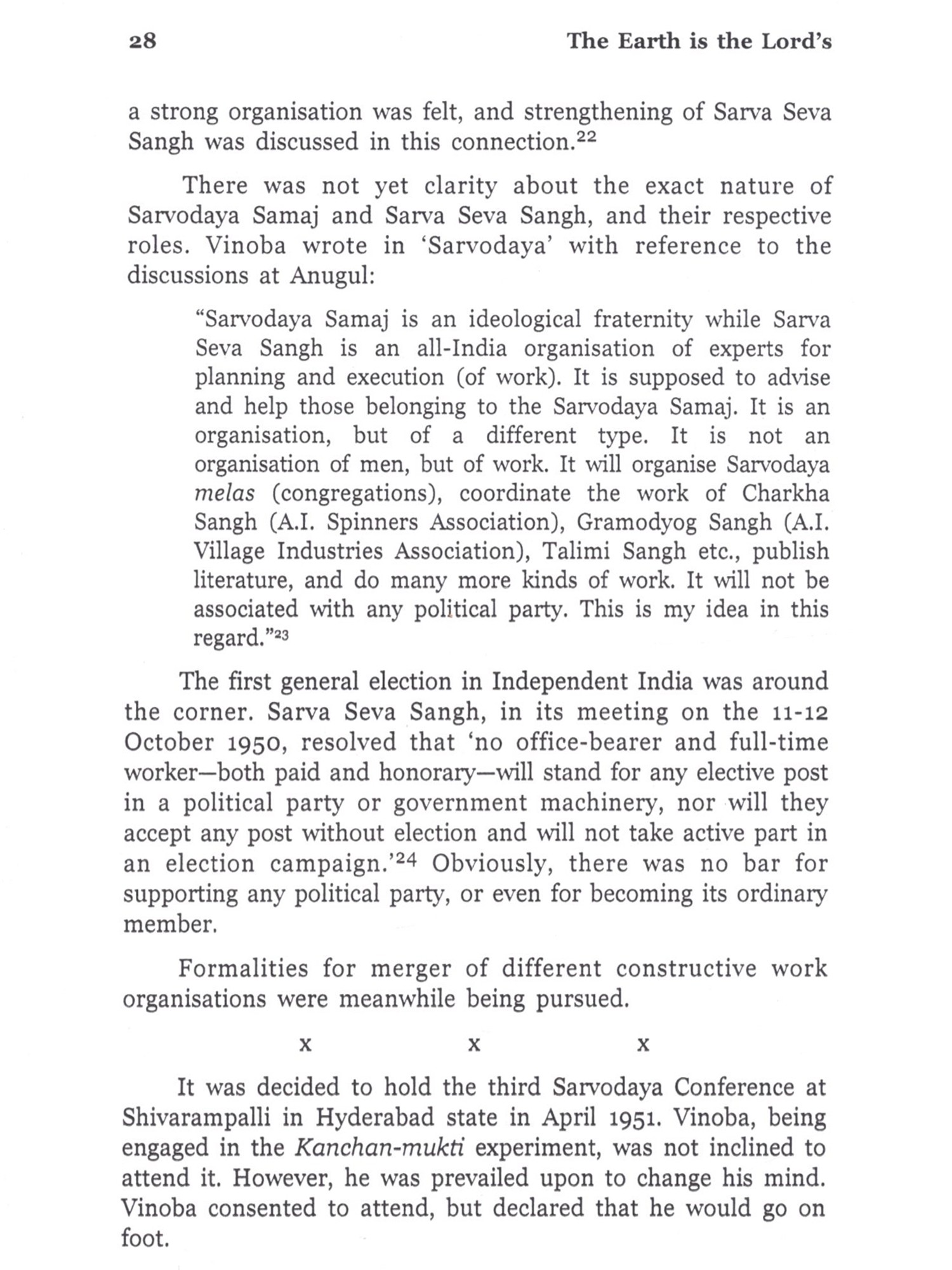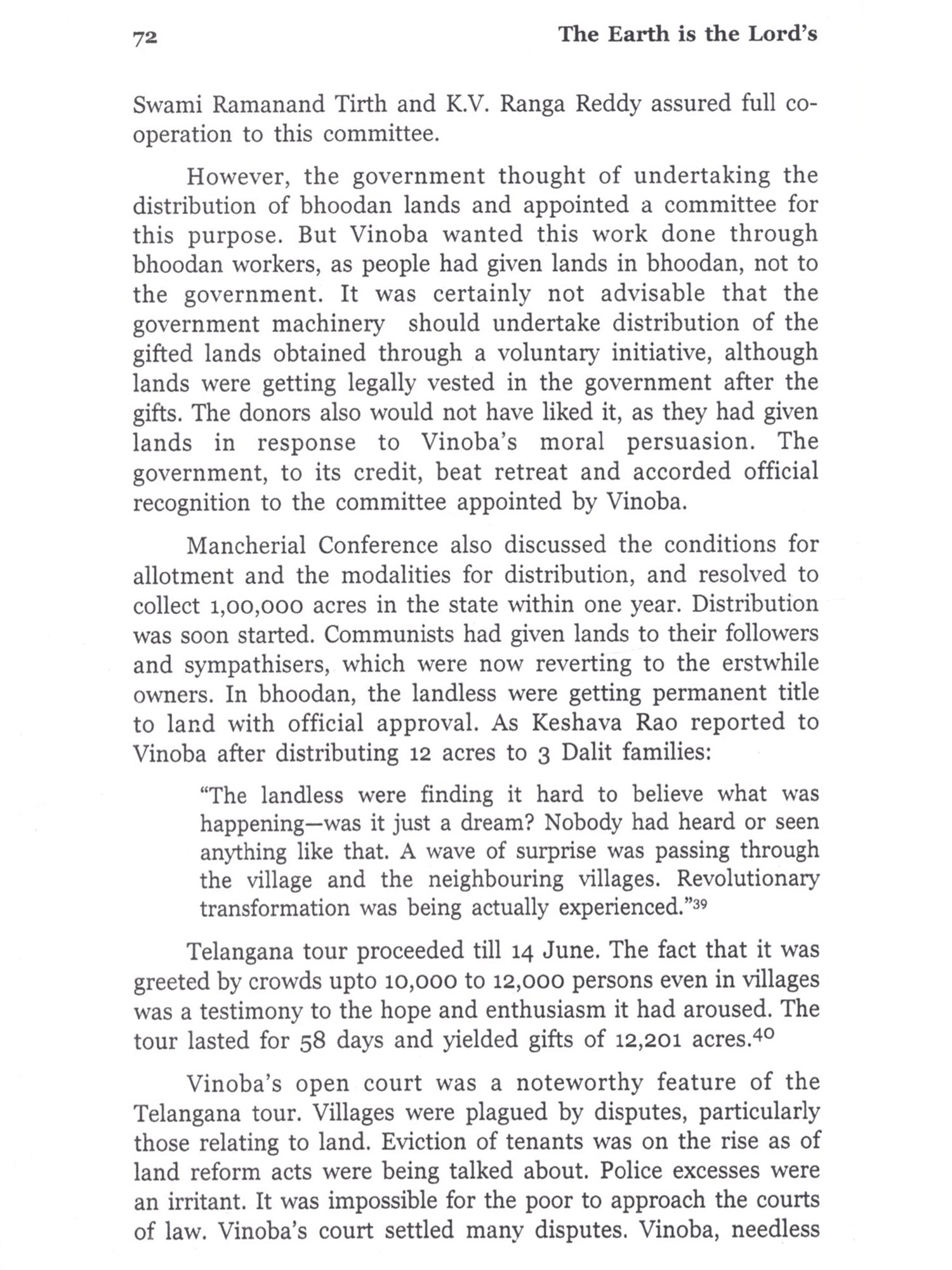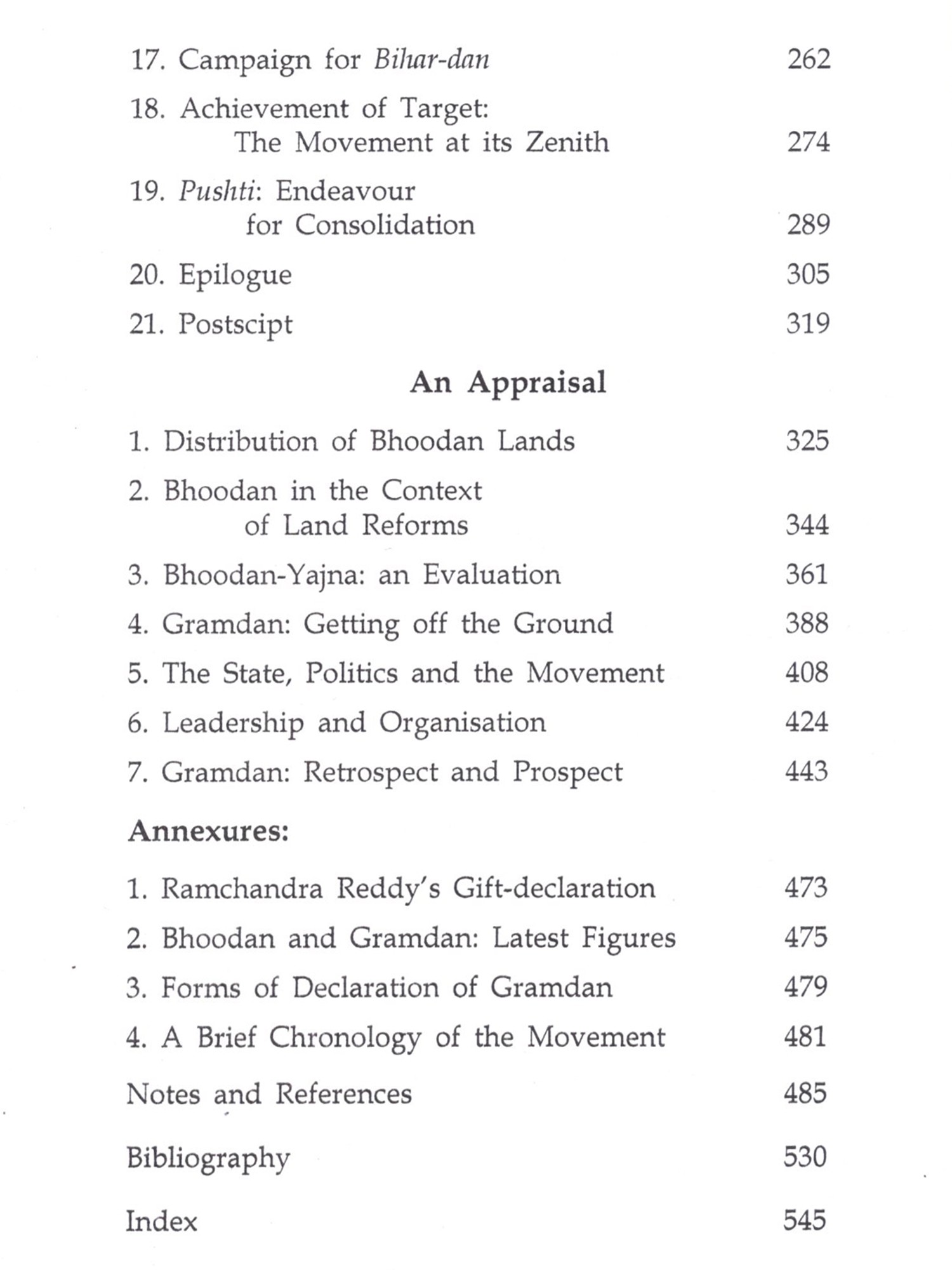Bhoodan-Gramdan Movement is a precious chapter, not only in the history of Independent India, but also in the history of modern world. Never and nowhere in the recorded history has land been collected for the landless on such a massive scale through nothing but moral suasion. There is no record of a bigger and better non-governmental and nonviolent endeavour for the solution of a serious and pressing, yet intricate problem. This endeavour was all the more valuable, because it sought to empower people to solve their problems rather than claiming and posing to solve those problems. This empowerment was meant to initiate radical social transformation. In the year 2000, on the eve of the golden jubilee year of the Bhoodan Movement, Sarva Seva Sangh proposed that a history of the Movement be published to mark the occasion. I was entrusted with the responsibility of writing the history under the guidance of Kantibhai Shah. It was near to impossible to complete the task till 2001, but I am also guilty of letting it linger on under various pretexts, some genuine and some false. In 2008, I was invited by the Gujarat Vidyapith (Ahmedabad), a premier educational institute founded by Mahatma Gandhi, to work as a Visiting Fellow in Vinoba Studies. This presented an opportunity to pursue this work with undivided attention. The Vidyapith gave me full freedom and provided a congenial environment to make my short stay of seven and a half months fruitful. Major part of actual writing was done at the Vidyapith. I am deeply indebted to Narayanbhai Desai, Chancellor of the Vidyapith; Sudarshan Iyengar, Vice-Chancellor of the Vidyapith and their colleagues, particularly at the library and the Peace Research department. I am also grateful to the Vidyapith for publishing the voluminous tome of around 1,000 pages in 3 volumes under the title, 'Sabai Bhoomi Gopal ki in Hindi. The present book is an abridged version of that book in English. I am aware that this book is an elementary attempt, it is far from being a comprehensive and definitive history. Much more needs to be done to have such history, which the nation-wide Movement eminently deserves. It calls for teamwork rather than an individual effort. I am acutely aware of what should have, but could not be done by me, and entertain the hope that the book serves to generate interest in the Movement and is followed by more extensive and deeper research. Without the support of the Vidyapith, the book might not have seen the light of day. I am obliged to them and also to Sarva Seva Sangh for initiating and helping the project. Thanks are also due to Gandhi Seva Sangh (Sevagram), Vinoba Vichar Kendra (Nagpur). Brahmavidya Mandir and Paramdham Prakashan (Pavnar, Wardha), Sabarmati Ashram (Ahmedabad), Gokhale Institute of Politics and Economics (Pune), Swami Ramananda Tirtha Research Institute (Aurangabad), Nehru Memorial Museum and Library (New Delhi), and also to Balvijay, Gautam Bajaj, Vijay Diwan, Kanakmal Gandhi, Ranjit Desai, Shail Chowhan and many others for letting me have access to the source material in their possession. I have also been benefited from the information and insights provided by Kantibhai Shah, Sarvanarayan Das, Vasant Palshikar and many other workers in the Movement. (Unfortunately, some of them are not alive to see the publication of the English version.) Needless to say, I am solely responsible for the opinions expressed herein and also for the deficiencies in this book. In the end, I would also like to thank Maharashtra Knowledge Corporation Ltd, Pune for arranging copy-editing of the English version and Paramdham Prakashan (Pavnar, Wardha) and Vidarbh Bhoodan-Gramdan Sahayog Samiti for undertaking its publication.