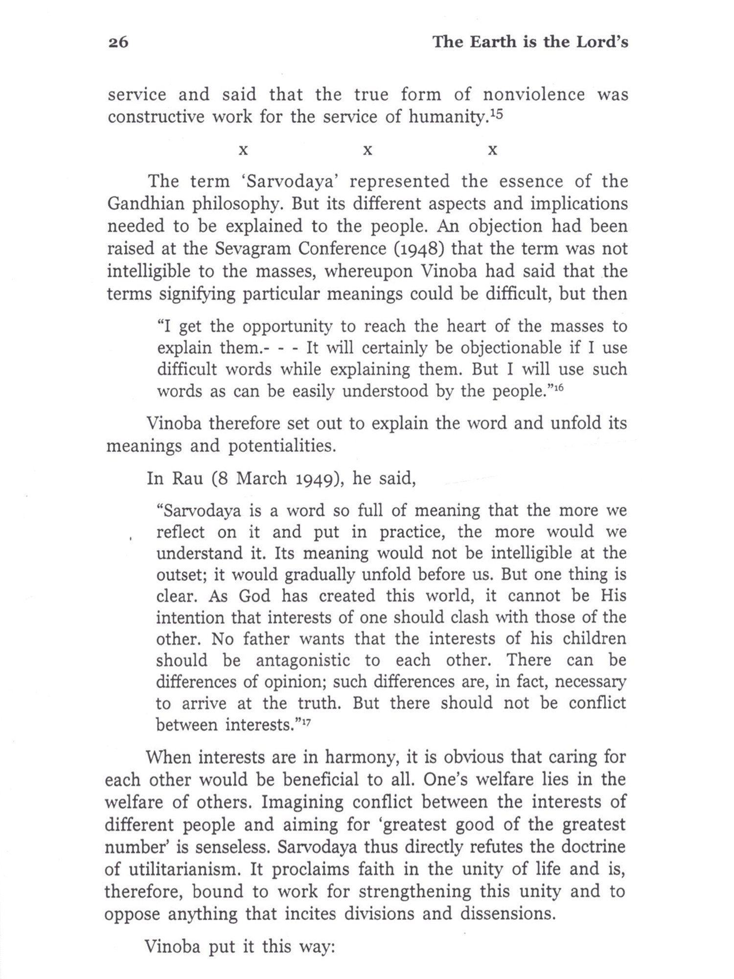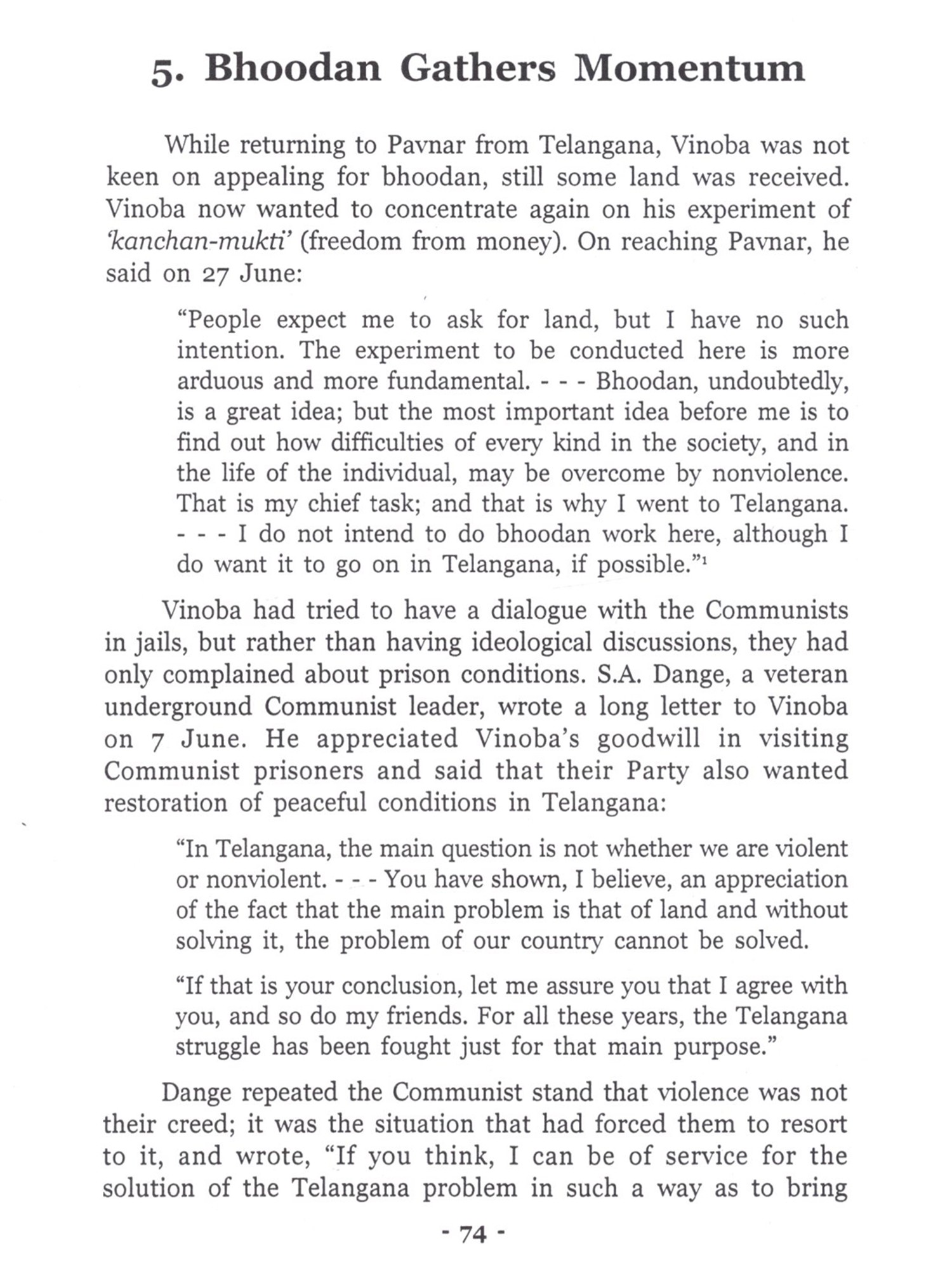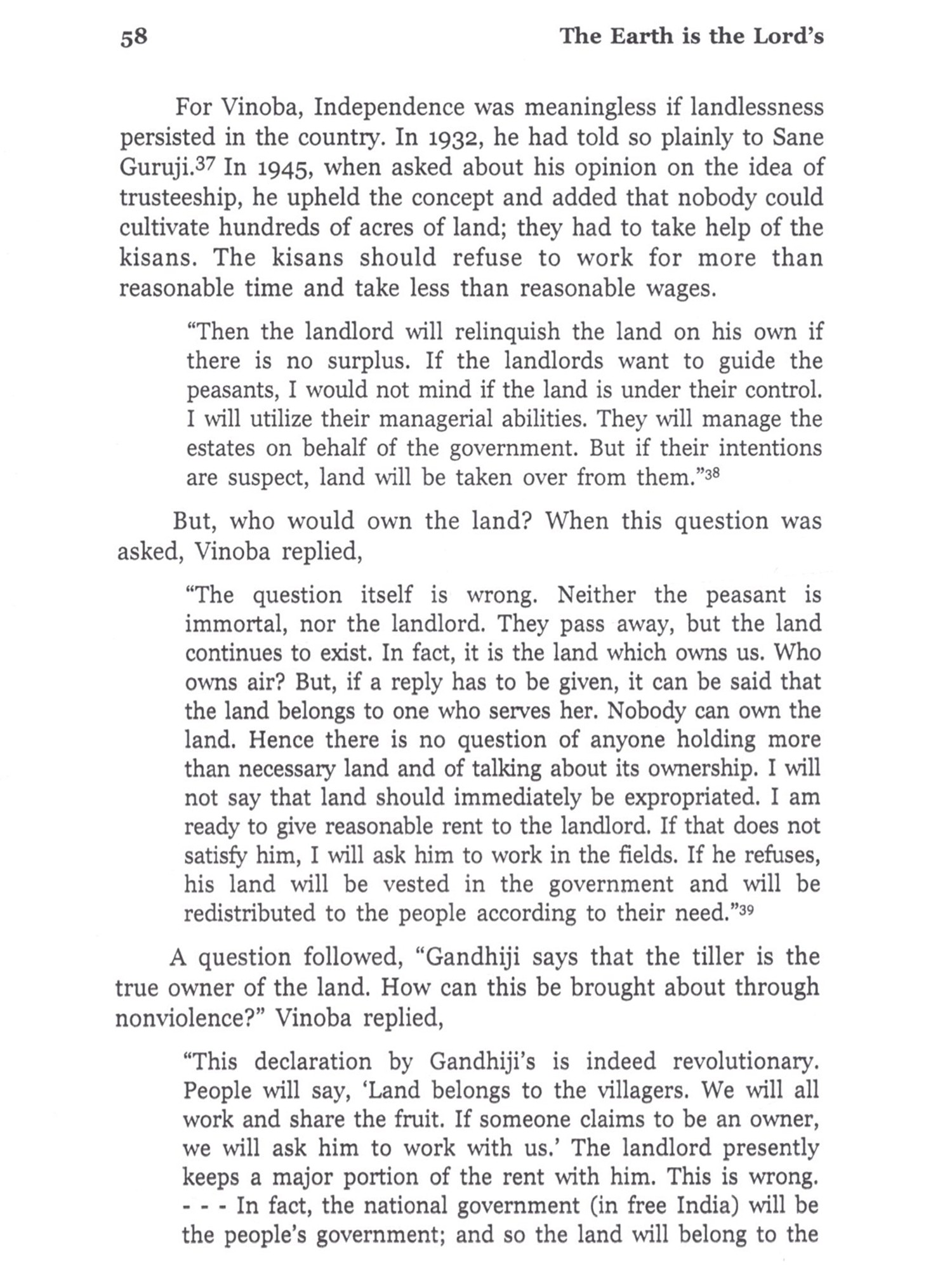 Bhoodan-Gramdan Movement is a precious chapter, not only in the history of Independent India, but also in the history of modern world. Never and nowhere in the recorded history has land been collected for the landless on such a massive scale through nothing but moral suasion. There is no record of a bigger and better non-governmental and nonviolent endeavour for the solution of a serious and pressing, yet intricate problem. This endeavour was all the more valuable, because it sought to empower people to solve their problems rather than claiming and posing to solve those problems. This empowerment was meant to initiate radical social transformation. In the year 2000, on the eve of the golden jubilee year of the Bhoodan Movement, Sarva Seva Sangh proposed that a history of the Movement be published to mark the occasion. I was entrusted with the responsibility of writing the history under the guidance of Kantibhai Shah. It was near to impossible to complete the task till 2001, but I am also guilty of letting it linger on under various pretexts, some genuine and some false. In 2008, I was invited by the Gujarat Vidyapith (Ahmedabad), a premier educational institute founded by Mahatma Gandhi, to work as a Visiting Fellow in Vinoba Studies. This presented an opportunity to pursue this work with undivided attention. The Vidyapith gave me full freedom and provided a congenial environment to make my short stay of seven and a half months fruitful. Major part of actual writing was done at the Vidyapith. I am deeply indebted to Narayanbhai Desai, Chancellor of the Vidyapith; Sudarshan Iyengar, Vice-Chancellor of the Vidyapith and their colleagues, particularly at the library and the Peace Research department. I am also grateful to the Vidyapith for publishing the voluminous tome of around 1,000 pages in 3 volumes under the title, 'Sabai Bhoomi Gopal ki in Hindi. The present book is an abridged version of that book in English. I am aware that this book is an elementary attempt, it is far from being a comprehensive and definitive history. Much more needs to be done to have such history, which the nation-wide Movement eminently deserves. It calls for teamwork rather than an individual effort. I am acutely aware of what should have, but could not be done by me, and entertain the hope that the book serves to generate interest in the Movement and is followed by more extensive and deeper research. Without the support of the Vidyapith, the book might not have seen the light of day. I am obliged to them and also to Sarva Seva Sangh for initiating and helping the project. Thanks are also due to Gandhi Seva Sangh (Sevagram), Vinoba Vichar Kendra (Nagpur). Brahmavidya Mandir and Paramdham Prakashan (Pavnar, Wardha), Sabarmati Ashram (Ahmedabad), Gokhale Institute of Politics and Economics (Pune), Swami Ramananda Tirtha Research Institute (Aurangabad), Nehru Memorial Museum and Library (New Delhi), and also to Balvijay, Gautam Bajaj, Vijay Diwan, Kanakmal Gandhi, Ranjit Desai, Shail Chowhan and many others for letting me have access to the source material in their possession. I have also been benefited from the information and insights provided by Kantibhai Shah, Sarvanarayan Das, Vasant Palshikar and many other workers in the Movement. (Unfortunately, some of them are not alive to see the publication of the English version.) Needless to say, I am solely responsible for the opinions expressed herein and also for the deficiencies in this book. In the end, I would also like to thank Maharashtra Knowledge Corporation Ltd, Pune for arranging copy-editing of the English version and Paramdham Prakashan (Pavnar, Wardha) and Vidarbh Bhoodan-Gramdan Sahayog Samiti for undertaking its publication.