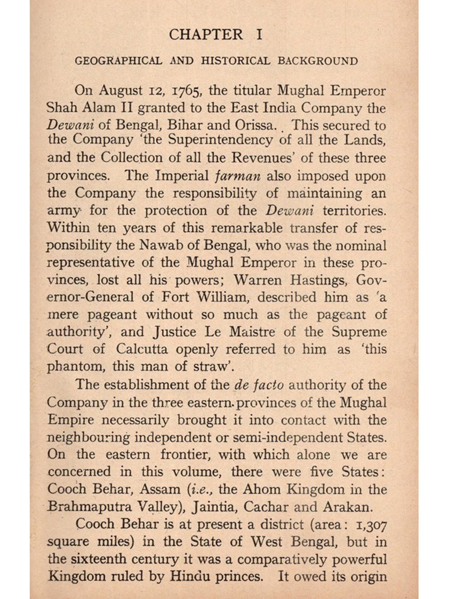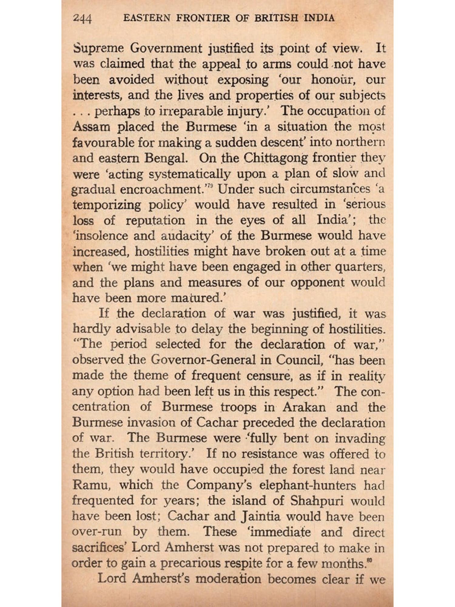 The declaration of war by Japan against the British Empire and the United States of America in December, 1941, the conquest of Burma, and the threat to India from the east, have painfully demonstrated the great importance which should be attached to the eastern frontier of this country from the politico-military point of view. The North-West can no longer monopolise the attention of the defenders of India, nor can serious students of frontier policy, which constitutes so large and vital a part of our national history, confine their study to the routes taken by Alexander and his followers. It is to be deplored that historians of British India have so far concentrated their attention on northern, western and southern India, they have been altogether indifferent to the strange events which culminated in the Burmese Wars and resulted in the incorporation of Assam and Burma in the British Empire. Some years ago I realised the importance of this neglected subject, and the composition of this book was finished a few months before the declaration of war by Japan. Circumstances beyond my control delayed its publication for more than two years. I now submit it to the public, strengthened by the conviction that a pioneer's defects deserve more charity and indulgence than are usually accorded to those who follow the lead of veteran scholars and deal with well-known subjects.