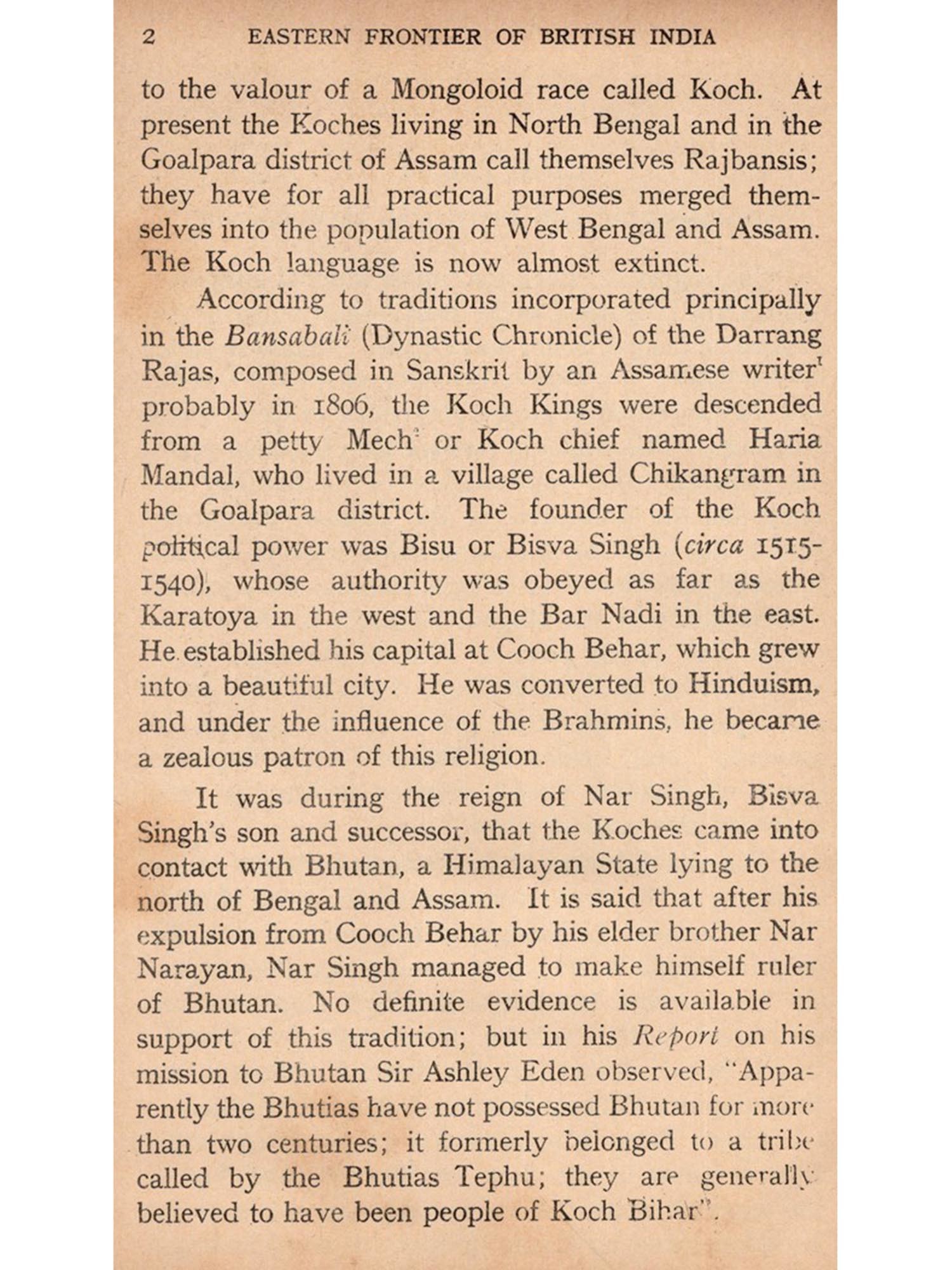 A detailed account of the materials utilised in the composition of this volume will be found in the Bibliography I have relied entirely on original sources, mainly unpublished official documents, No statement made by secondary authorities, contemporary or later, has been accepted unless it is supported by positive documentary evidence. I may, therefore, claim that the entire book is an original contribution to the understanding of British Indian history. Sir Edward Gait gives a more or less complete, though brief, account of British relations with Assam: but he did not examine unpublished documents. He relied on Sir James Johnstone's Captain Welsh's Expedition to Assam (compiled from records in the Foreign Department of the Government of India") and Wilson's Documents Illustrative of the Burmese War. Whether Sir Arthur Phayre and Mr. G. E. Harvey examined all relevant documents, I do not know. But their narrative is very brief (covering only a few pages).