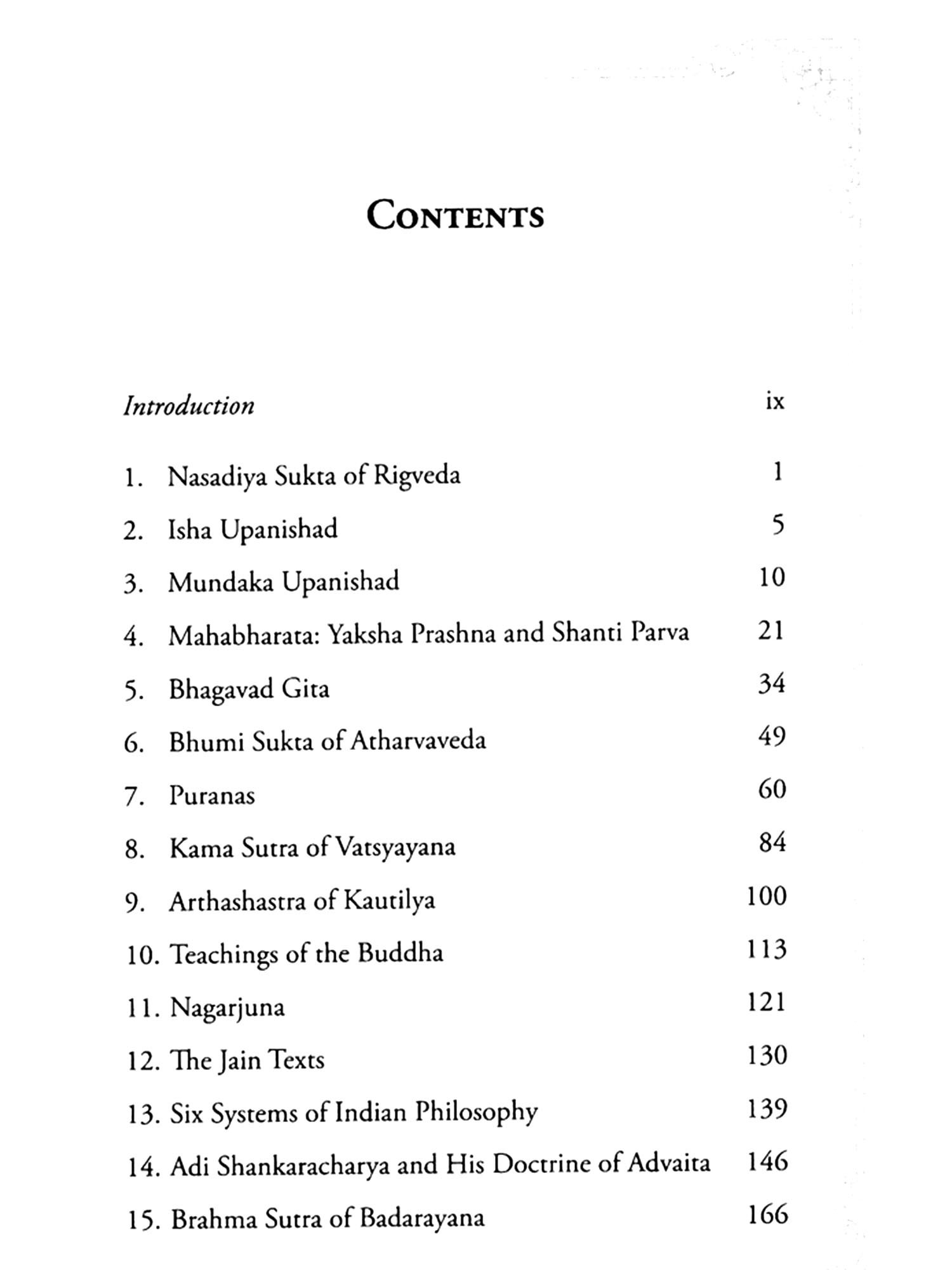 This compendium, or anthology, seeks to capture some of the magnitude of this vast ideational canvas. Its breadth covers a period of 7,000 years at the very least, from the Rigveda, dated circa 3500 to 3000 BCE, to the philosopher Osho, closer to the present. The subjects it includes range from philosophy, metaphysics, religion, values, politics, economics, arts, literature, poetry and aesthetics to social change and renewal. The geographical sweep is as wide, covering the whole of Bharatvarsha, from the Himalayas to Kanyakumari, and Dwarka to Puri and the Northeast ....