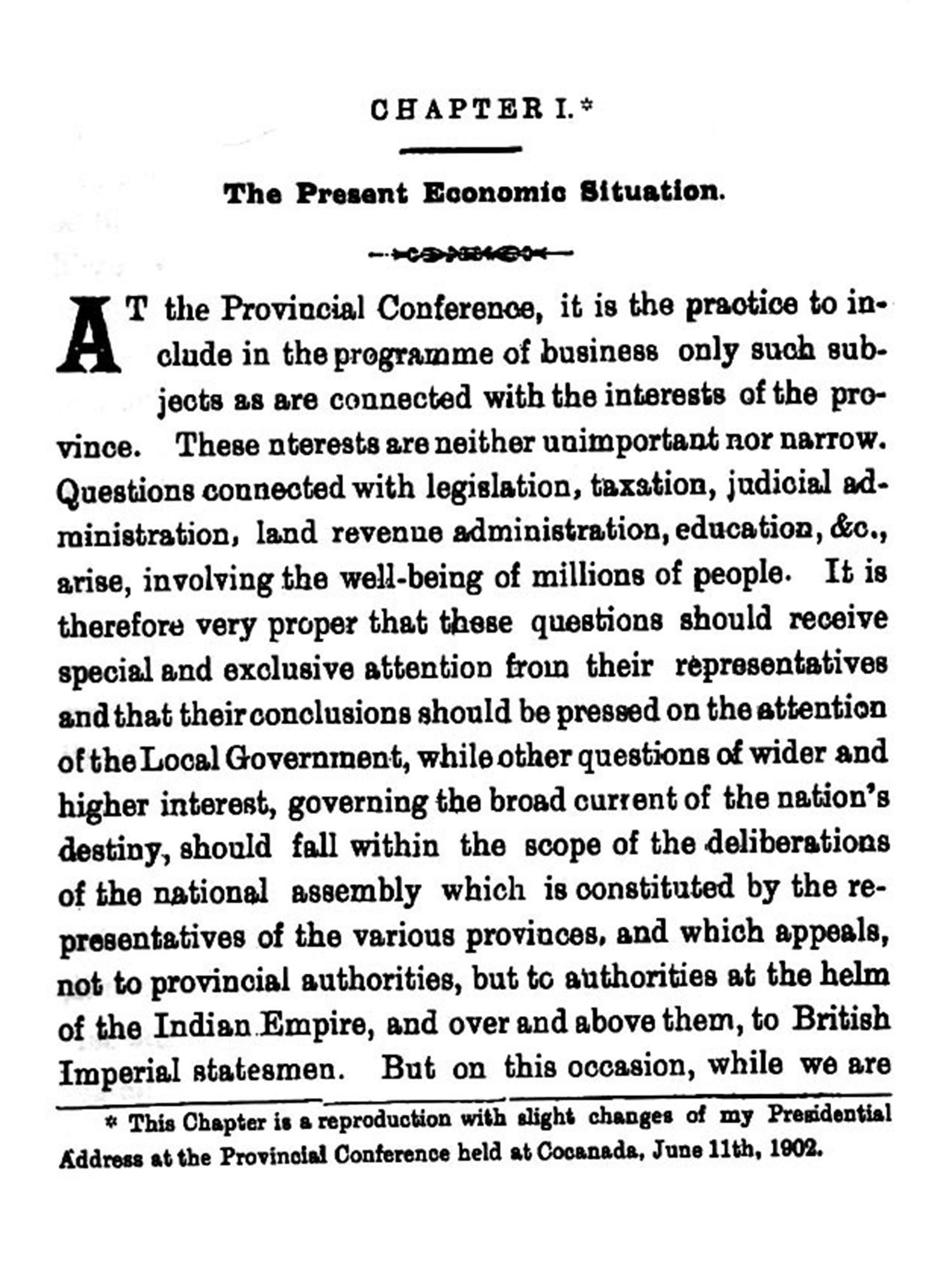 In the following pages I have put together the results of my studies during a pretty lengthy period of my journalistic career. Since I gave up my connection with the Hinds, I have been able to make a special study of Indian financial and economic questions, and my impression has been strengthened that the time has come when our public men should distinguish between the different branches of politics and devote themselves to their study with a due sense of proportion as to their relative importance. The great bulk of the Indian press mainly concerns itself with what may be called administrative politics. But it must be admitted that, while this branch has its own importance, what may be called fiscal and Industrial politics, as involving the wider and the in or permanent interests of the country, demand a closer and a more regular study. Questions of the latter character are no doubt taken up by the indian press and public bodies as they arise from time to time and are disposed of from the Indian point of view, which is not always the point of view of the Government. When new taxes are imposed or new proposals concerning the public revenues of the country are made, public opinion no doubt declares itself either for or against them. Similarly, in regard to industries of the country, there has been a general and vague complaint that the policy of British rule has been destructive in its effect in the past, and is unsympathetic in its attitude at presont. But neither the fiscal nor the economic questions of India have been systematically studied in view to a consideration of the applicability to Indian conditions of the theories and conclusions of the economists of the Western countries, of those of Englatıd more especially. I do not forget that there are worthy exceptions to the generality of our public men, like Mr. Dadabhai Naoroji, who for a long time stood alone among educated Indians as a student and expounder of Indian economics. The late Mr. M. G. Ranade has also left valuable records of his views on the same. And latterly Mr. R. C. Dutt, by his 'Economic History of India' and other writings, has placed the Indian people under obligation. I may mention Mr. D. E. Wacha, and the Hon: Mr. G. K. Gokhale among other Indians who have thrown light on economic and fiscal questions by their various public utterances and writings. Still, in my humble opinion, these questions should be more generally studied by our politicians and journalists than is the case at present; and their views should be more largely diffused among the classes that take an interest in public affairs. In the following pages 1 endeavour to make a small contribution towards this end.