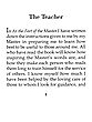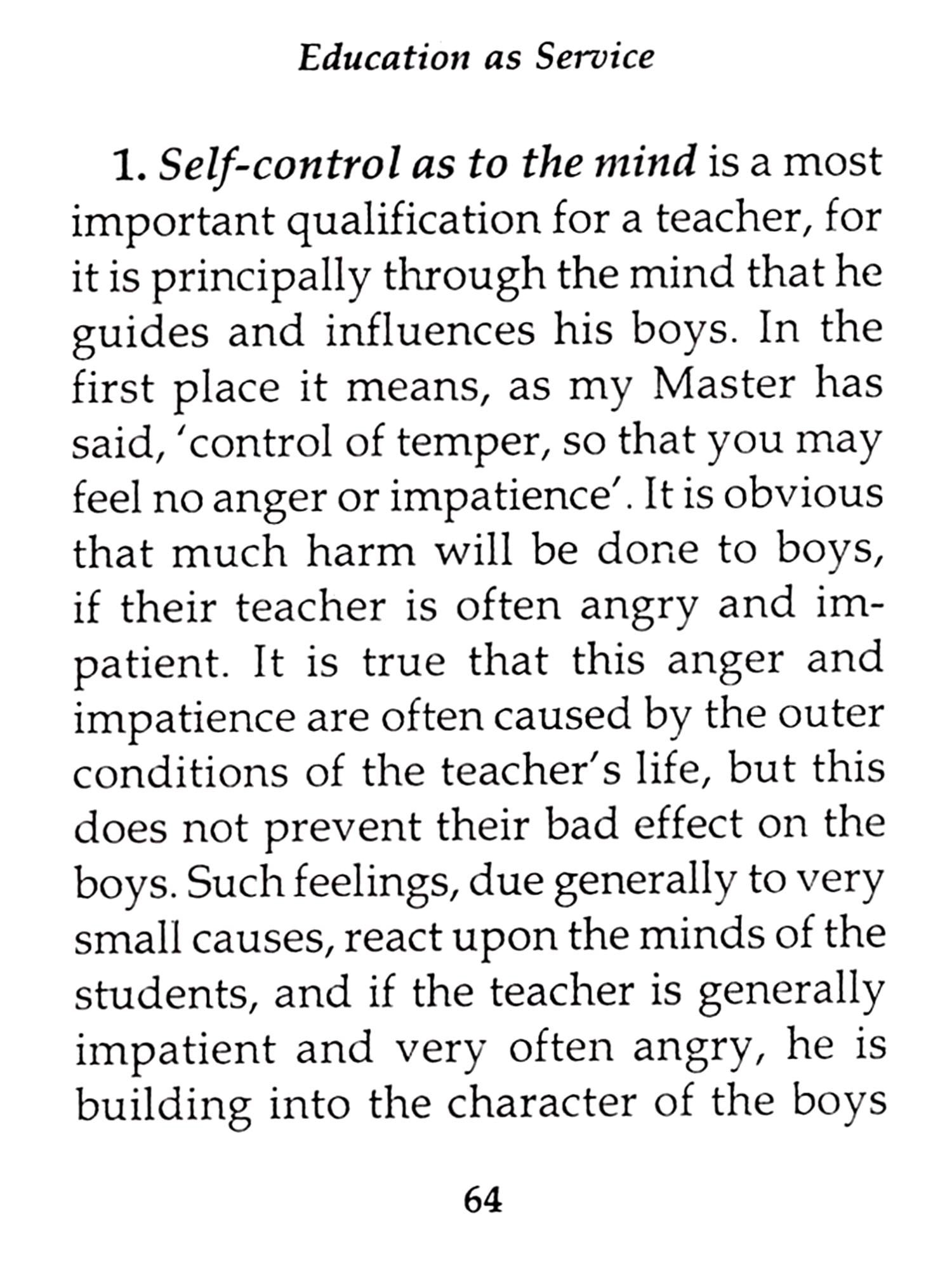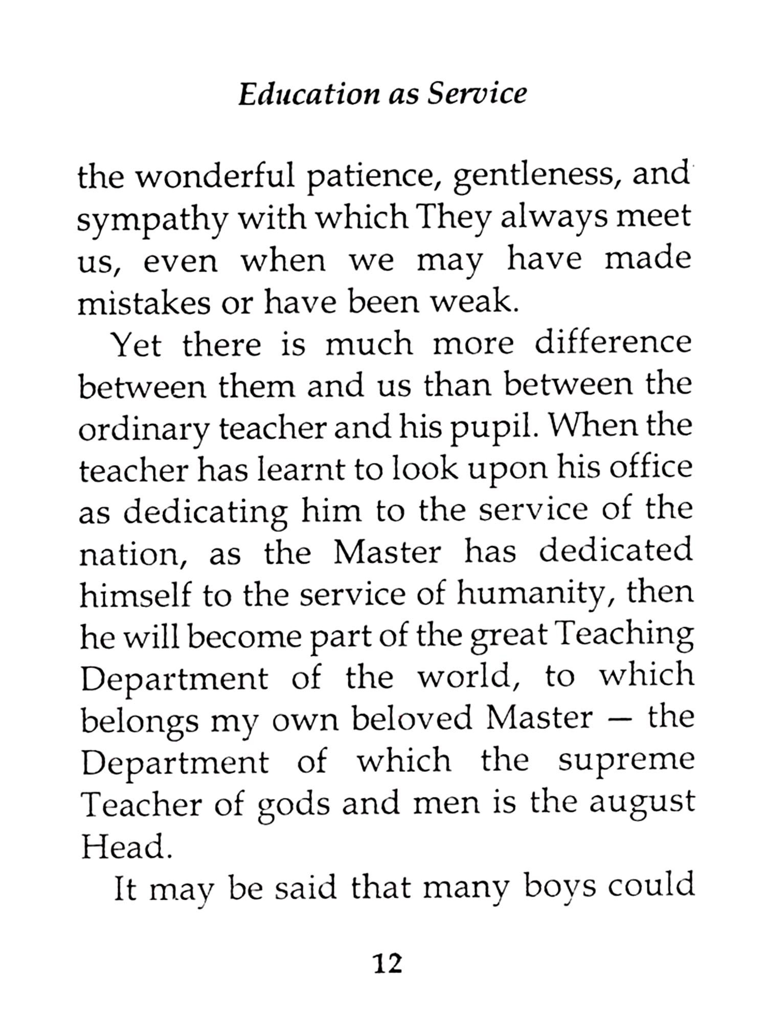 His work must be seen as belonging to the great Teaching Department in the Government of our world, and his relation with his pupils must be a copy of the relation between a Master and his disciples. Love, protective and elevating on the one side, must be met with love, confiding and trustful, on the other. This is, in truth, the old Hindu ideal, exaggerated as it may seem to be today, and if it be possible in any country to rebuild this ideal, it should be by an Indian for Indians. Hence there is, at the back of the author's mind, a dream of a future College and School, wherein this ideal may be materialized Theosophical College and School, be-cause the ancient Indian ideals now draw their life from Theosophy, which alone can shape the new vessels for the ancient elixir of life.