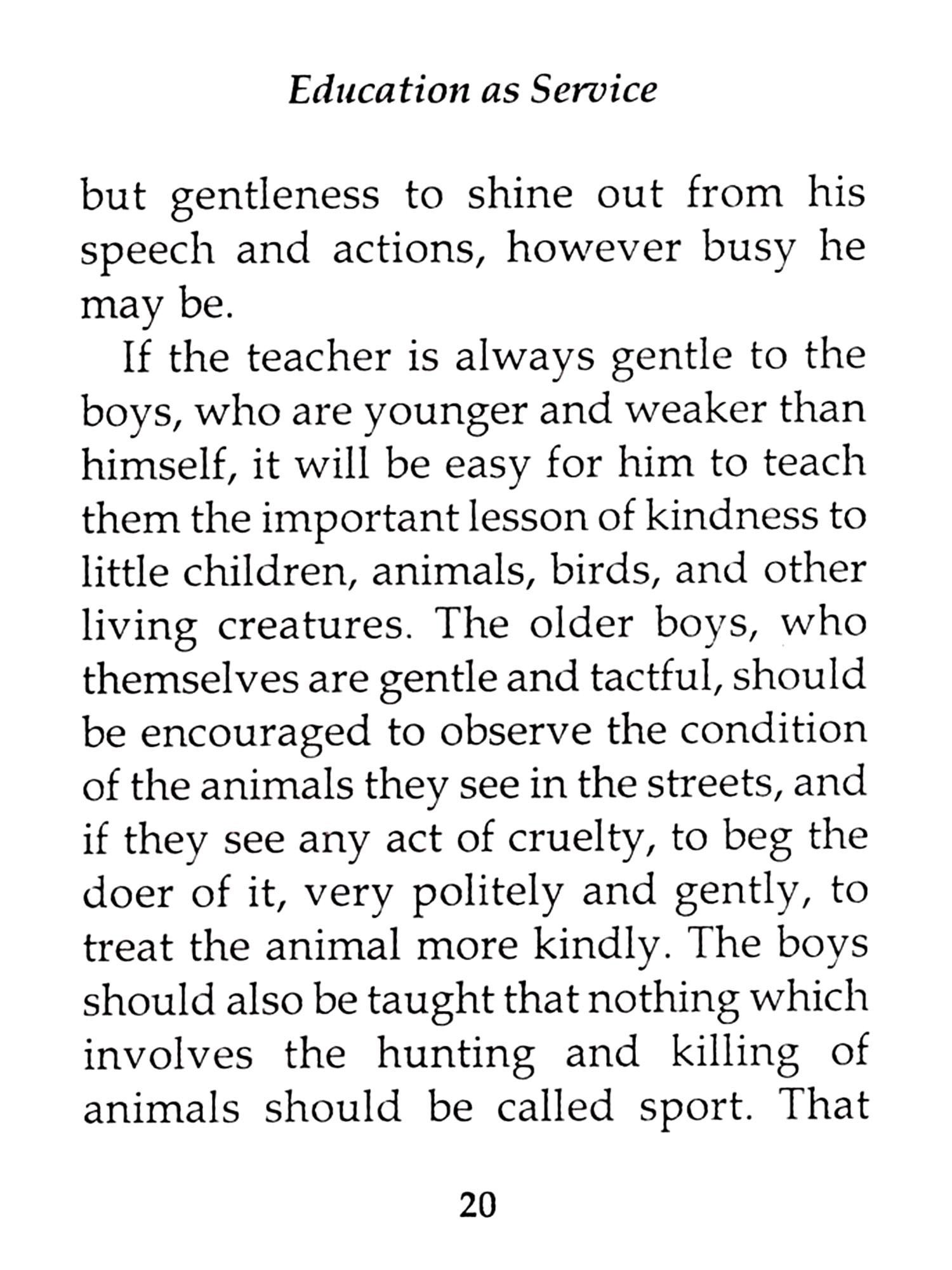 Most of the recommendations apply, I think, to all countries and to all religions, and are intended to sound the note of our common brotherhood, irrespective of religion or caste, race or colour. If the unity of life and the oneness of its purpose could be clearly taught to the young in schools, how much brighter would be our hopes for the future! The mutual distrust of races and nations would disappear, if the children were trained in mutual love and sympathy as members of one great family of children all over the world, instead of being taught to glory only in their own traditions and to despise those of others. True patriotism is a beautiful quality in children, for it means unselfishness of purpose and enthusiasm for great ideals; but that is false patriotism which shows itself in contempt for other nations. There are, I am told, many organizations within the various nations of the world, intended to inspire the children with a love for their country and a desire to serve her - and that is surely good; but I wonder when there will be an international organization to give the children of all nation’s common ideals also, and a knowledge of the real foundation of right action, the Brotherhood of Man.