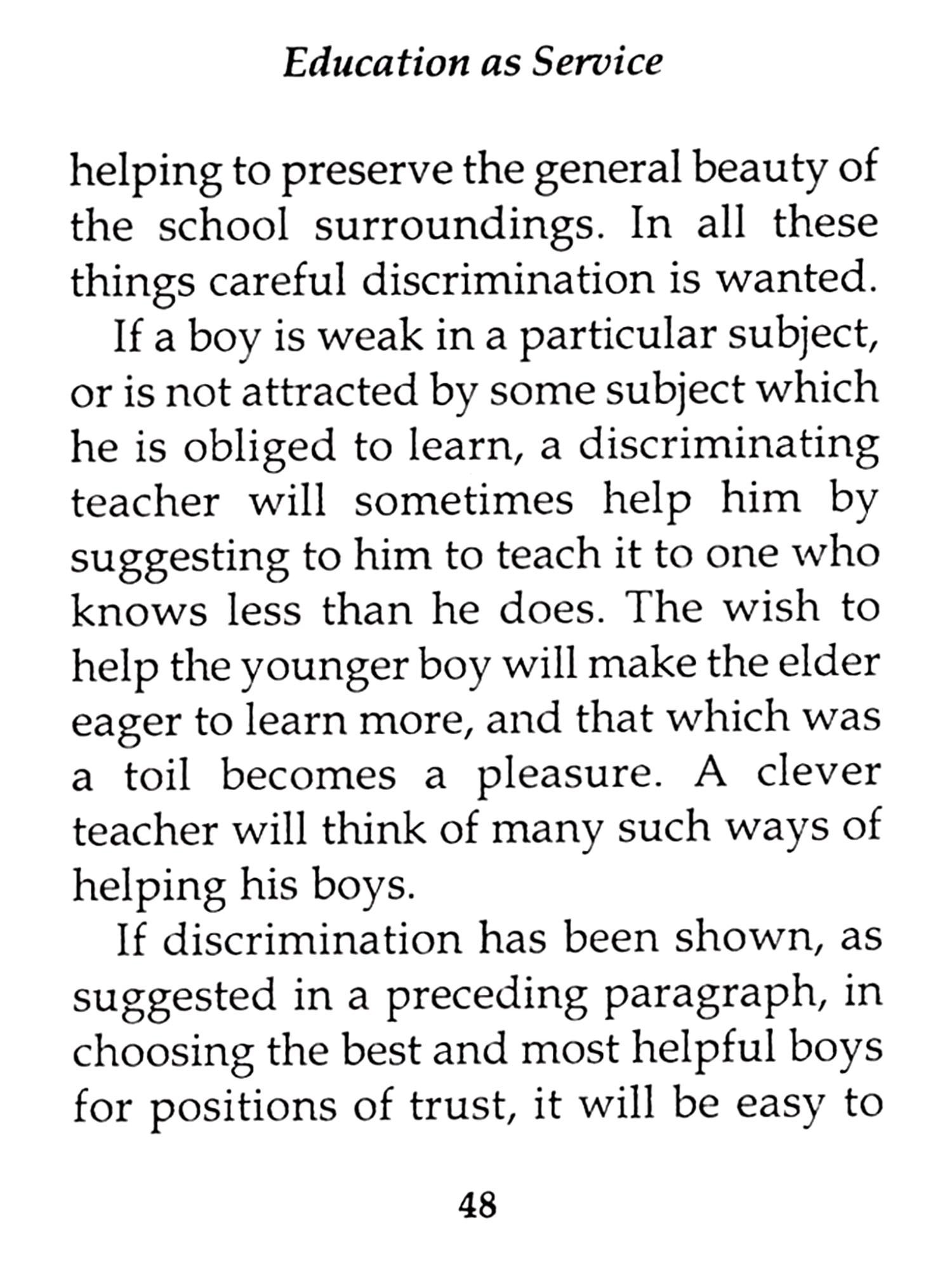 The capacities of the child, the line they fit him to pursue, these must guide his education. In all, the child's interest must be paramount; the true teacher exists to serve.