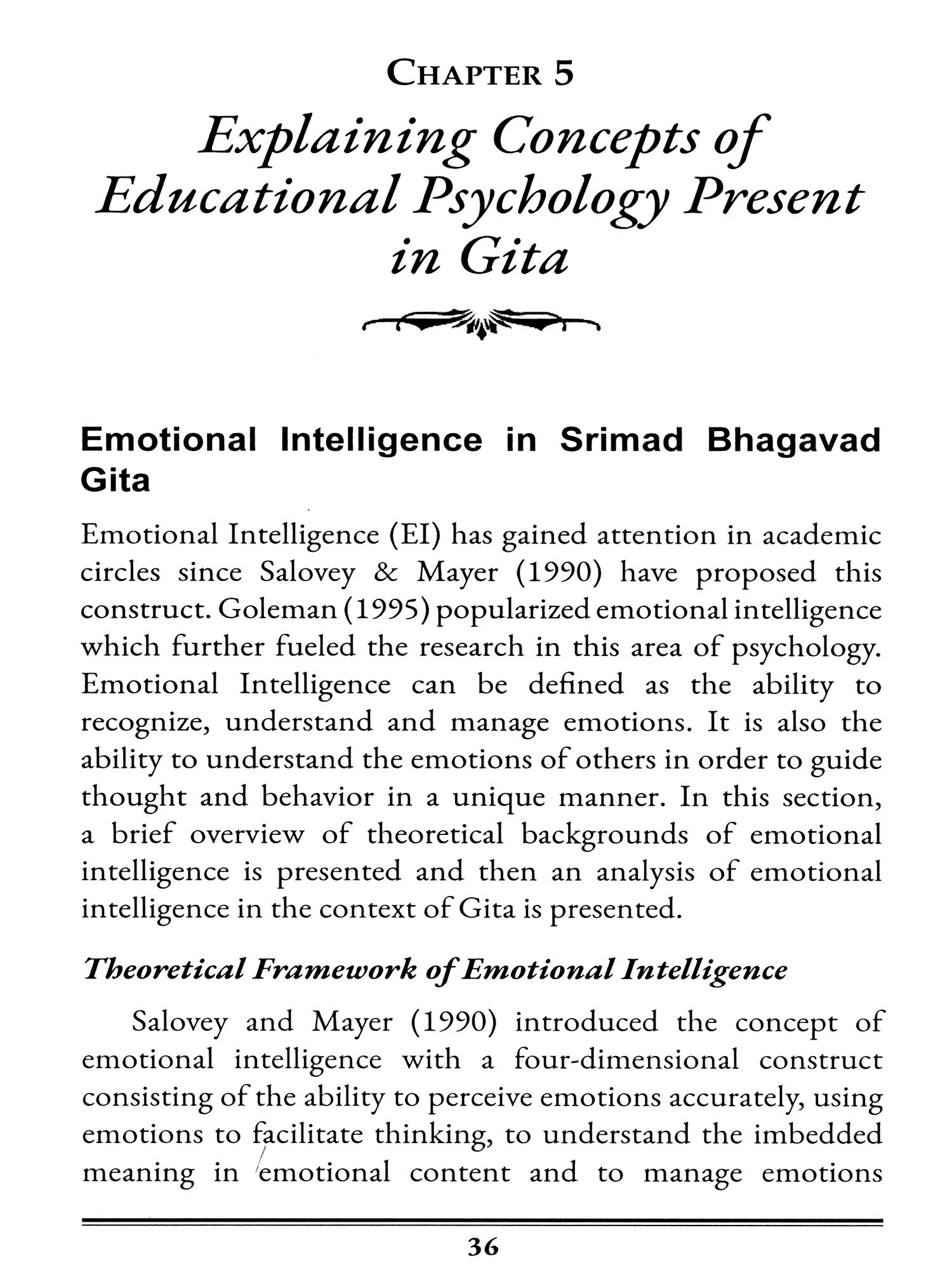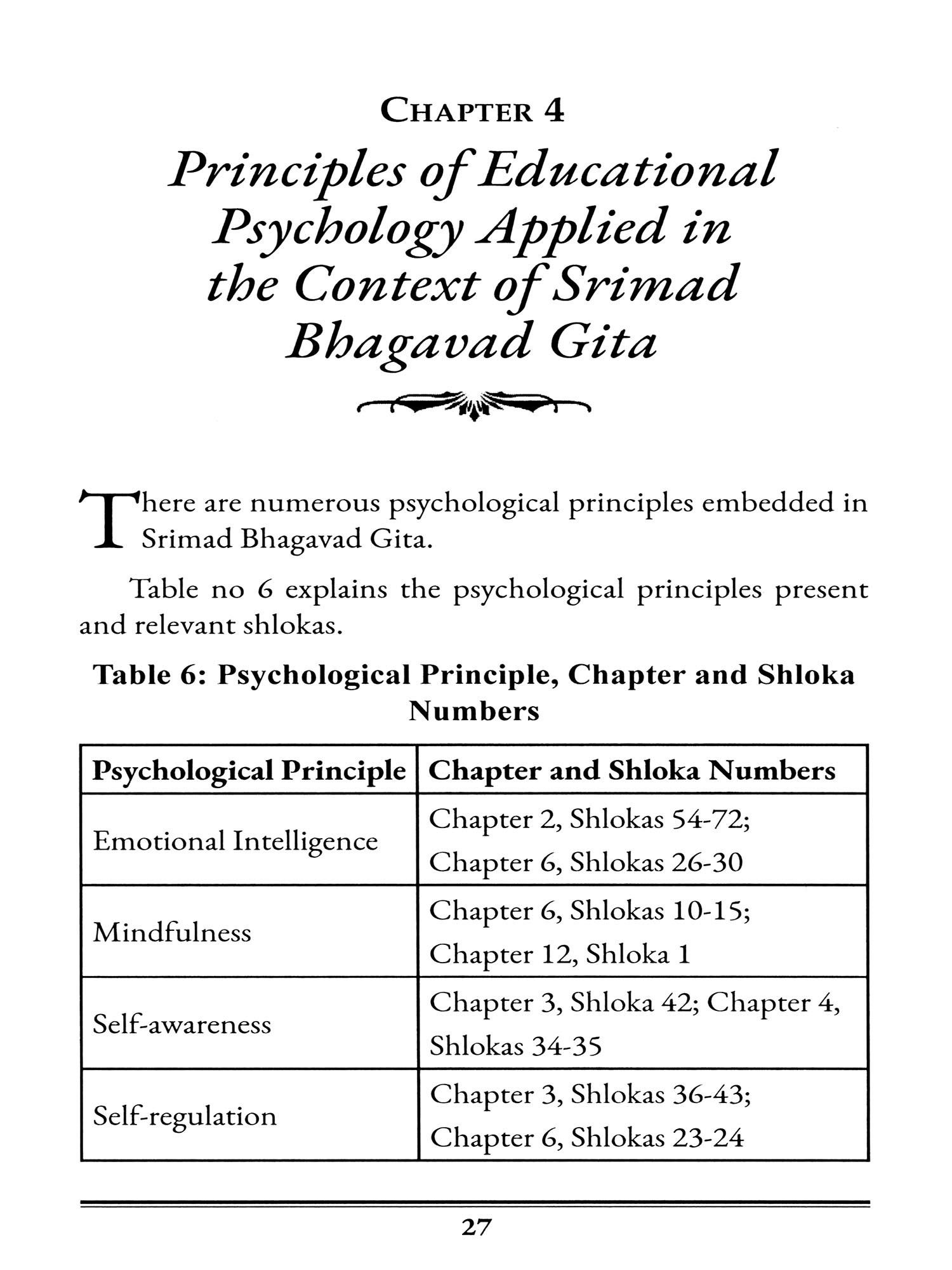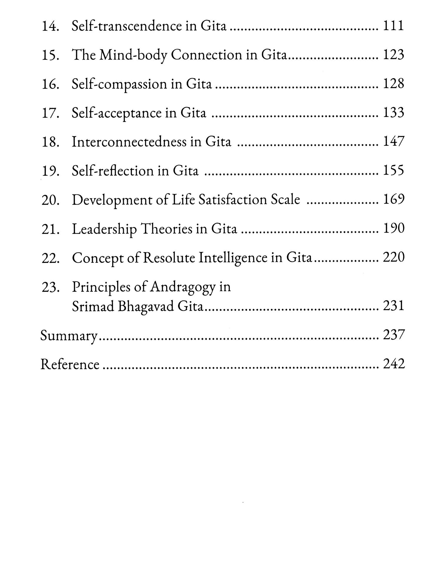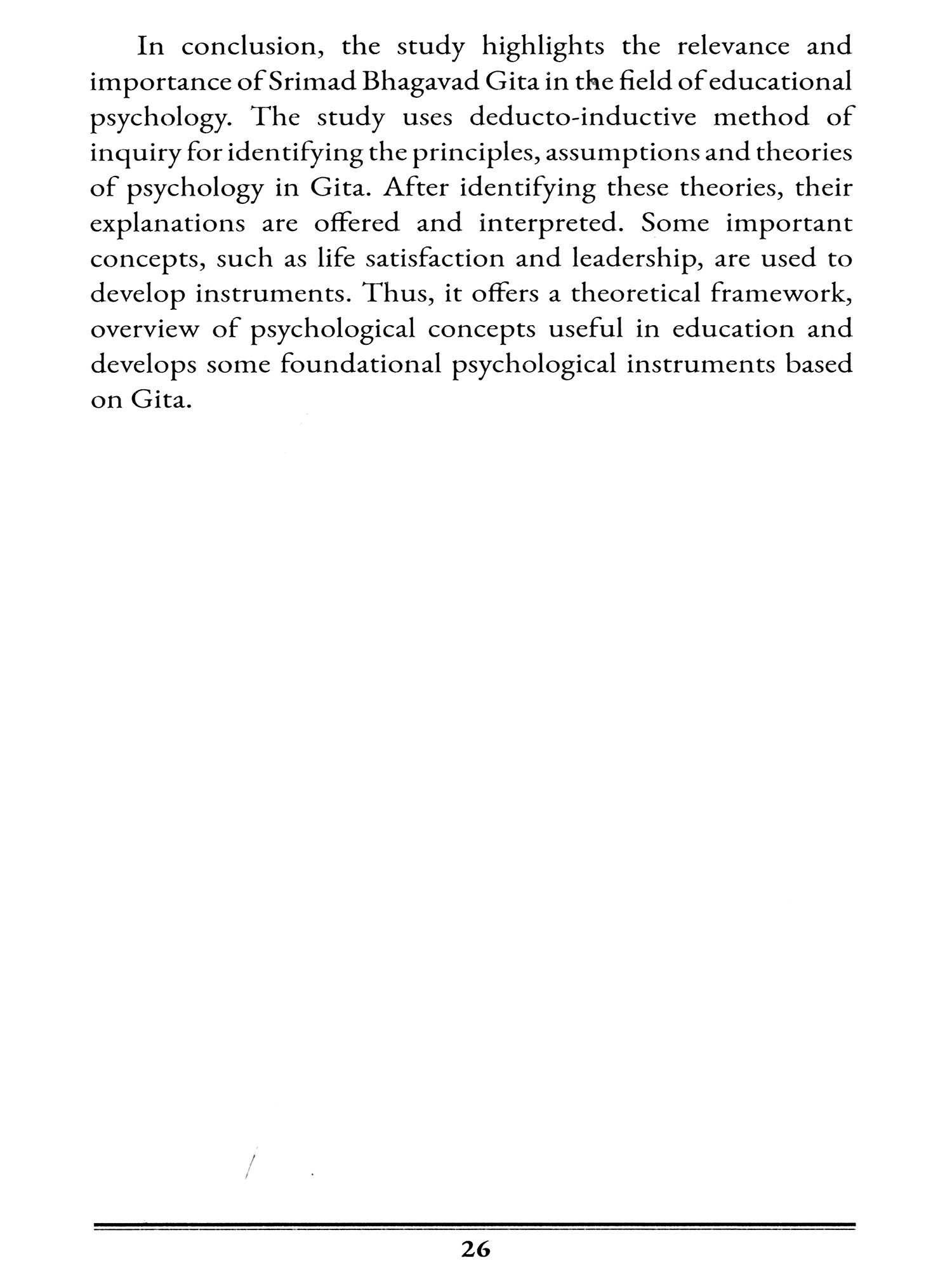 This work is the result of my postdoctoral research, sponsored by ICSSR, New Delhi, in association with Banaras Hindu University. The curiosity to know thyself has been a constant source of inspiration for mankind for ages, across cultures and history. Greek culture and Indian culture have both admired the effort to understand the true self of a person. This is where the discourse should start in spirituality, education, and social life. Without understanding oneself, one cannot achieve true wisdom and knowledge of reality. The concept of man is the cornerstone of any education system. This work attempts to understand the concept of man, his behavior, and his thought processes as described by the Srimad Bhagavad Gita in its verses. By providing an overview of foundational research, the book is divided into several sections. It presents studies on the educational relevance of religious texts around the world, a brief methodological approach, and identifies principles of educational psychology applied in the context of the Srimad Bhagavad Gita. After identifying the relevant theories and principles of educational psychology, the main concepts are elaborated, explained, and interpreted in the context of modern psychology. Concepts of emotional intelligence, mindfulness, self-awareness, the concept of self, and self-regulation are described in detail. Furthermore, this study proposes a unique model of the psychological process of desire. This work also encompasses the development of psychometric instruments for measuring the concept of life satisfaction and leadership. Dimensions of Resolute Intelligence are also identified. Lastly, the study explores andragogical principles in the context of the Srimad Bhagavad Gita.