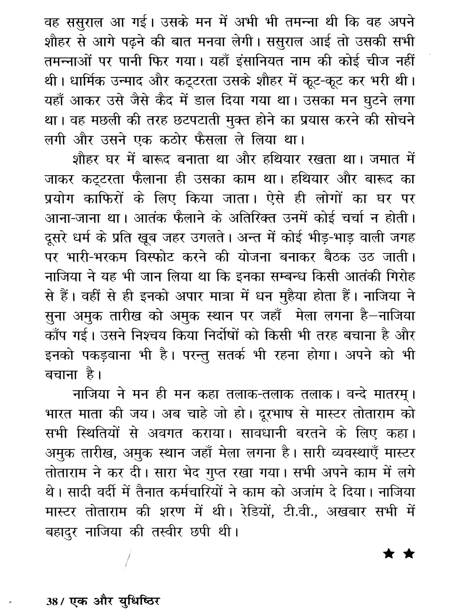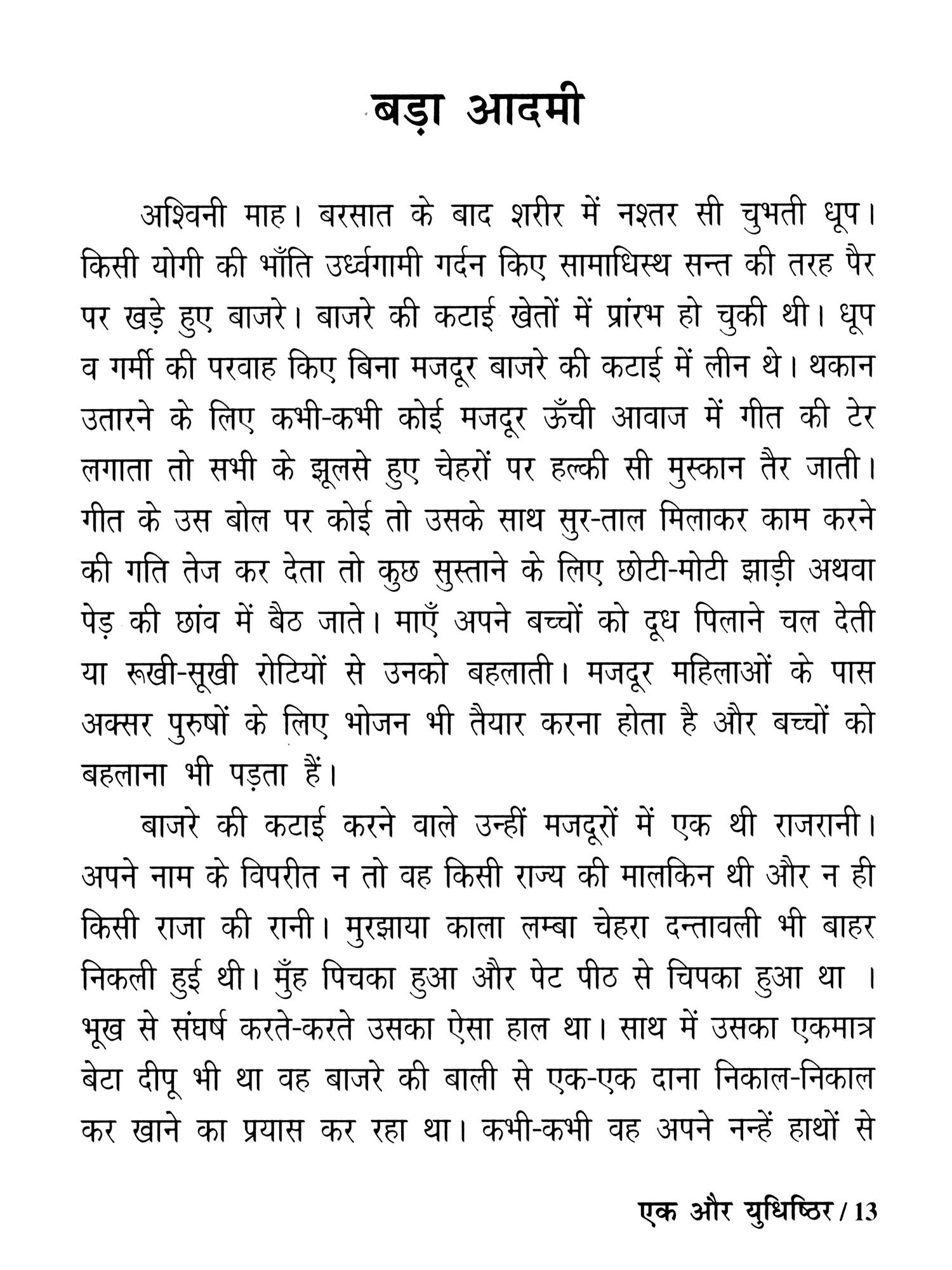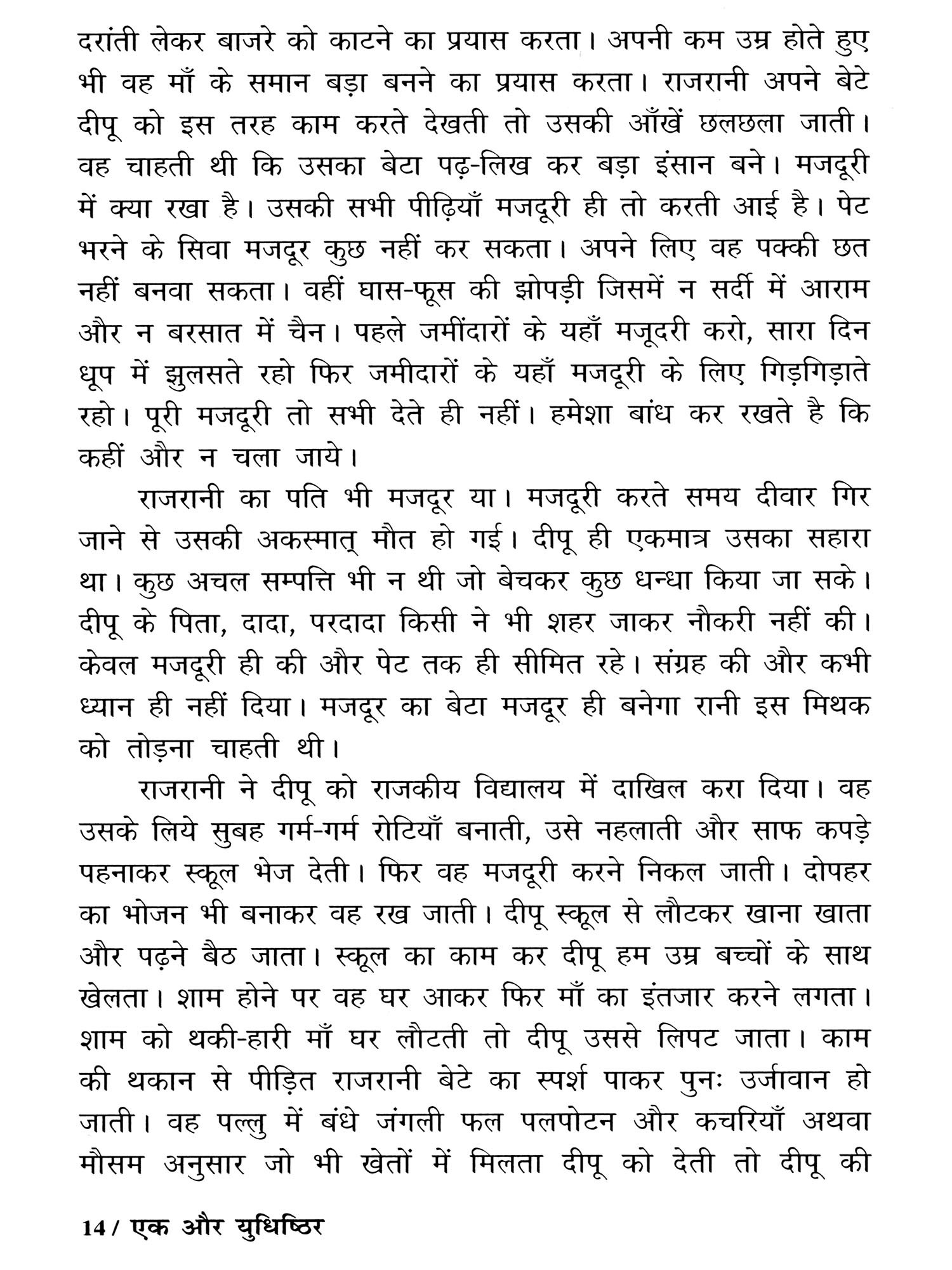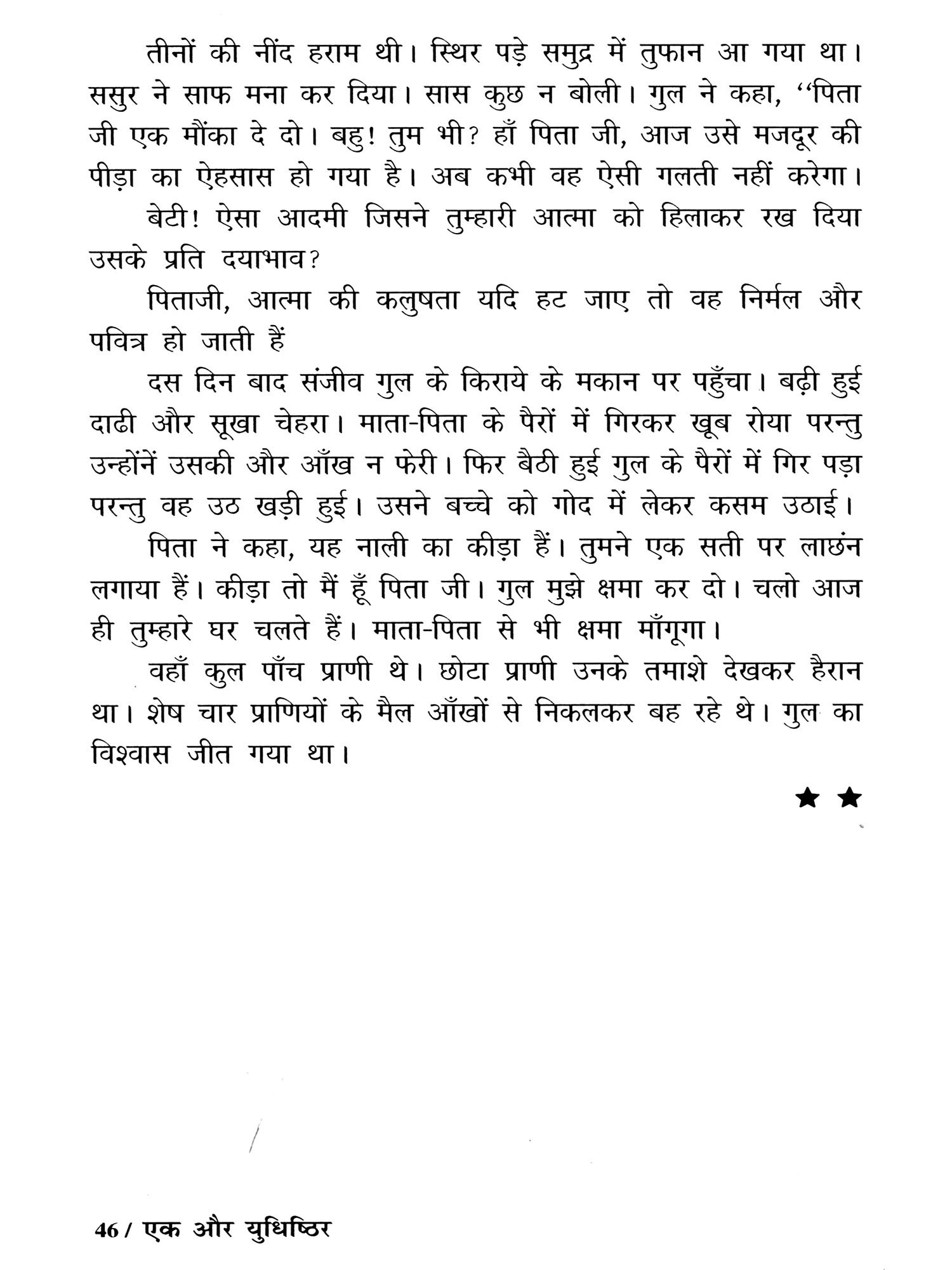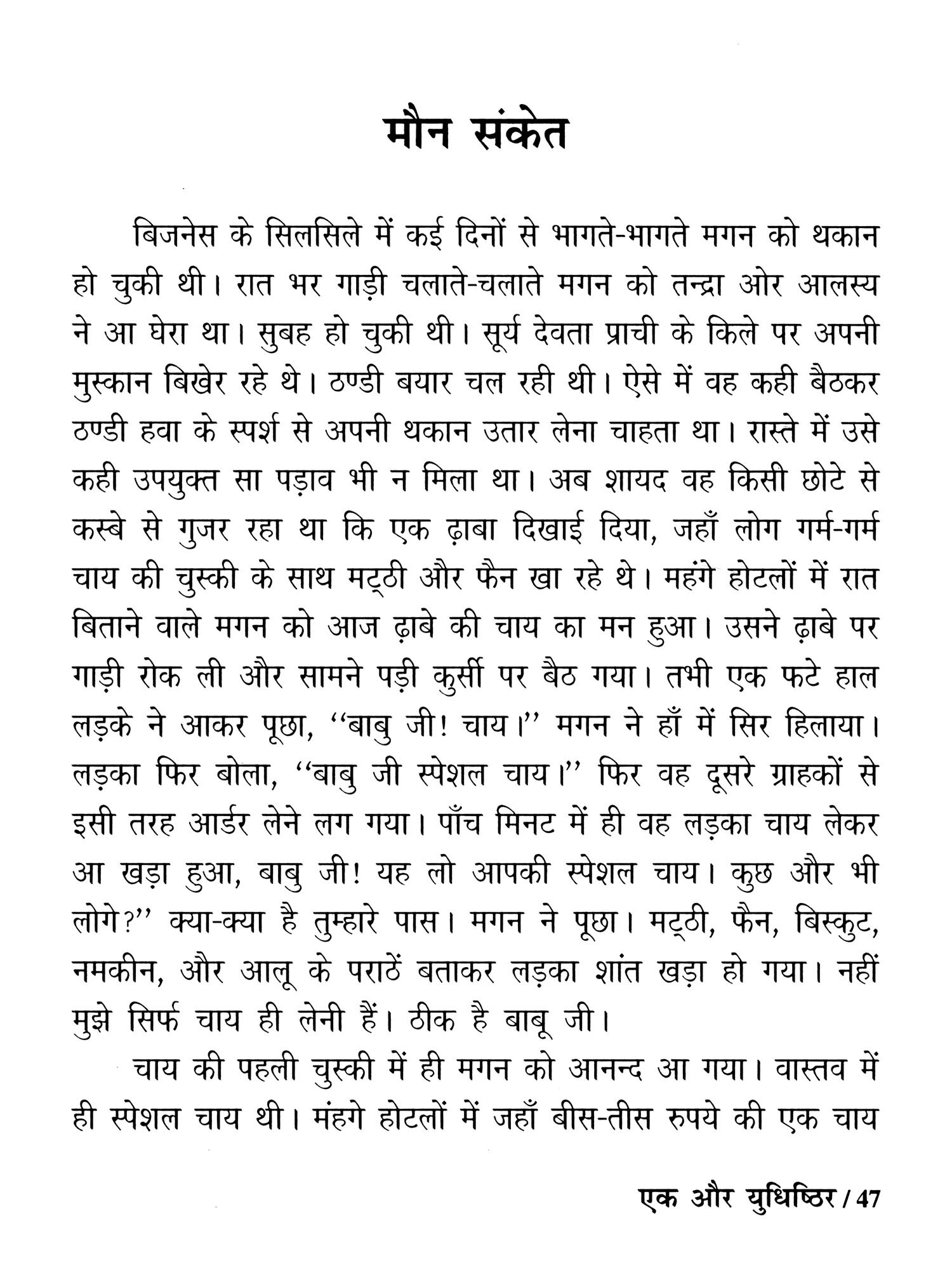 'एक और युधिष्ठिर' कहानी संग्रह पाठकों को समर्पित है। इस संग्रह में सभी कहानियाँ अनुभवों और अनुभूतियों पर आधरित हैं। जिन्हें हम कहानी कहते है वास्तव में वह कोई न कोई घटना होती है जो सम्बन्ध रखती है हमारे दैनिक जीवन से। कथाकार तो मात्र उन्हें शब्दों का रूप देता है।