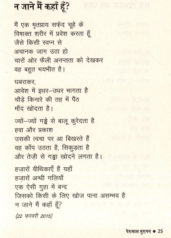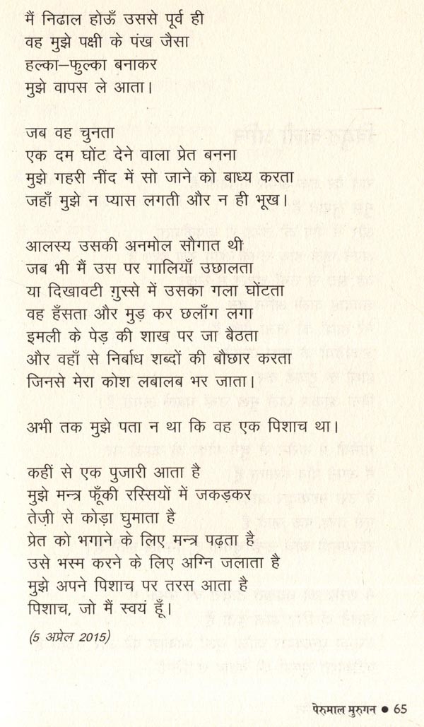पिछले डेढ़ वर्ष जब मैं चैन्नई में था, मेरी मित्रता श्रीनिवास नटराजन से हुई जो एक बहुत ही अच्छे कलाकार और पेंटर हैं। उस अवधि के दौरान उन्होंने अपना उपन्यास विदम्बनम मेरे लिए ही लिखा था। जिस दिन कवि आत्मानम् का श्रद्धांजलि दिवस था उसके दूसरे दिन मैंने कविता कयामत का दिन (6) जुलाई 2016) जो इस संग्रह में सम्मिलित है, लिखी थी। उस दिन हम कुछ मित्रजन मरीना बीच पर इकट्ठे हुए थे। श्रीनिवास ने मुझसे अनुरोध किया कि मैं एक और कविता लिखूँ, कयामत का दिन के बाद की एक नयी कविता। मैंने वैसा ही किया। वह कविता अब उनके उपन्यास का अंग है।